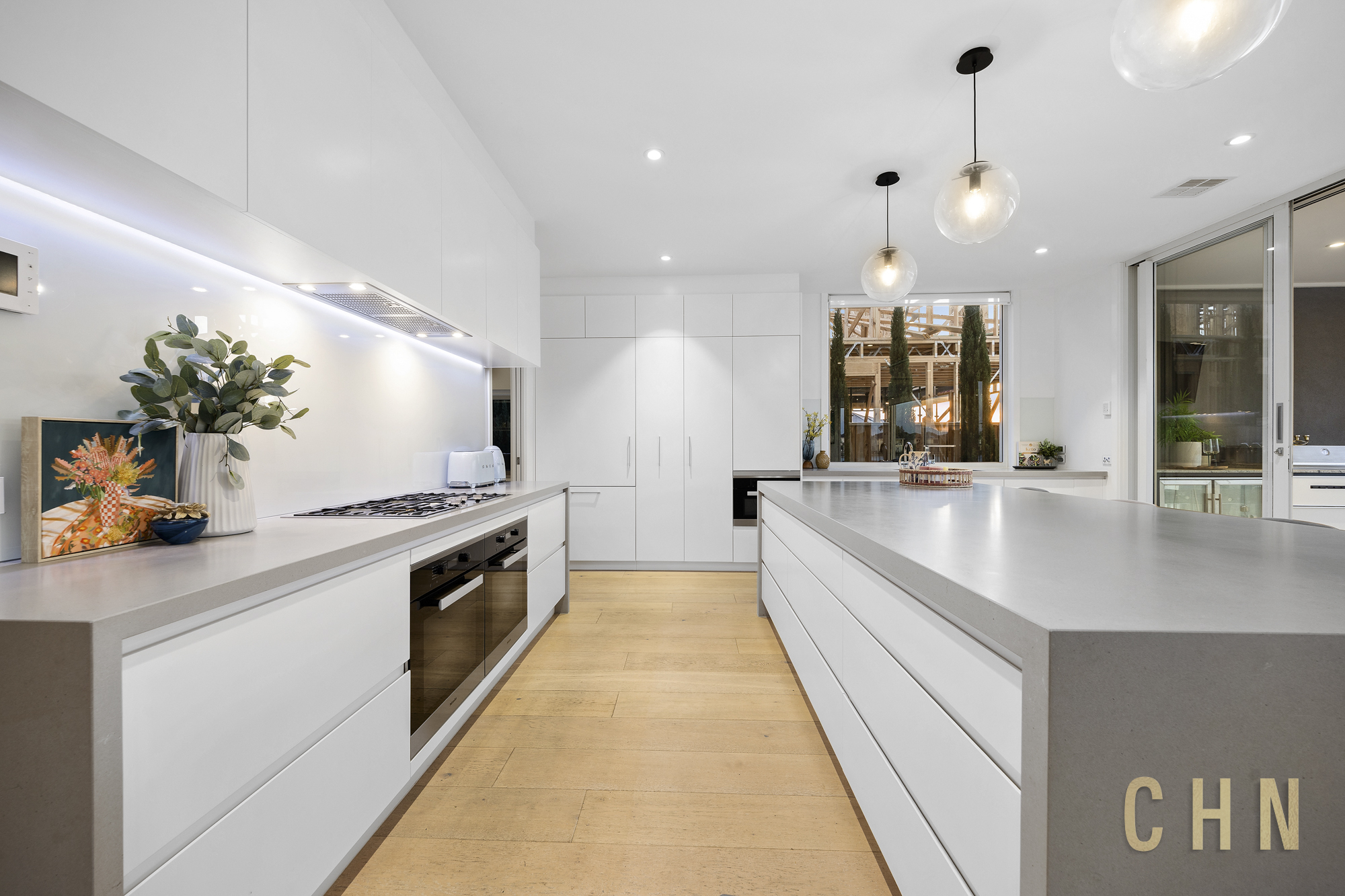 The heart of the home is a chef’s dream kitchen, a masterpiece of both form and function. It features an extra-wide waterfall stone island, a suite of top-tier built-in Miele appliances including a triple oven, plus a fully integrated fridge and freezer, and an abundance of soft-close cabinetry. This culinary command centre is intelligently linked to a sleek, fully-equipped laundry and a vast walk-in pantry with L-shaped storage.