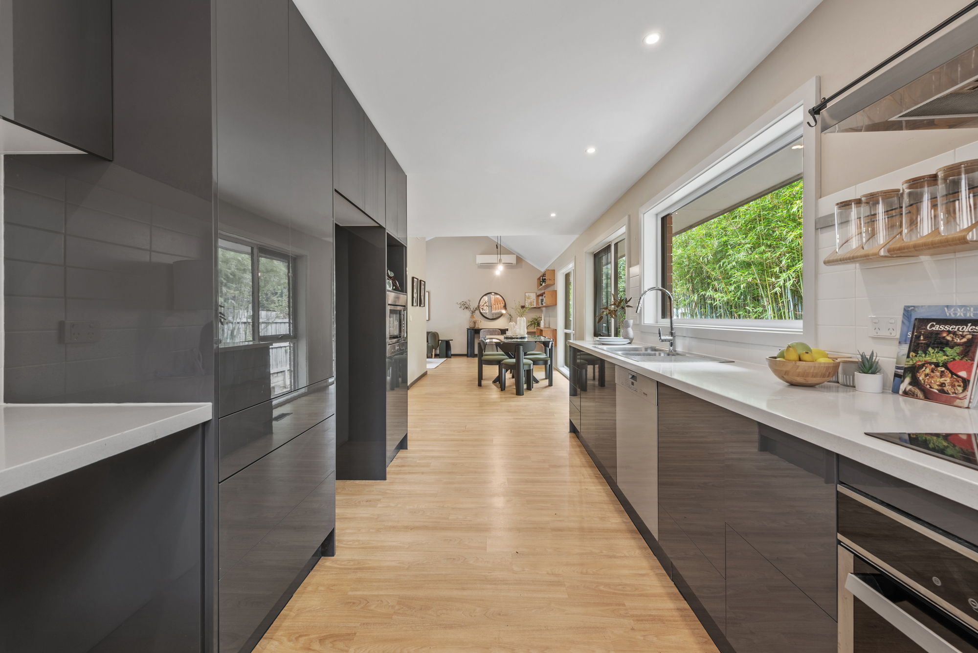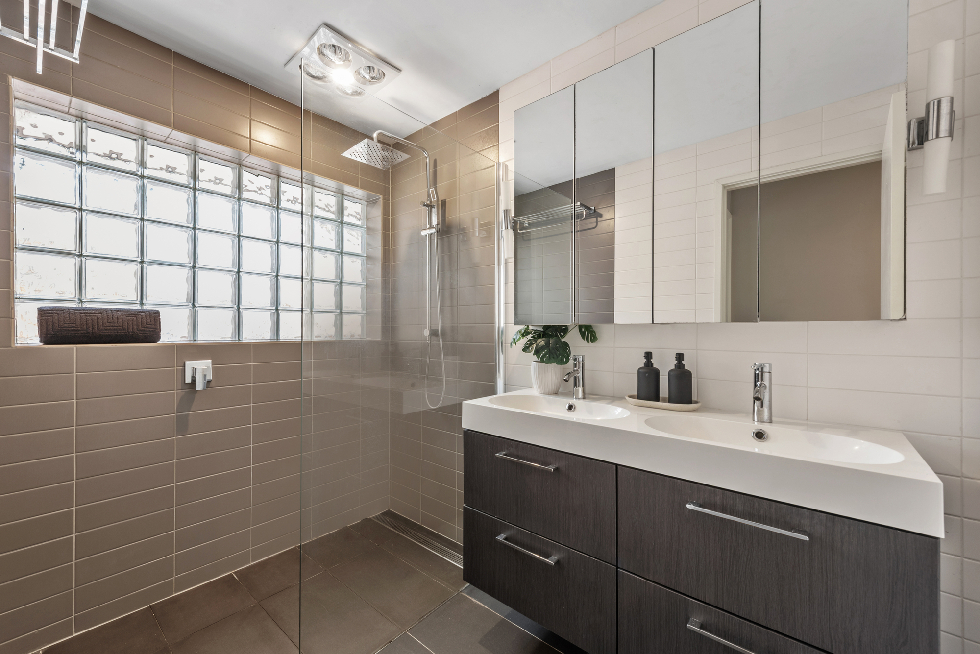 The kitchen features stone benchtops, a Delonghi induction cooktop, built-in microwave, twin sinks, downlights, and direct access to the outdoor area – perfect for everyday functionality. Each bedroom is bathed in natural light, with the master featuring a walk-in wardrobe. The tiled bathroom features a double vanity, shower, and timber cabinetry, with the glass-block window adding a touch of character.