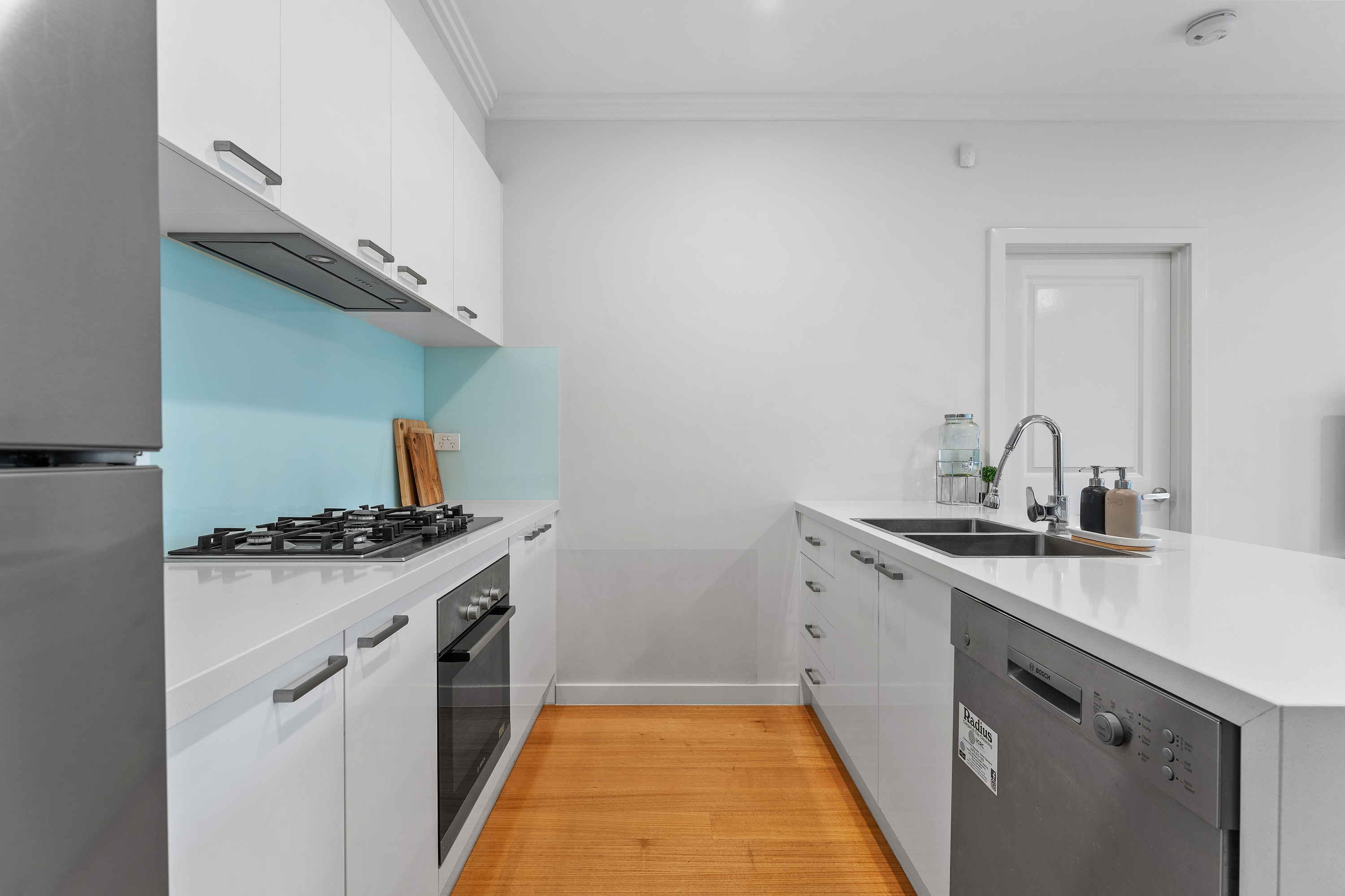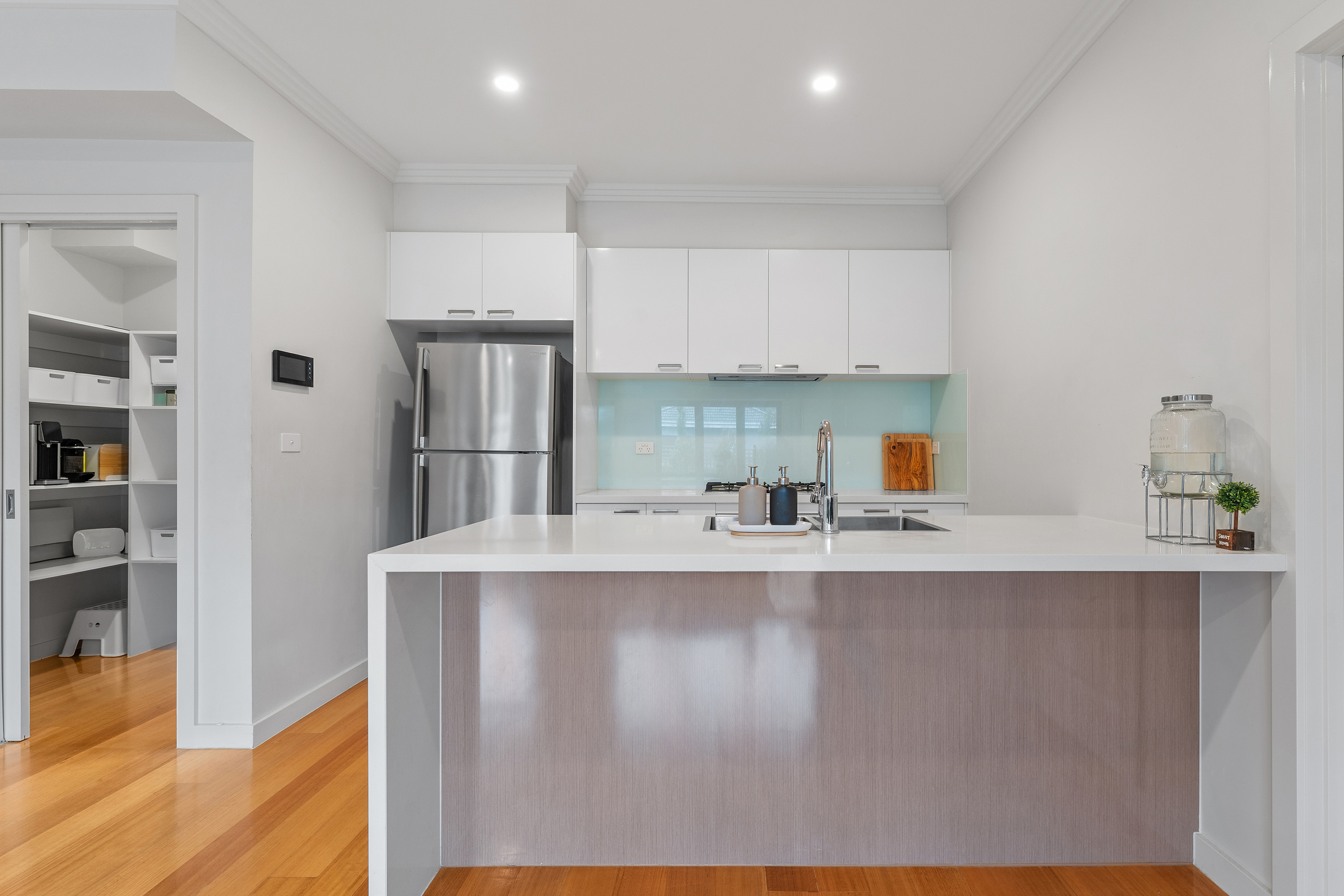 The ground floor features timber flooring throughout the living and dining spaces, while the kitchen is equipped with a five-burner gas stove, an island bench, and extensive over and under storage. Upstairs, carpeted flooring enhances warmth, with a dedicated study area providing flexibility.