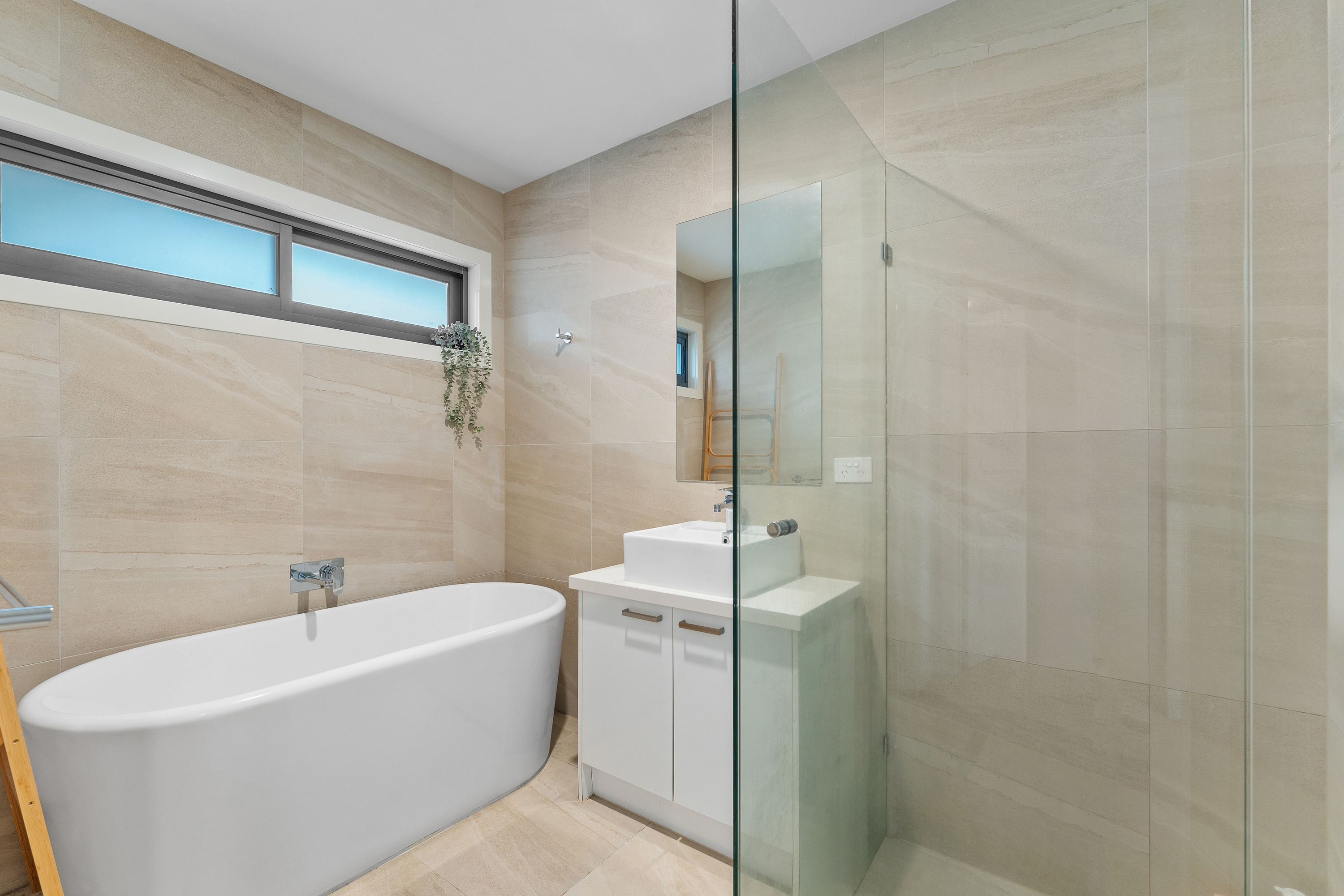 Accommodation includes four bedrooms, each with built-in robes, air conditioning, and carpet. Two bedrooms are complemented by ensuites, while the main upstairs bathroom features a full bathtub and floor-to-ceiling tiles. Additional convenience is provided by a standalone toilet and two powder rooms.