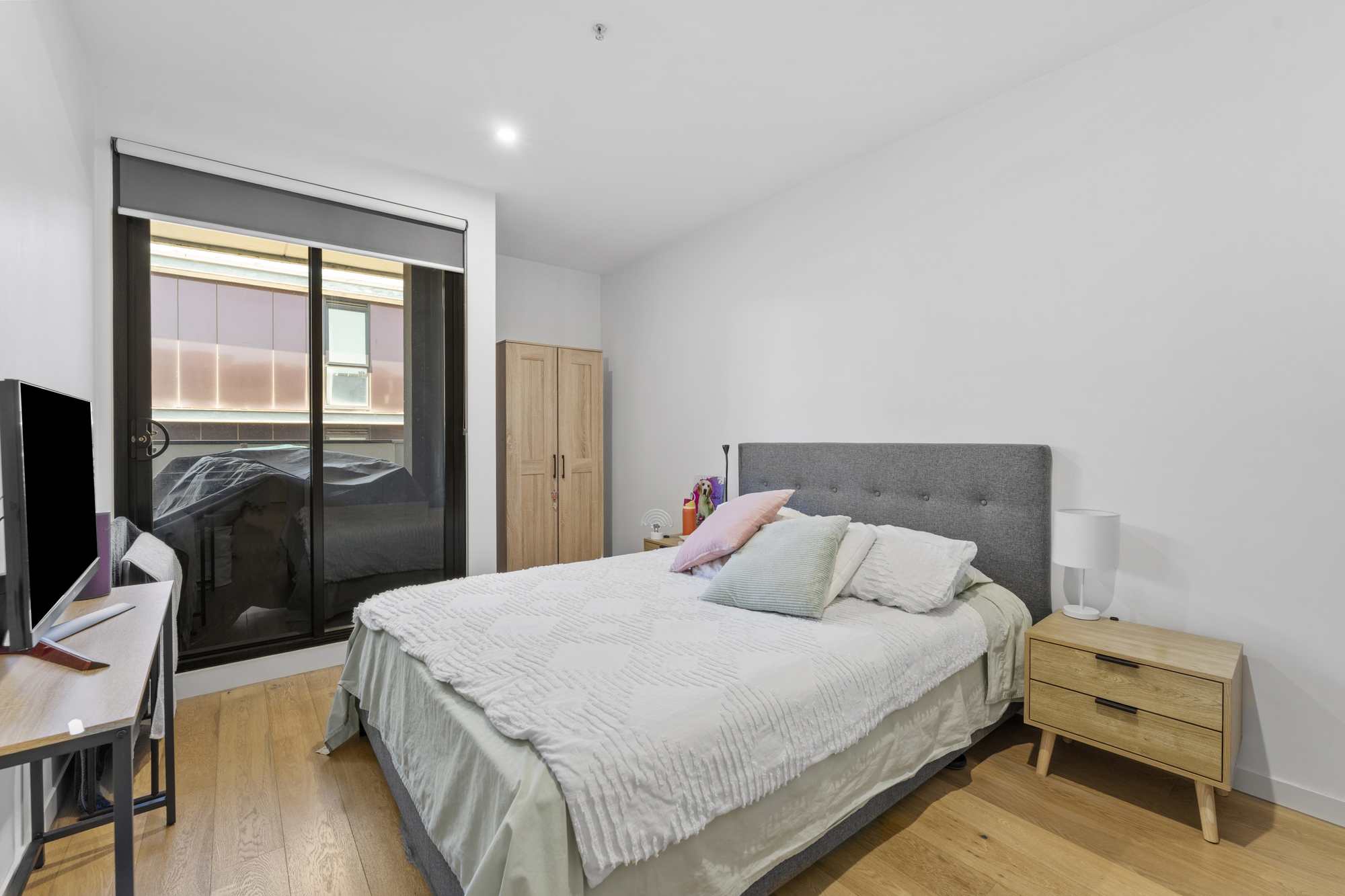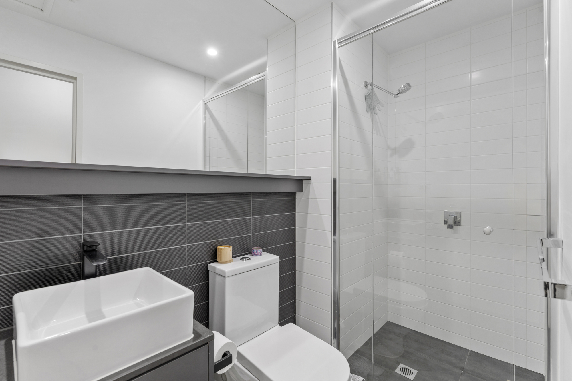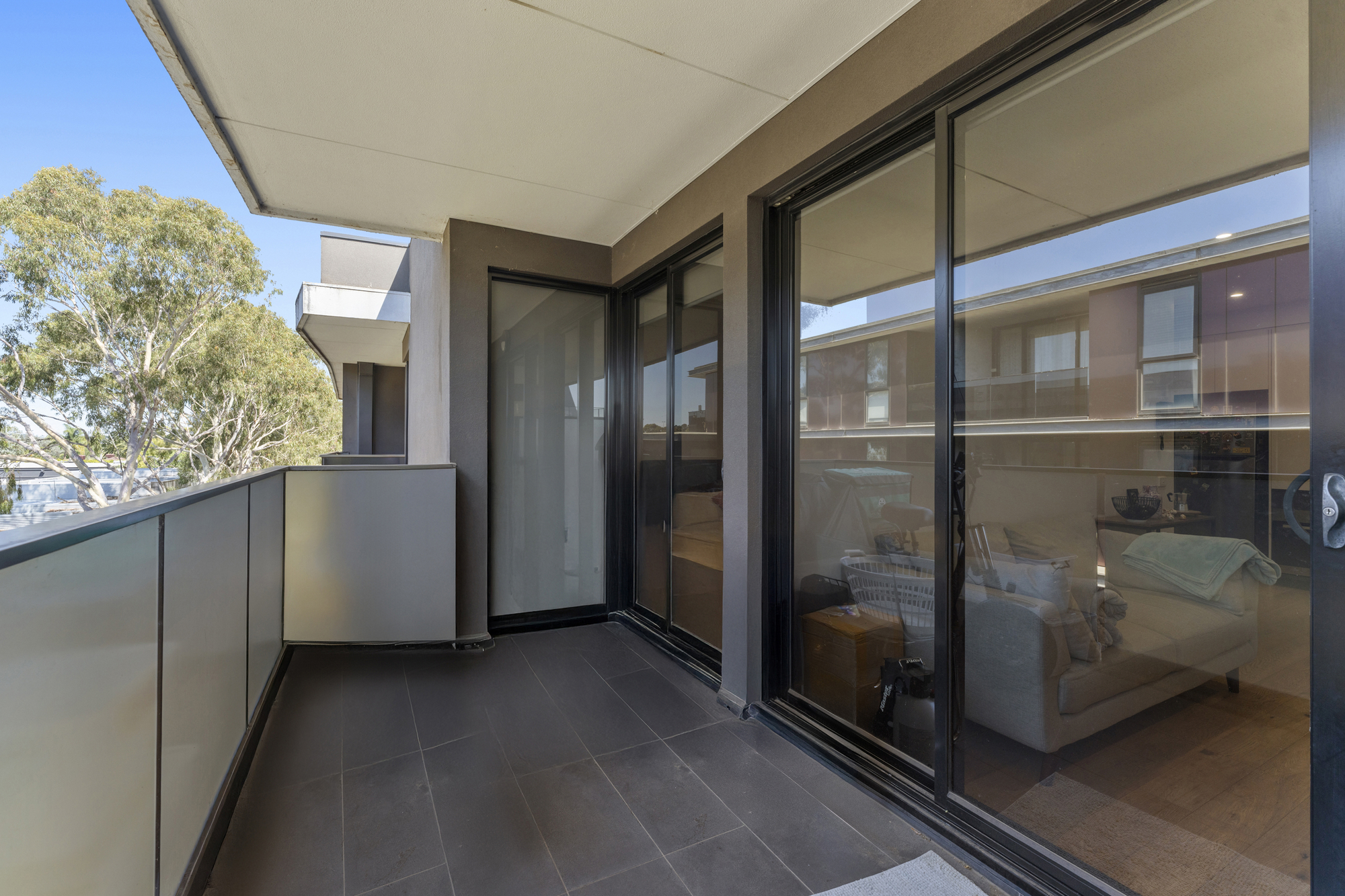 The well-sized bedroom includes built-in robes and plush carpeting, while the bathroom boasts a frameless shower and stylish tiled floors and walls. The apartment also includes a European laundry with a small trough, enhancing the space’s practicality.