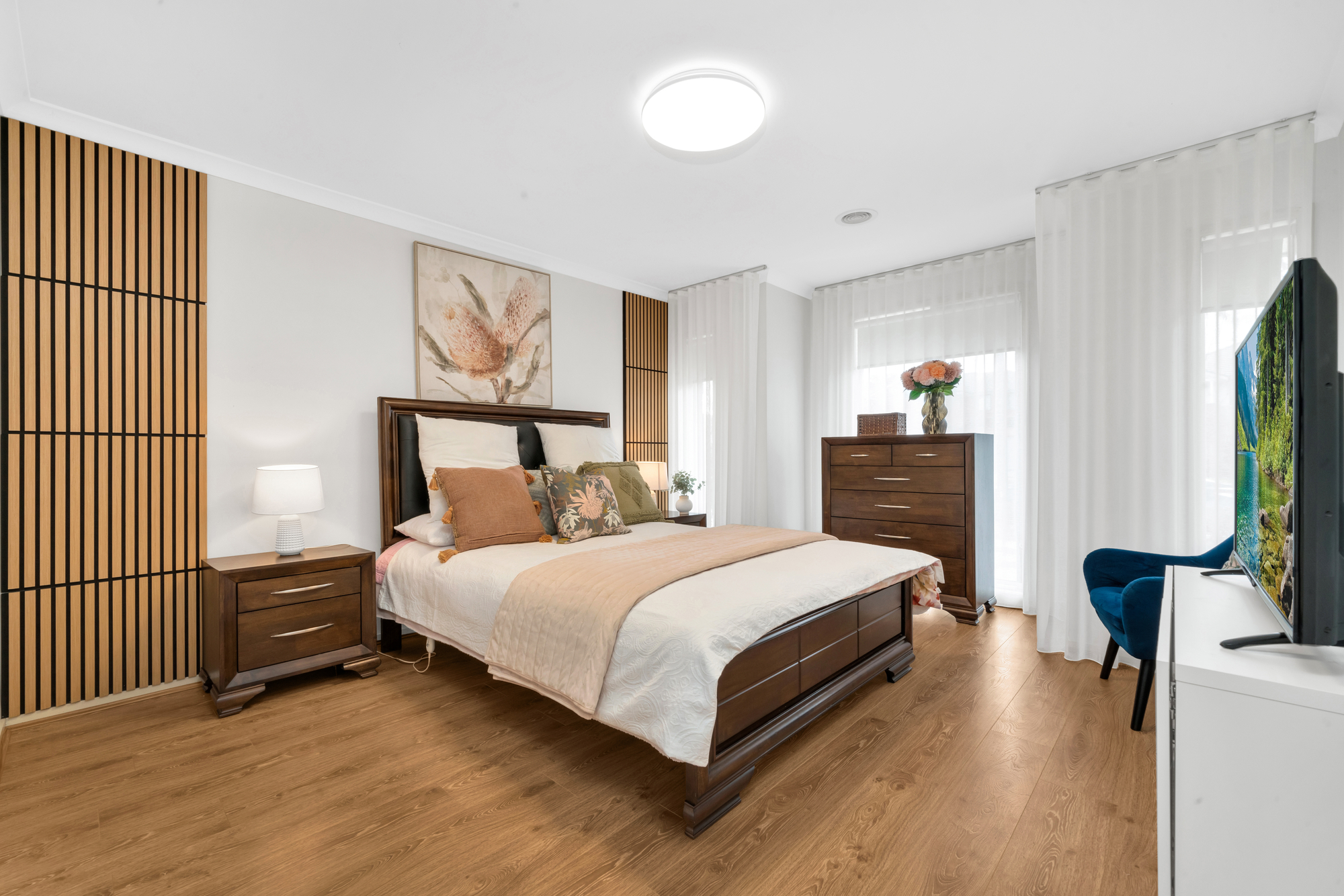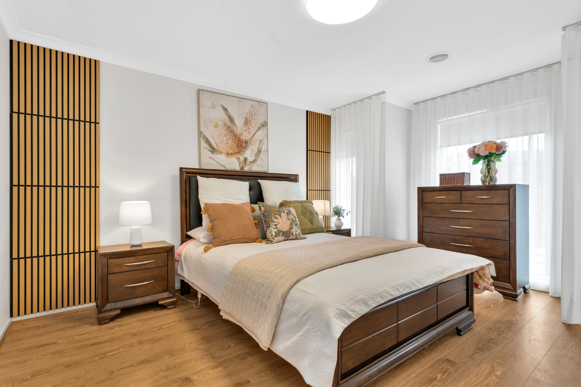 The heart of this home is a gourmet kitchen with stone benchtops, 900mm freestanding gas appliances, and a sprawling island breakfast bar. Top-to-bottom cabinets, tiled splashbacks, and a spacious pantry cater to culinary adventures. Flowing effortlessly outdoors through 3-panel sliding doors, the open-plan living area connects to a low-maintenance backyard paradise featuring a roofed alfresco and wide concrete patio – perfect for year-round gatherings.