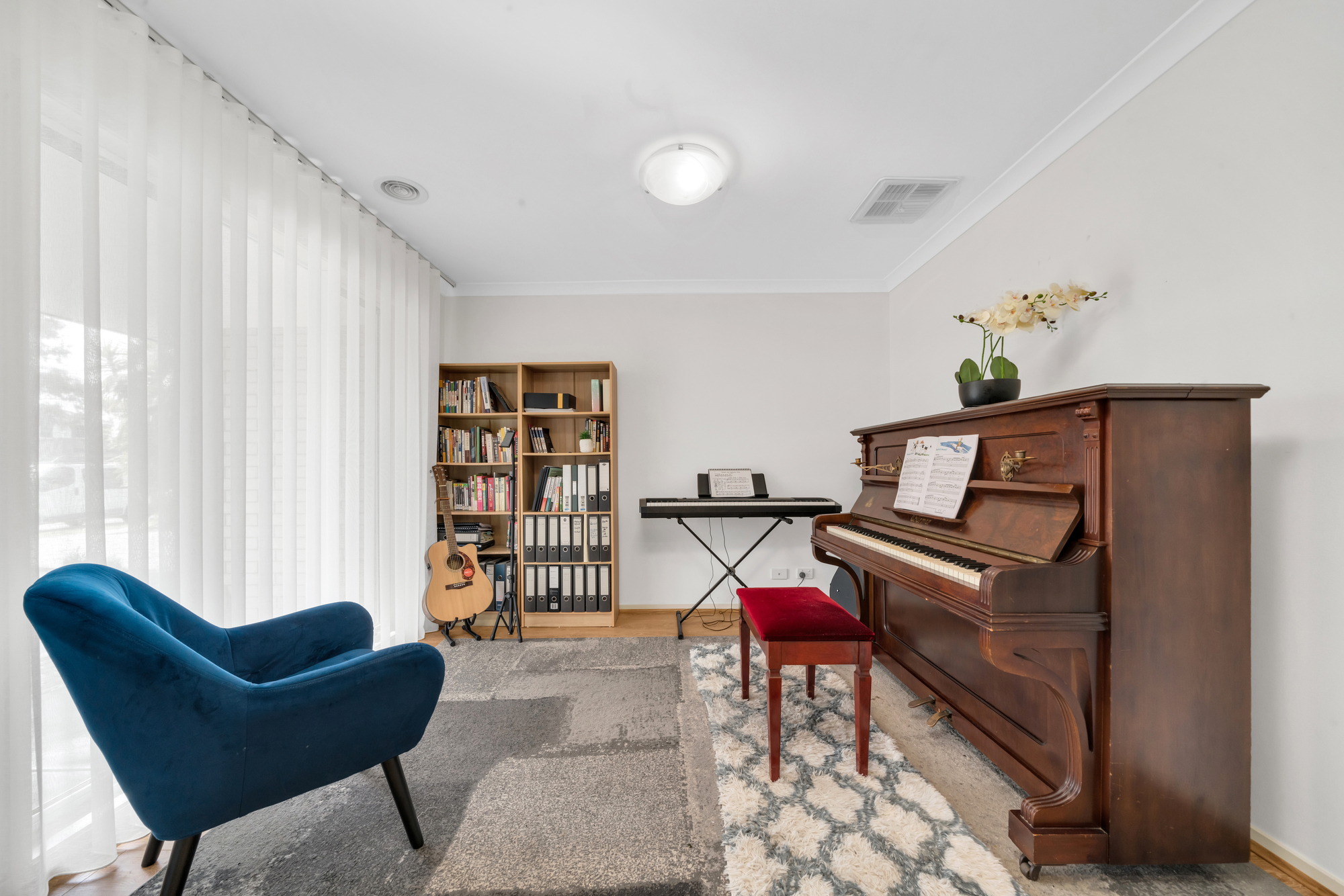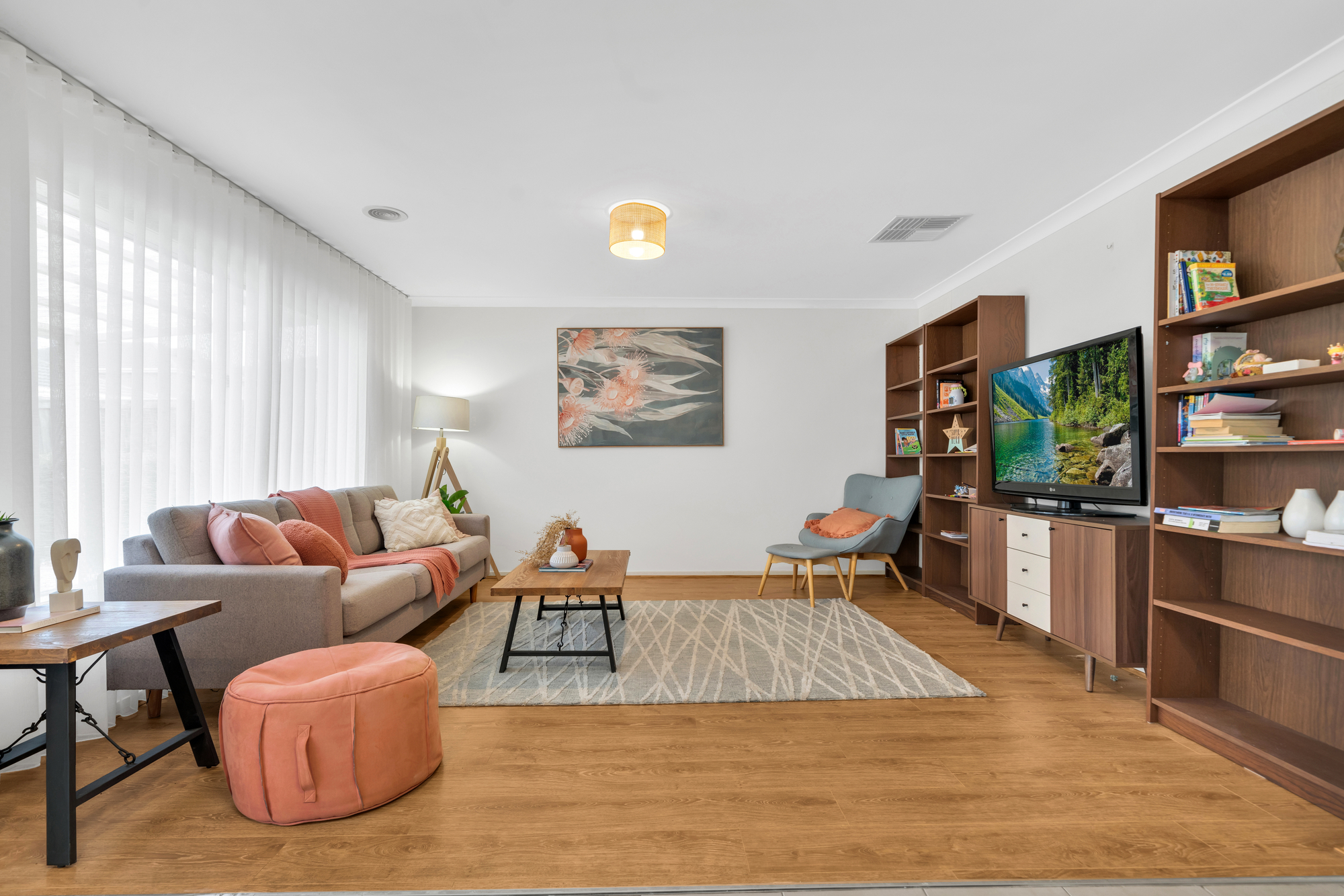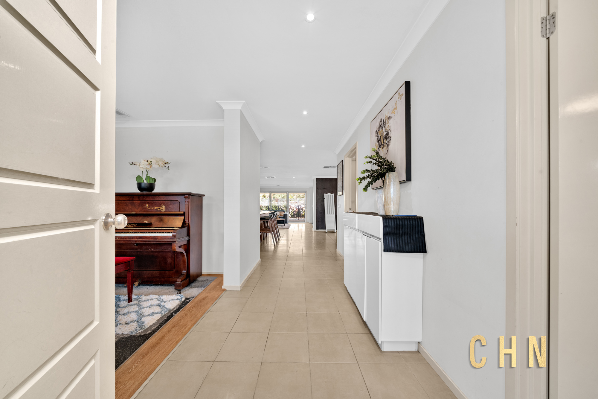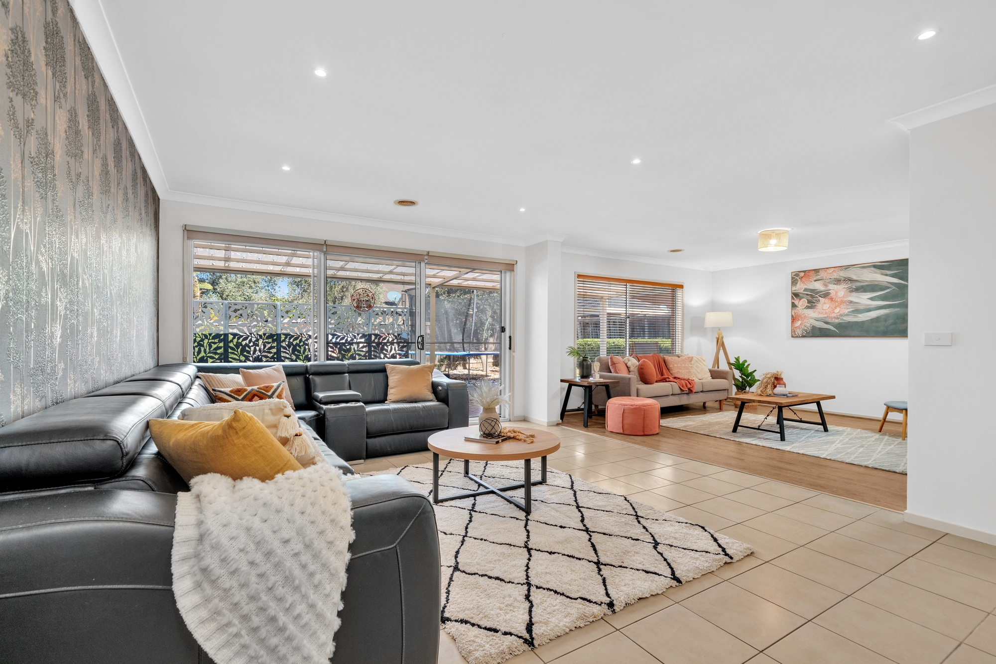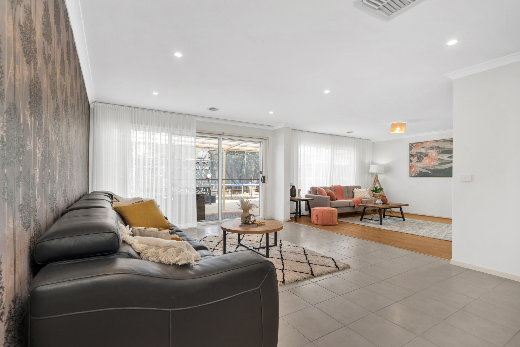 Step into a thoughtfully designed layout featuring four generous sized bedrooms, each with built-in robes, and four versatile living areas tailored for growing families. The master suite is a true retreat, complete with a walk-in robe and lavish ensuite showcasing a stone double vanity, mirrored splashback, and walk-in shower. Sun-drenched interiors blend floorboard elegance with practical tiling, creating warmth throughout.