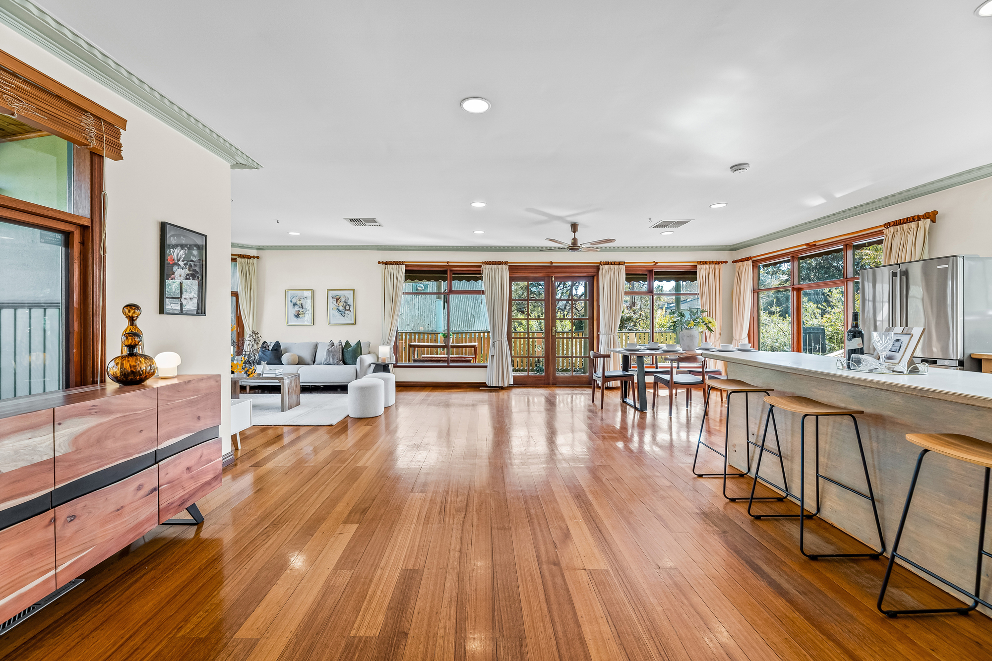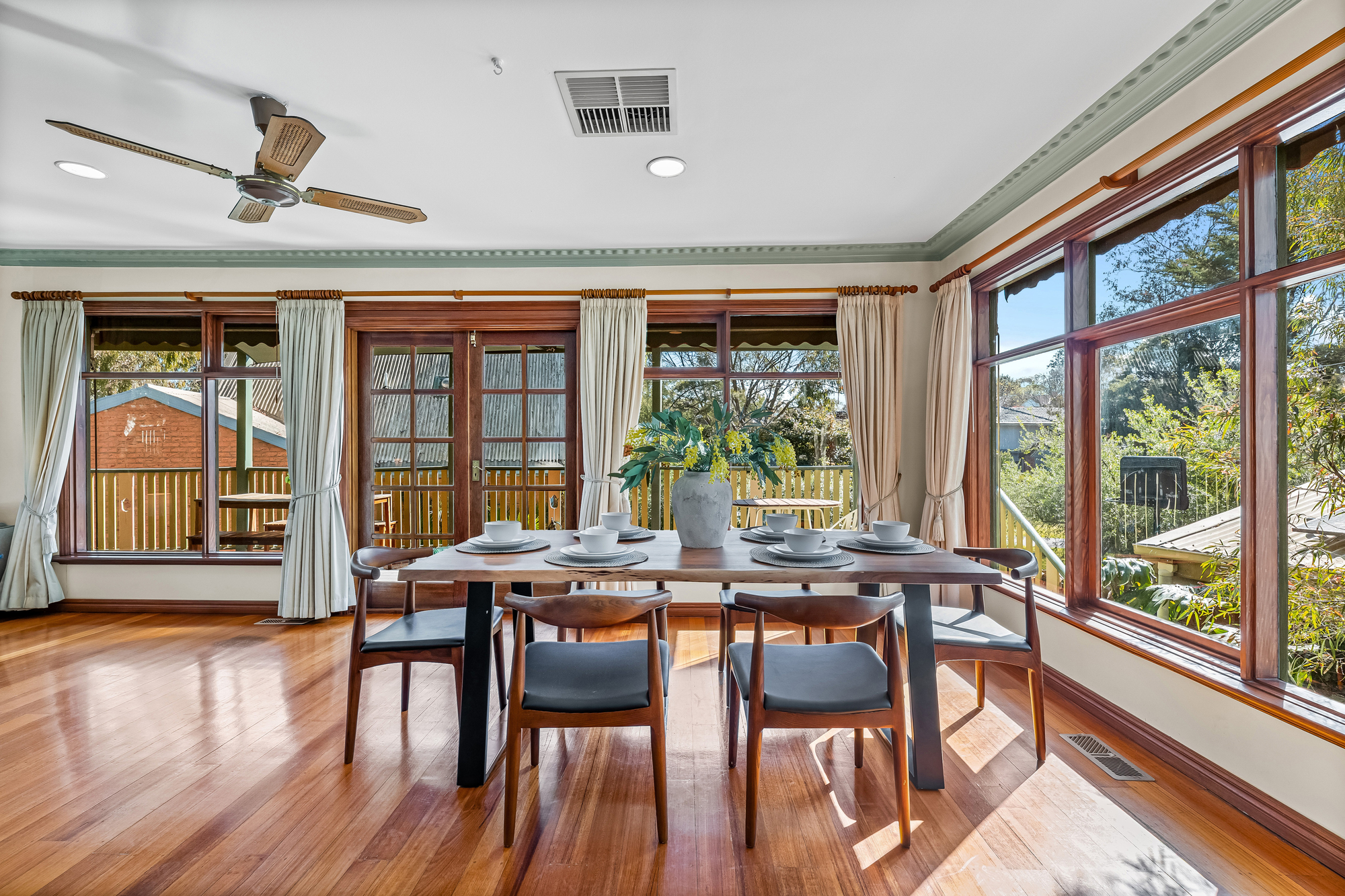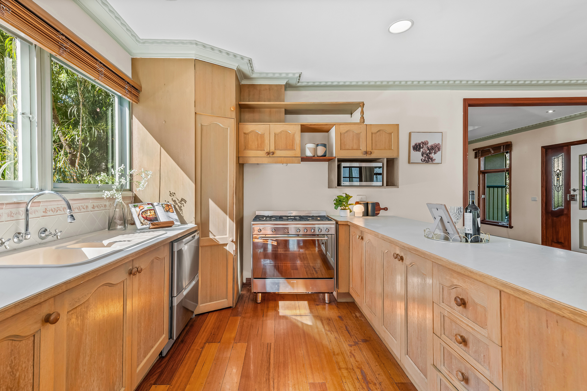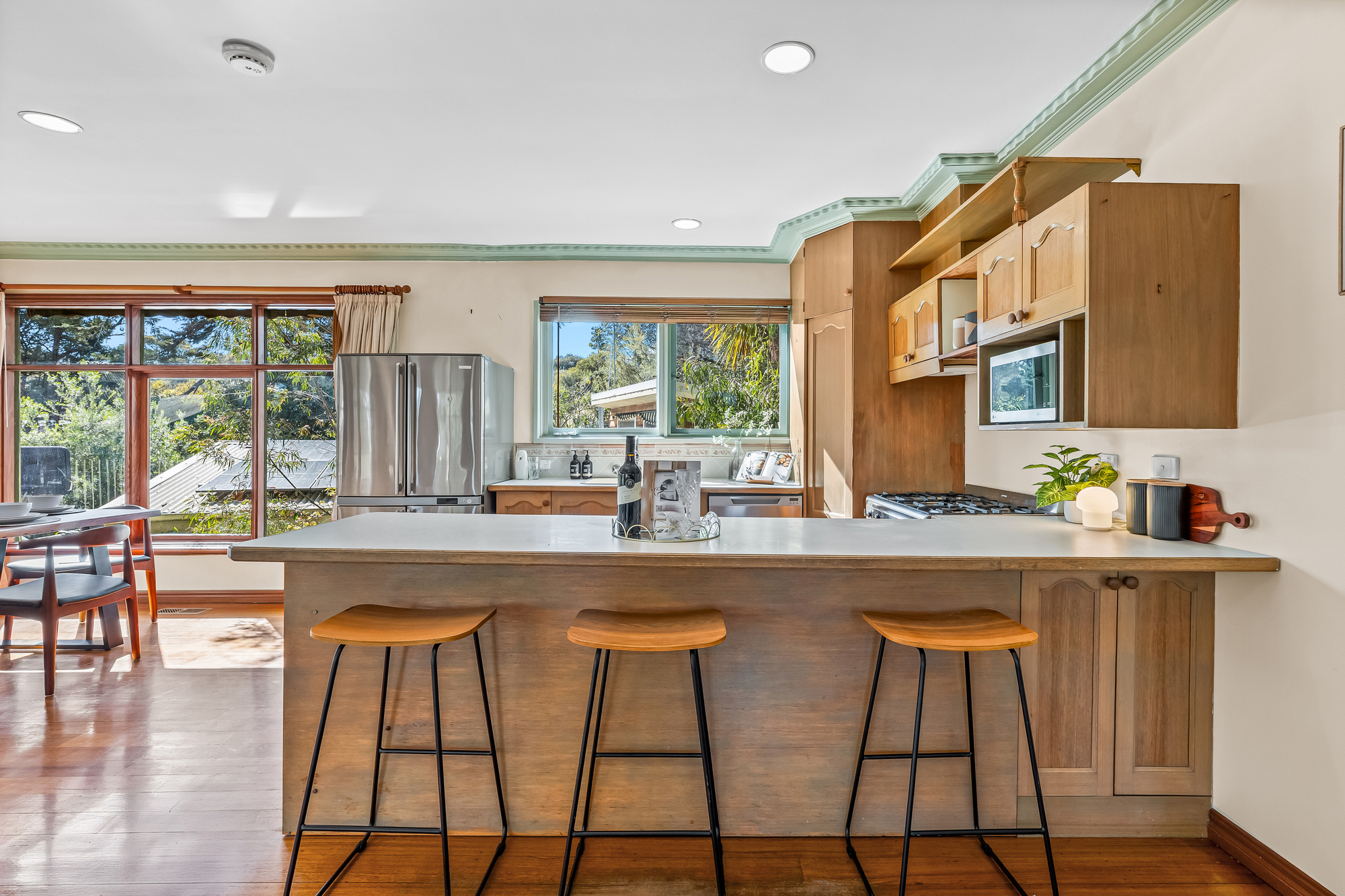 Auction $1,200,000 - $1,300,000Nestled in nature yet convenient to everything the city offers, this character weatherboard home sits in a quiet, family-friendly street and provides warm, light-filled easy living across two levels. Featuring five bedrooms, two bathrooms, and multiple living zones, it’s ideal for families, including multi-generational living. The large open-plan living and kitchen area showcases timber floorboards, a bay window, and French doors opening onto a spacious balcony—perfect for relaxing or entertaining. The kitchen includes a Fisher & Paykel DishDrawer, freestanding SMEG oven with gas burners, double sink, laminate benchtops, and plenty of under and overhead storage. A generous island bench seats four, creating a welcoming hub for family meals and conversation.