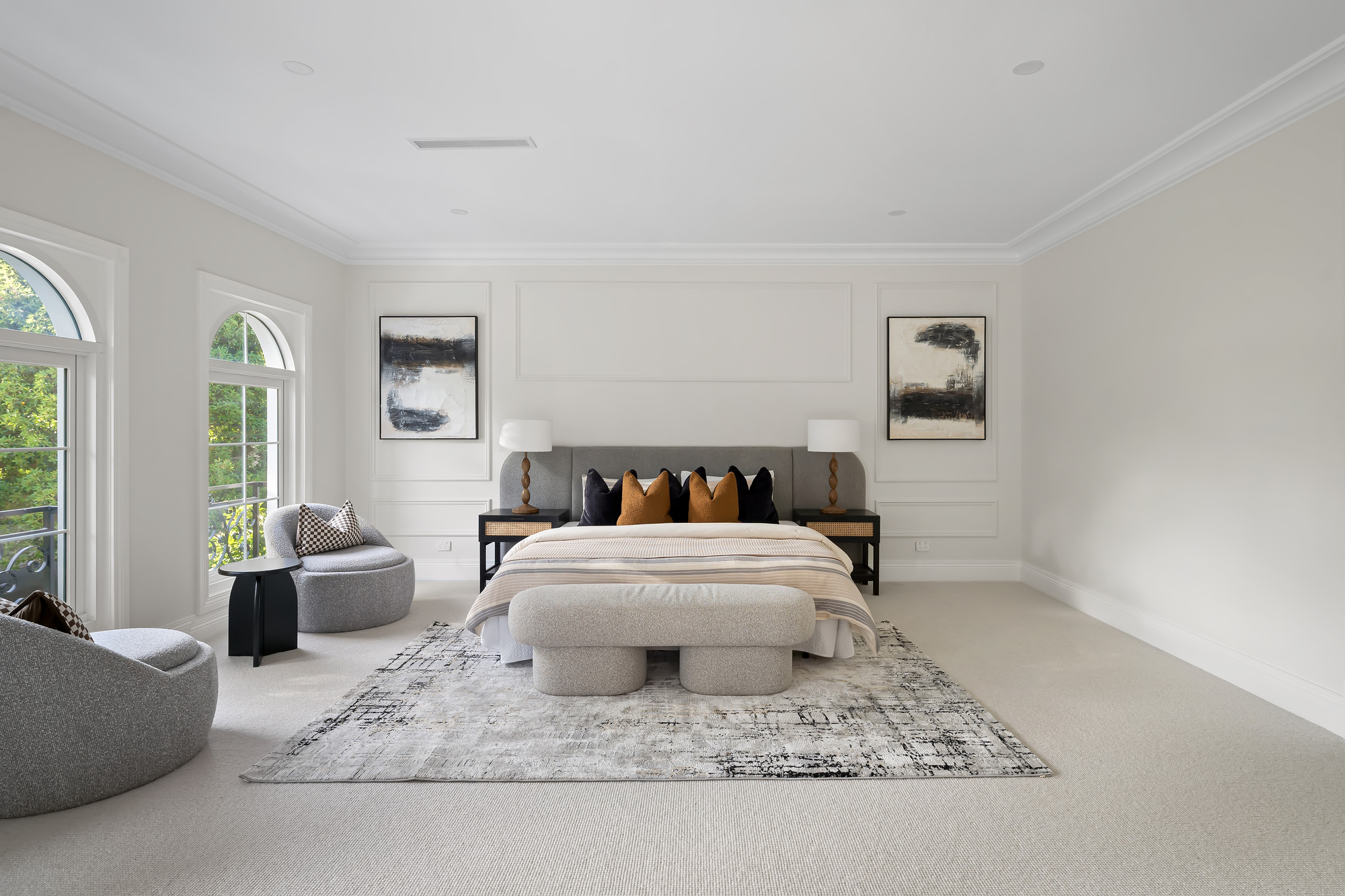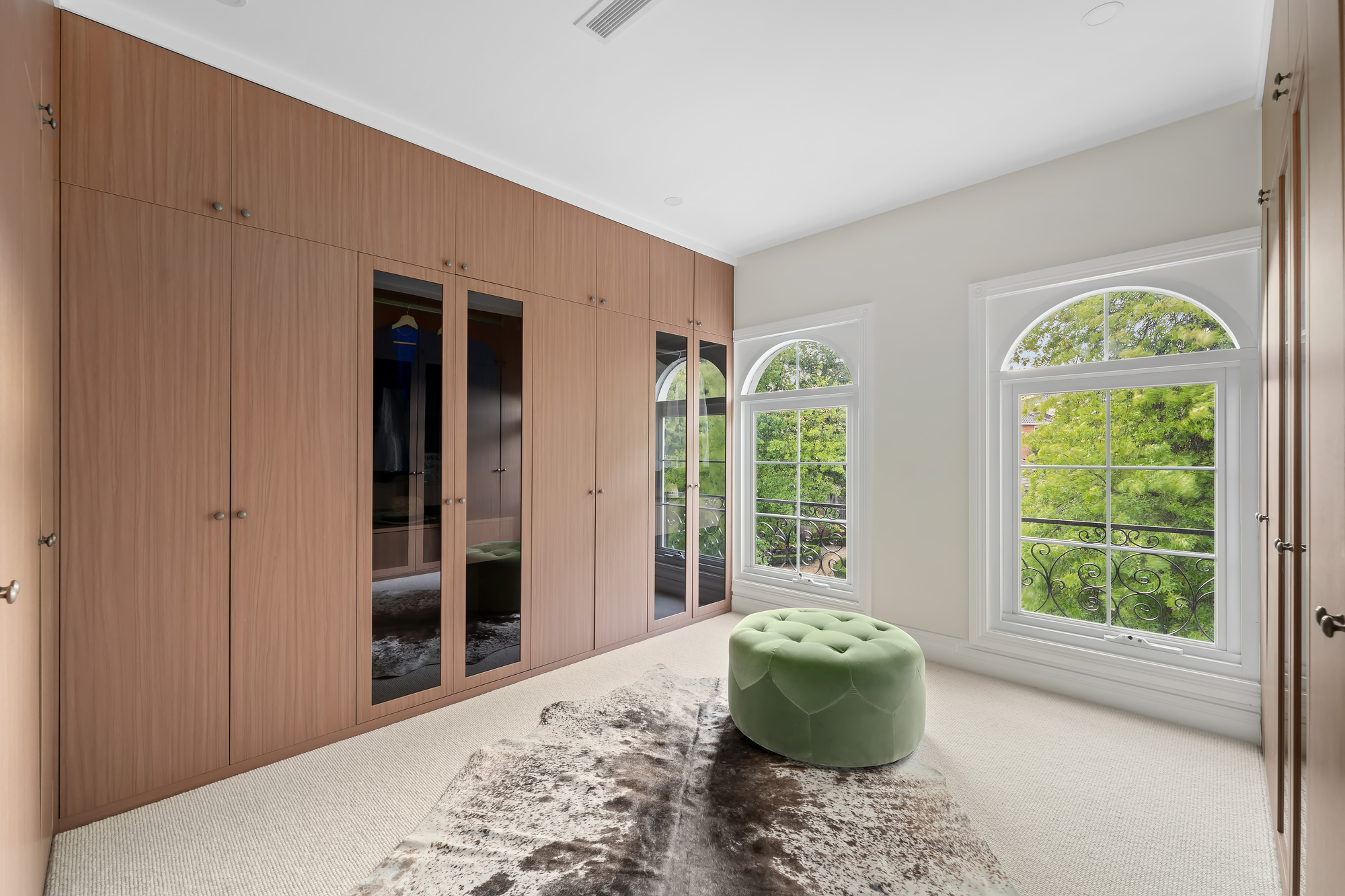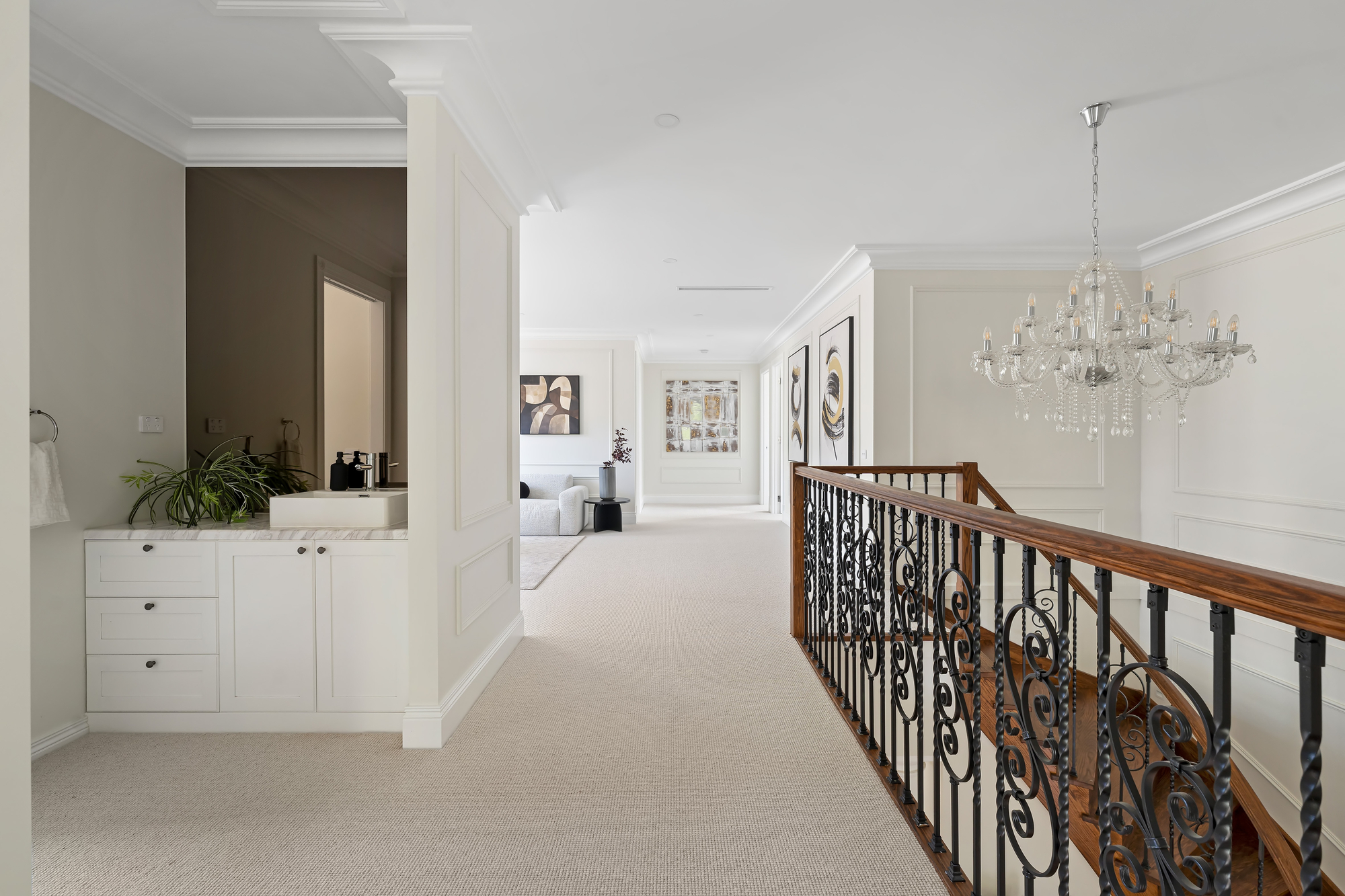 The bedroom layout has also been carefully curated to offer optimal liveability. The beautiful ground floor bedroom features an ensuite-effect connection with the impressive bathroom on this level. Upstairs, a smart study nook and sprawling sitting room with plush carpet branch to further family bedrooms each with their own walk-in robe and luxurious ensuite. The jewel that sits atop the crown of this incredible home is the magnificent main bedroom adorned with 2 dressing rooms, a spa-like ensuite with soaking tub, and French doors to a private balcony. High quality finishing includes all pipes are fully insulated for sound.