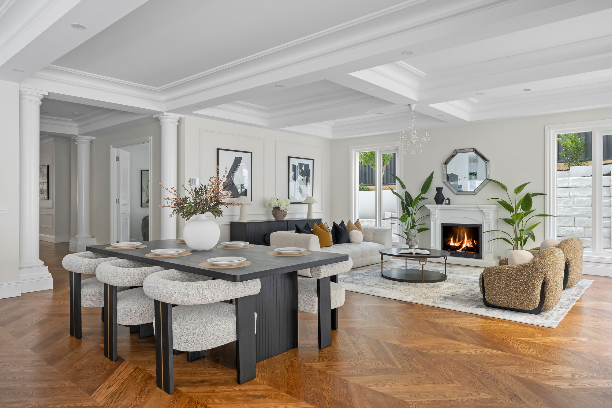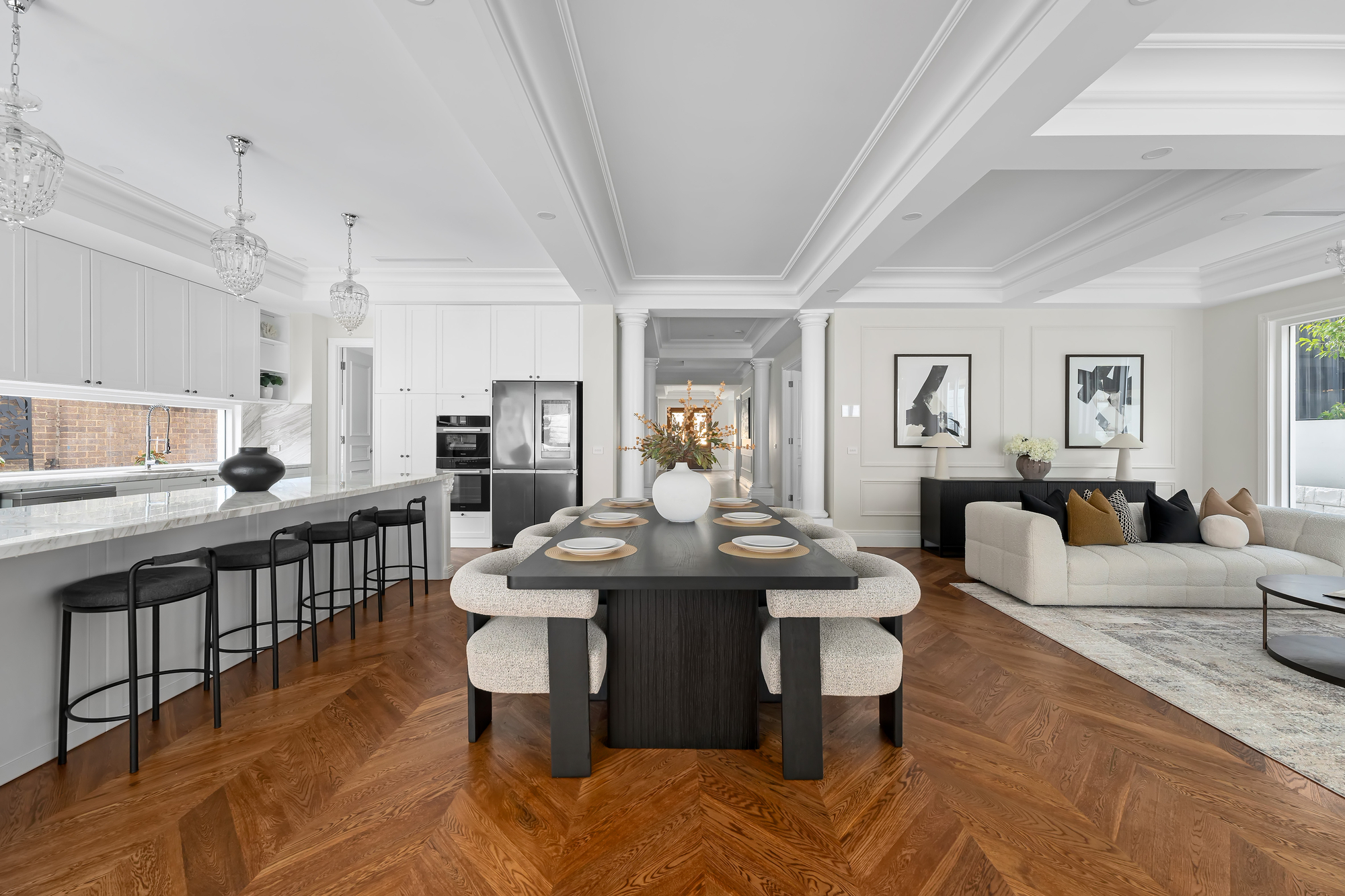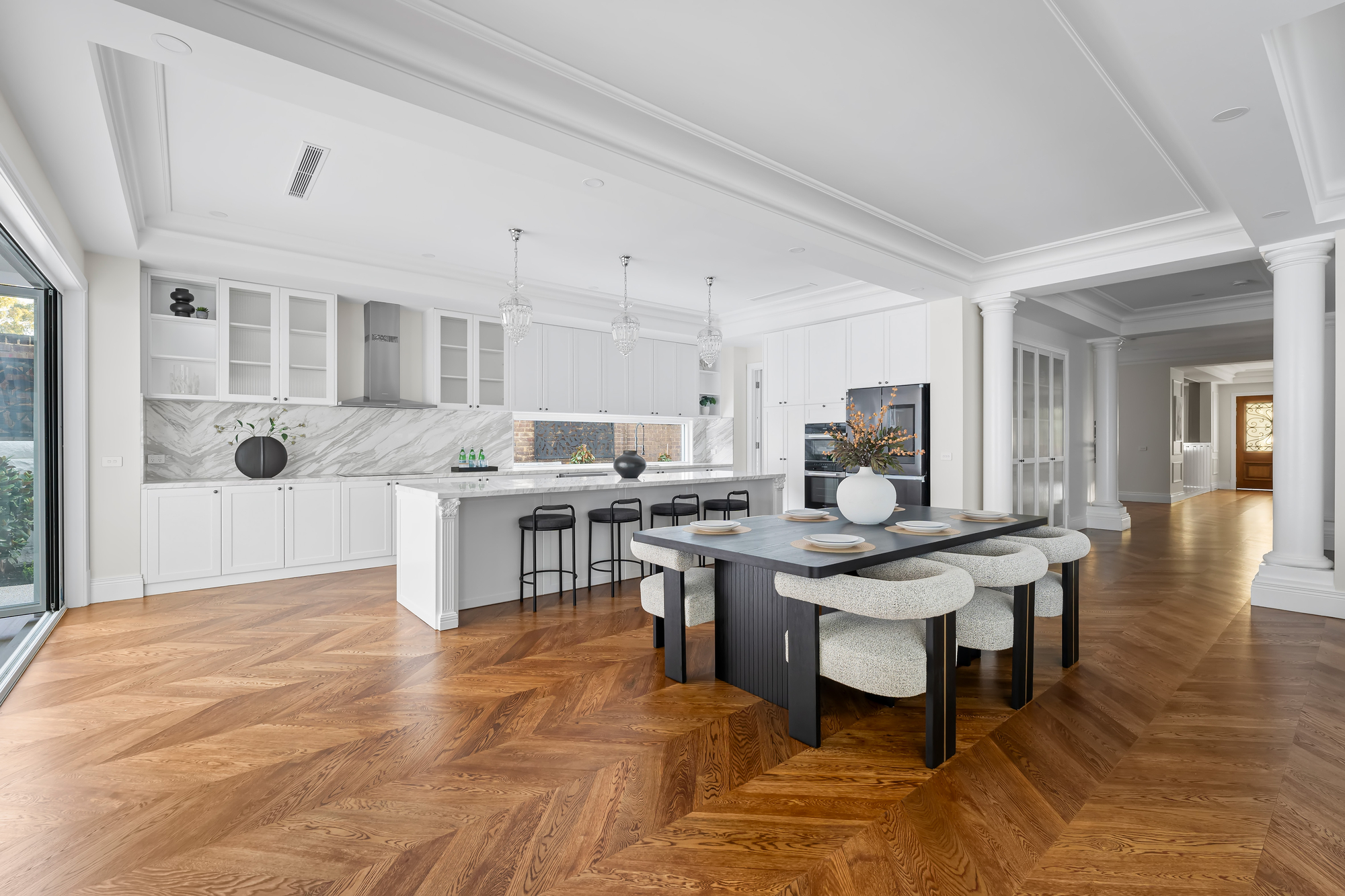The interior of this incredible dwelling is a feast for the senses. Revel in rich chevron flooring, solid timber doors, wall mouldings, coffered ceilings, bespoke cabinetry, and a sweeping central staircase that reflects the seamless, considered connection felt throughout. The entry level boasts 3 unique living areas, including the open concept zone that spills out to the covered alfresco. Comprising the lounge with gas log fire, dining area with garden outlooks, and show-stopping kitchen with marble benchtops, crystal lighting, high-end appliances, and an expansive island, this space evokes a refined yet inviting feel. The second (butler) kitchen with walk-in pantry enables discrete cooking and minimal cleaning.