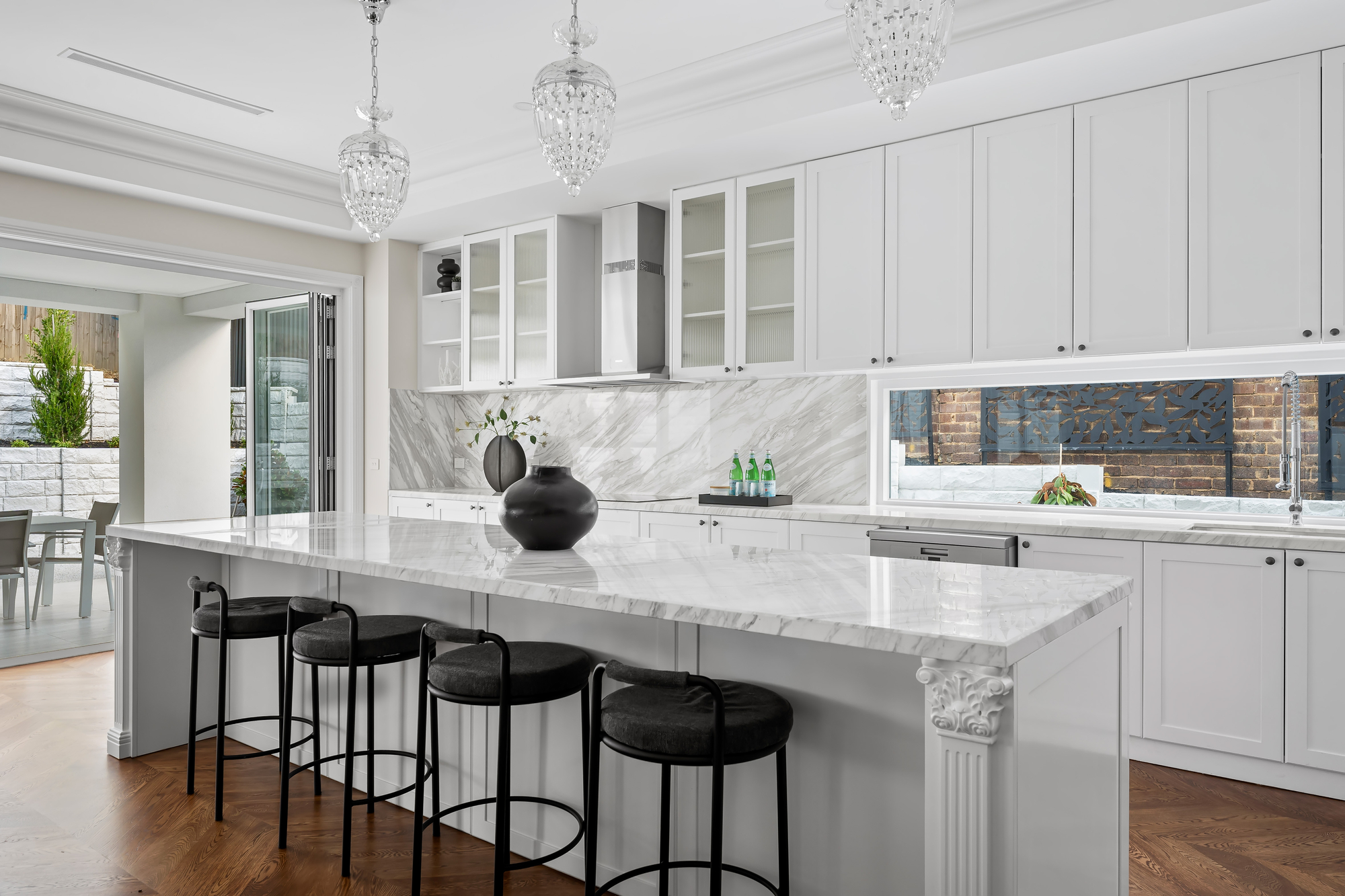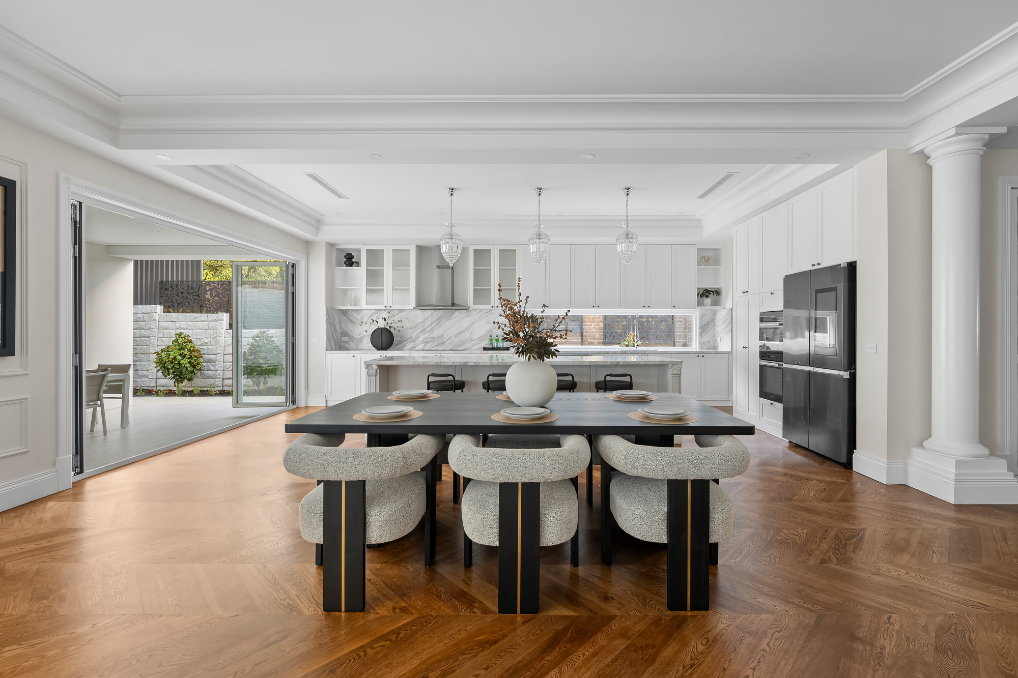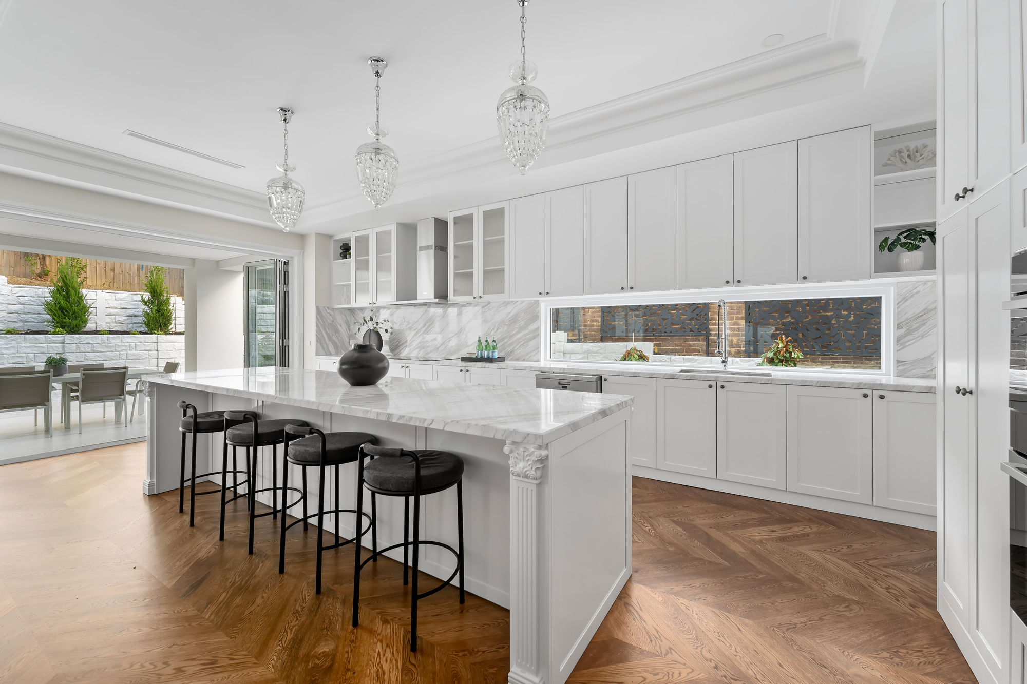 The interior of this incredible dwelling is a feast for the senses. Revel in rich chevron flooring, solid timber doors, wall mouldings, coffered ceilings, bespoke cabinetry, and a sweeping central staircase that reflects the seamless, considered connection felt throughout. The entry level boasts 3 unique living areas, including the open concept zone that spills out to the covered alfresco. Comprising the lounge with gas log fire, dining area with garden outlooks, and show-stopping kitchen with marble benchtops, crystal lighting, high-end appliances, and an expansive island, this space evokes a refined yet inviting feel. The second (butler) kitchen with walk-in pantry enables discrete cooking and minimal cleaning.