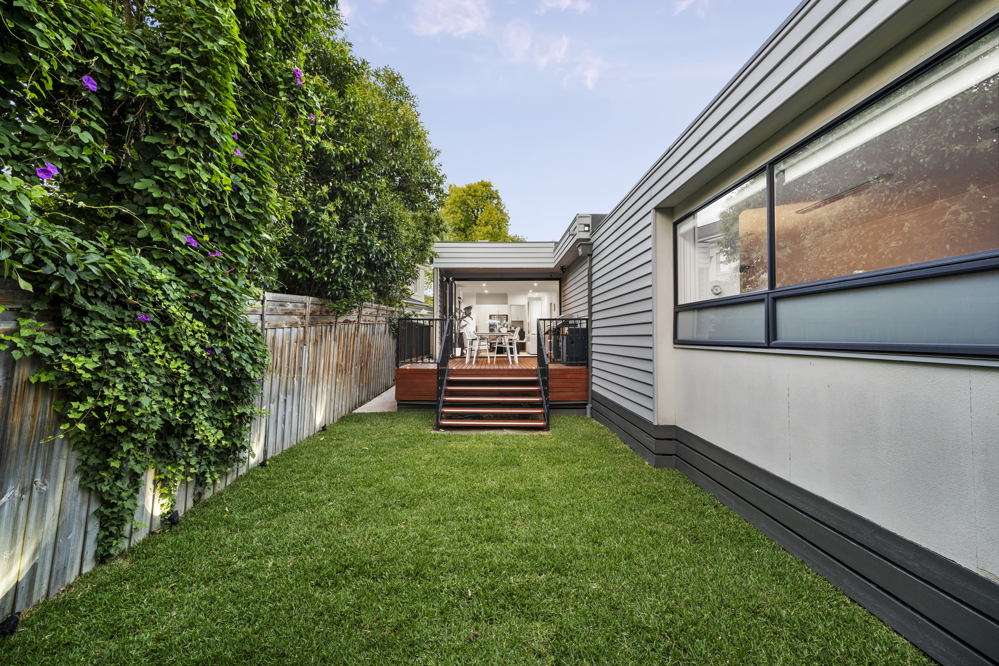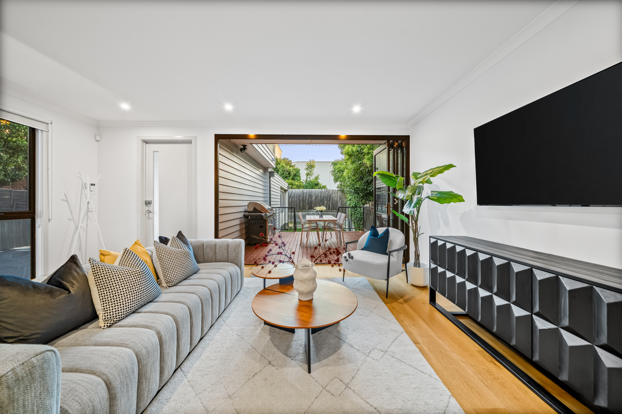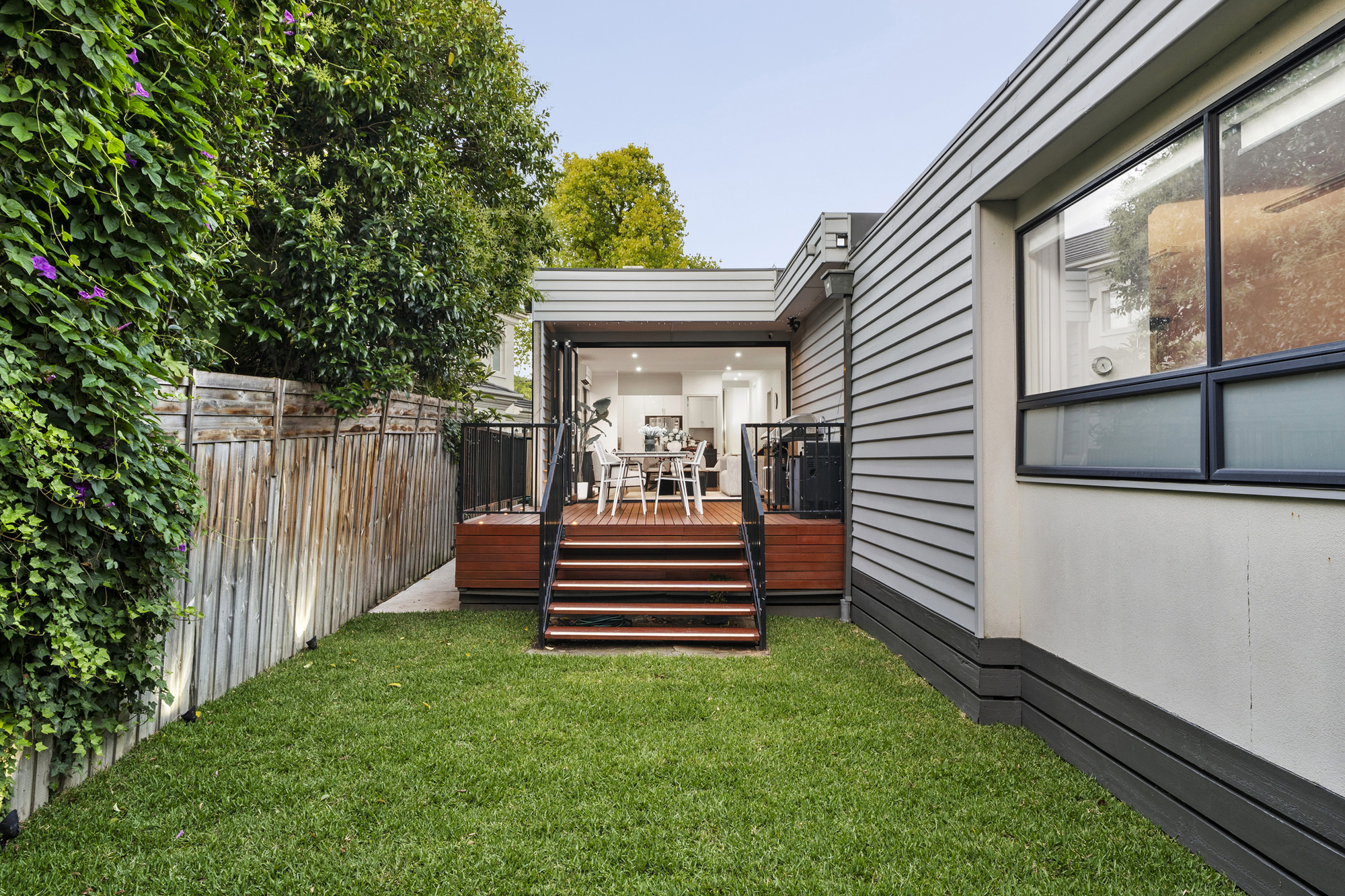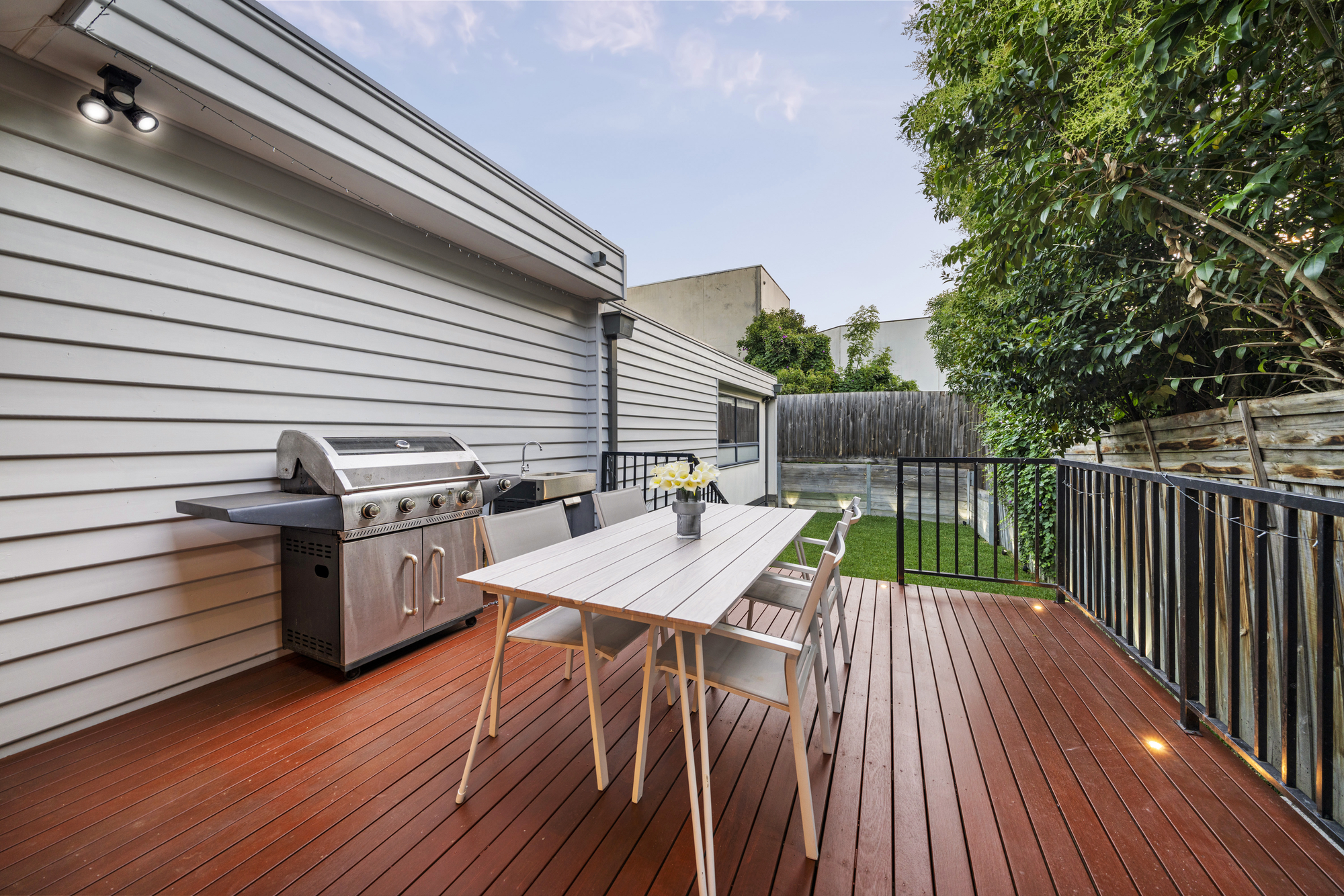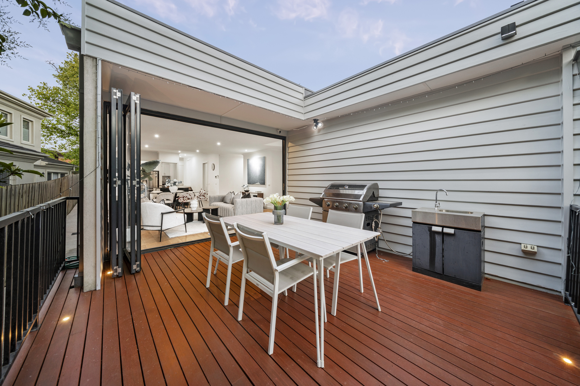 Outdoor living is enhanced by an elevated timber entertaining deck with built-in BBQ, landscaped gardens, ambient lighting and a fully fenced backyard with lawn, ideal for families and pets.