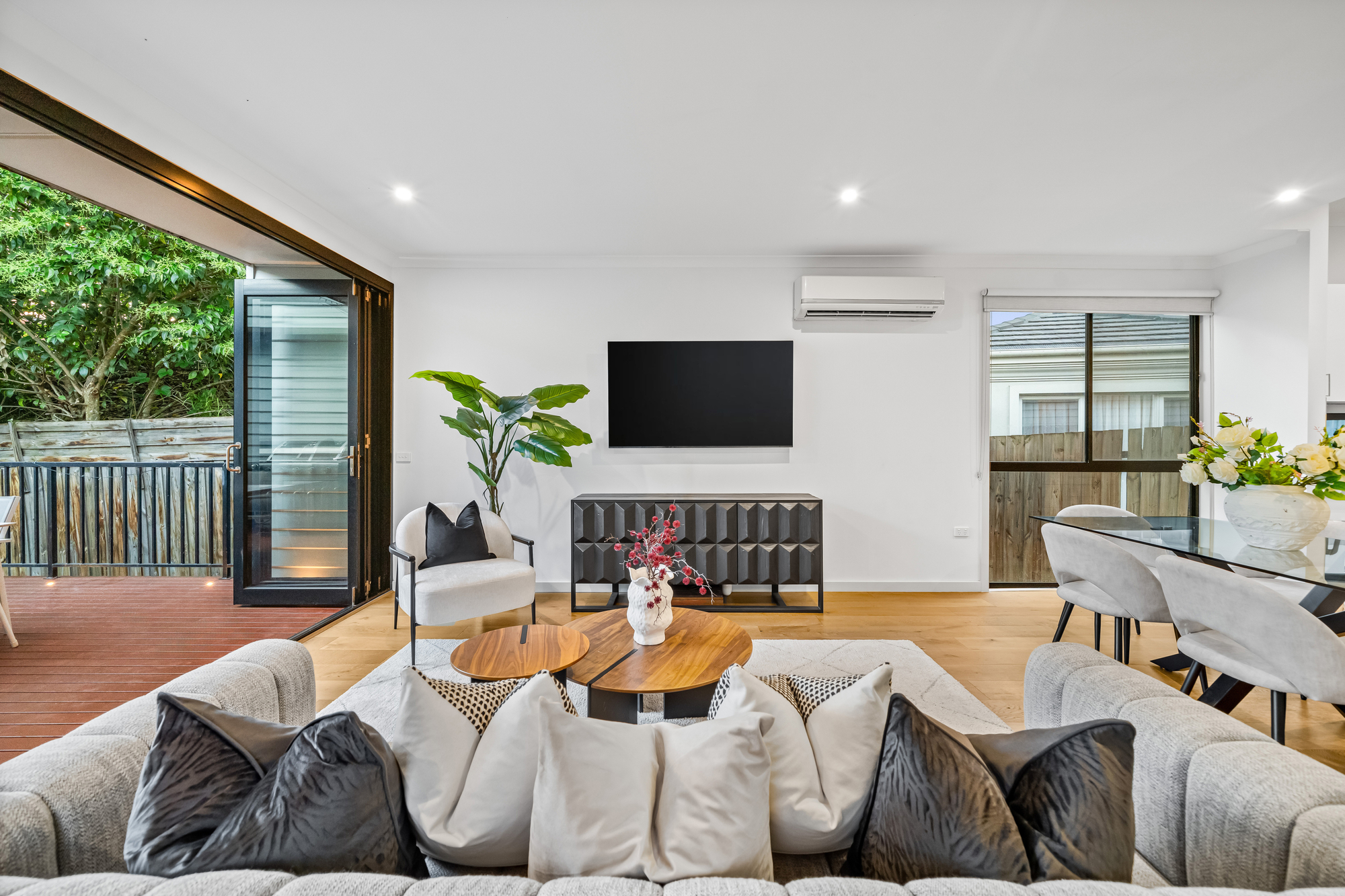 Spacious open-plan living and dining zones are generously proportioned and enhanced bytimber flooring, abundant natural light and recessed downlighting. Large sliding doors extend the living area to an elevated alfresco deck, creating seamless indoor–outdoor flow for everyday living and entertaining, while split-system heating and cooling provide year-round comfort. The living space at the back add flexibility to the floorplan. The property also benefits from a brand-new, income-generating solar system, delivering net-zero electricity costs and ongoing passive income via surplus energy export.
