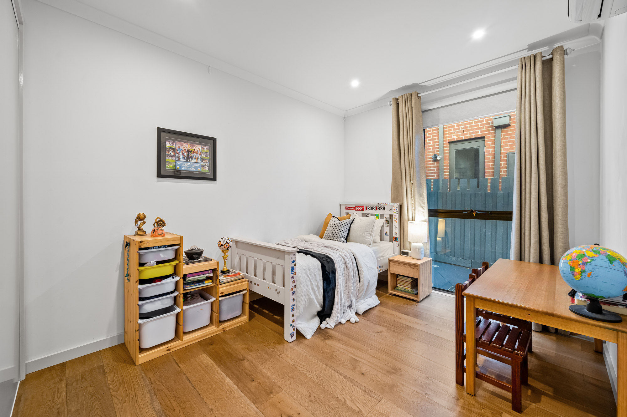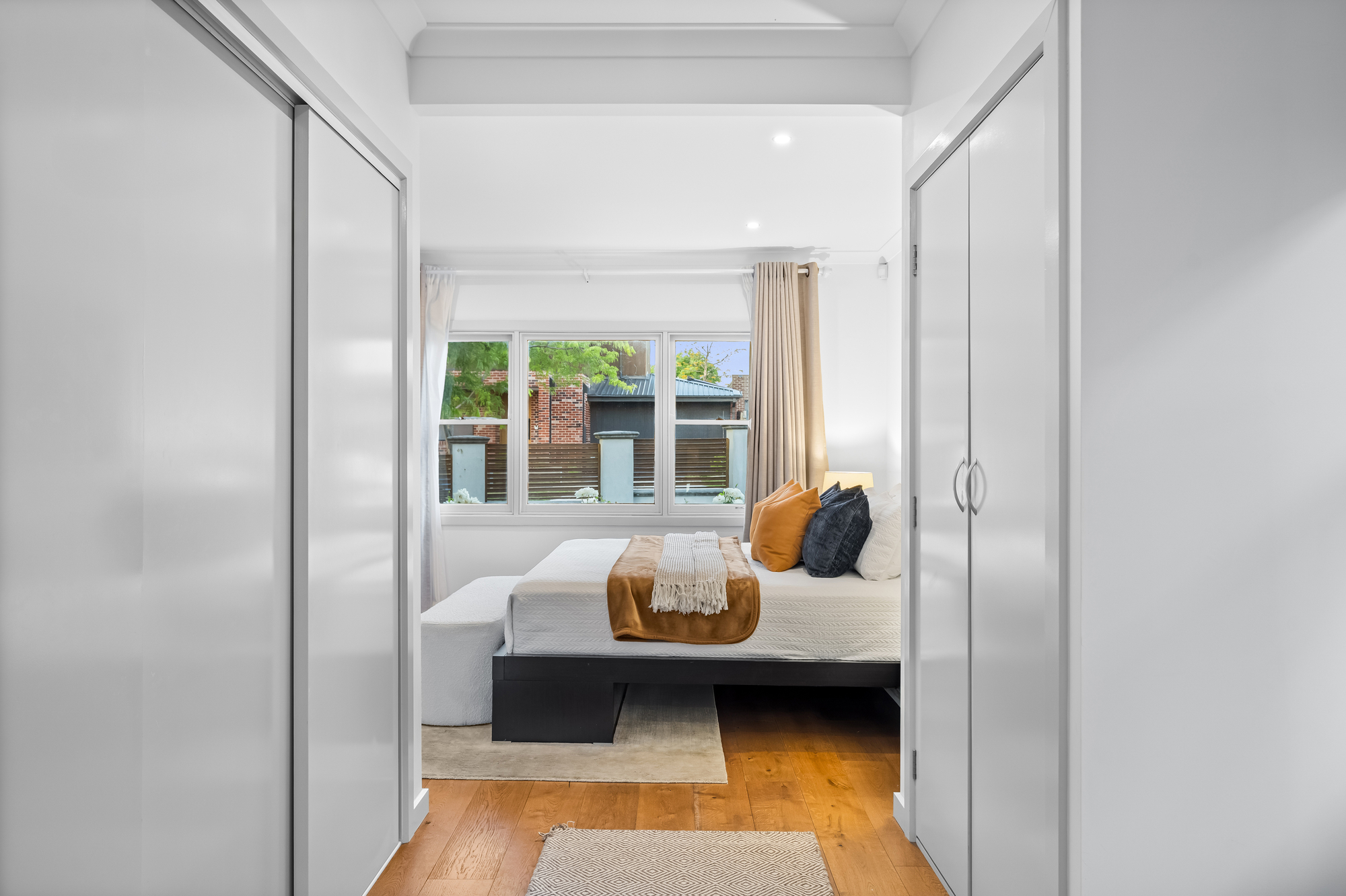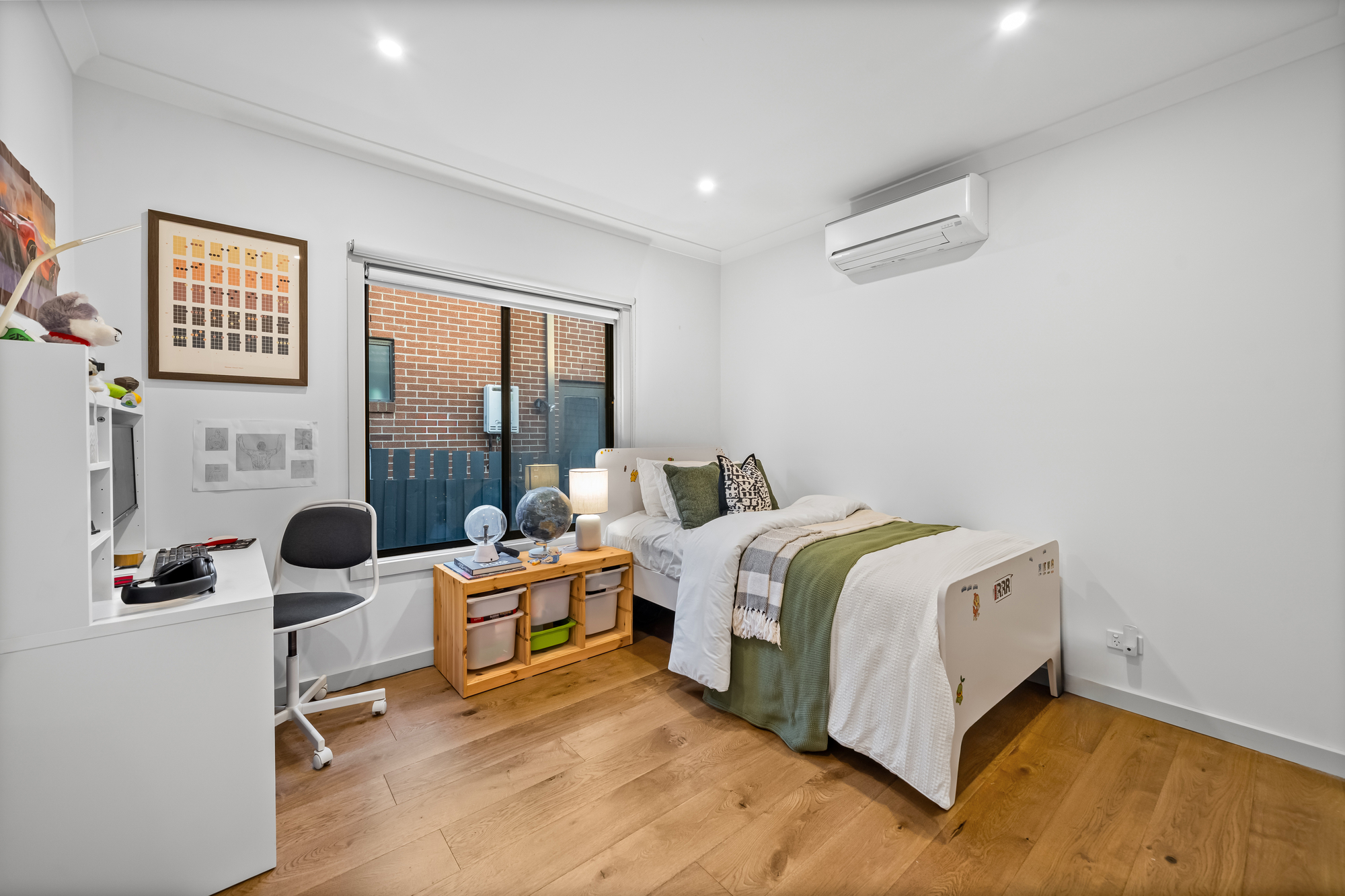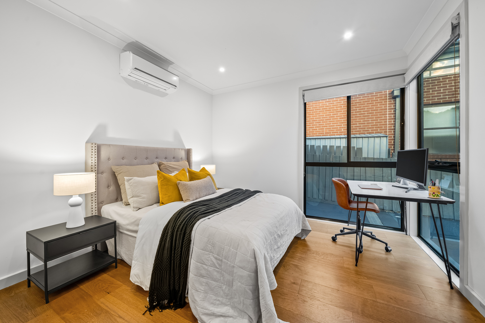 Accommodation comprises four well-proportioned bedrooms. The main bedroom features timber flooring, full-length curtains, split-system climate control, a walk-in robe and private ensuite. Additional bedrooms are well suited to family living, guests or home office use and are serviced by a stylish central bathroom with floor-to-