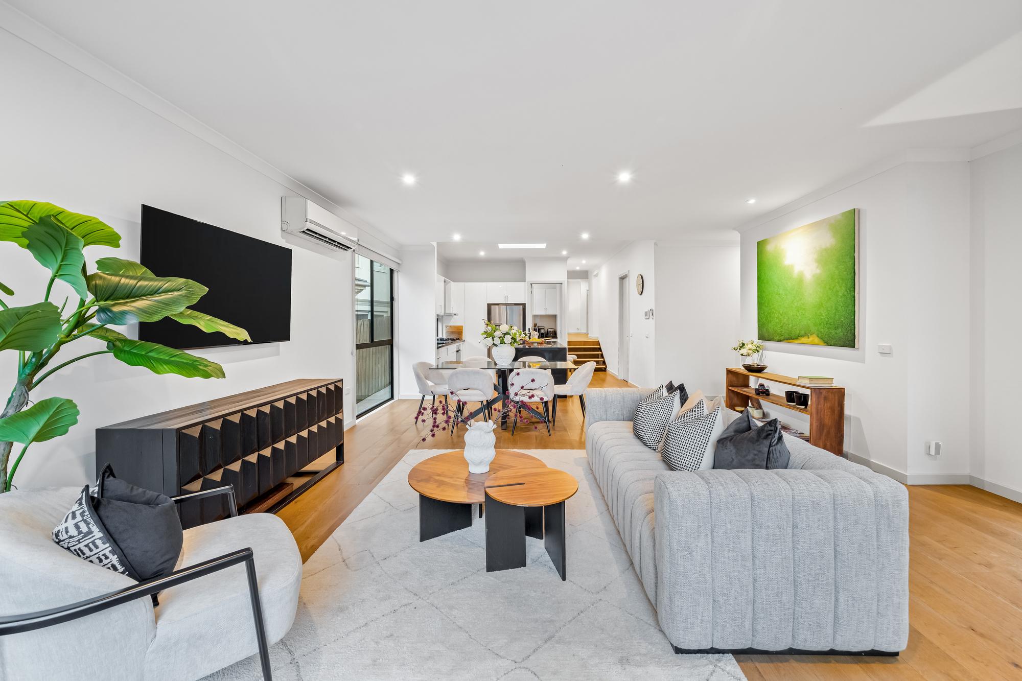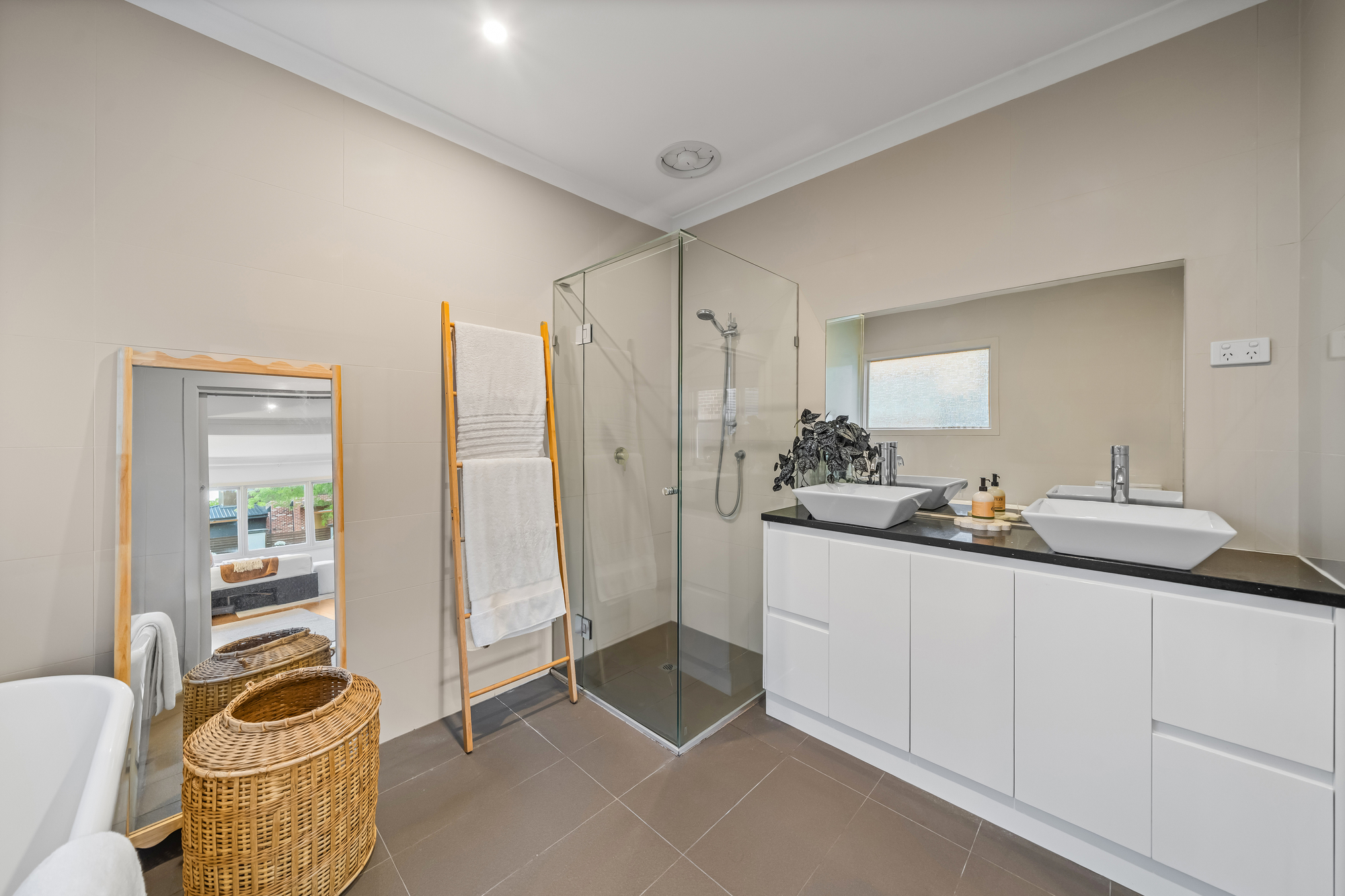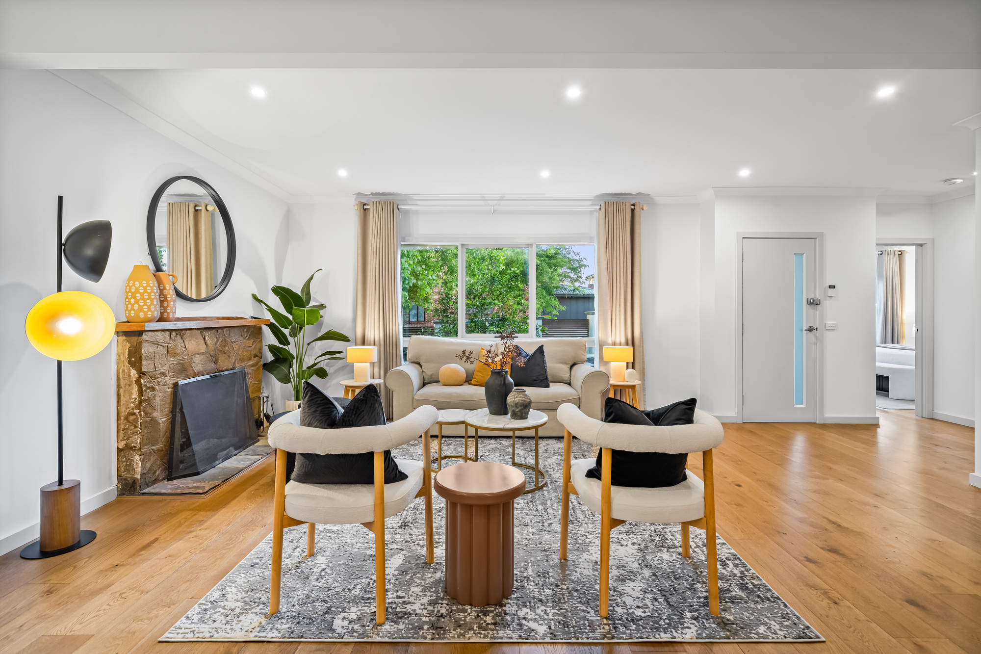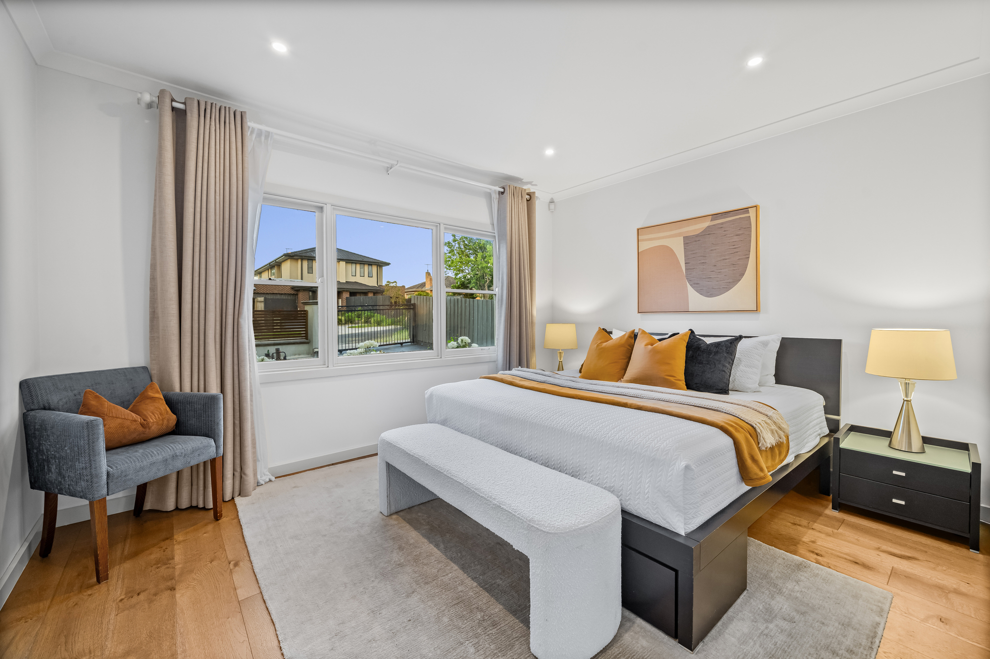 Accommodation comprises four well-proportioned bedrooms. The main bedroom features timber flooring, full-length curtains, split-system climate control, a walk-in robe and private ensuite. Additional bedrooms are well suited to family living, guests or home office use and are serviced by a stylish central bathroom with floor-to-