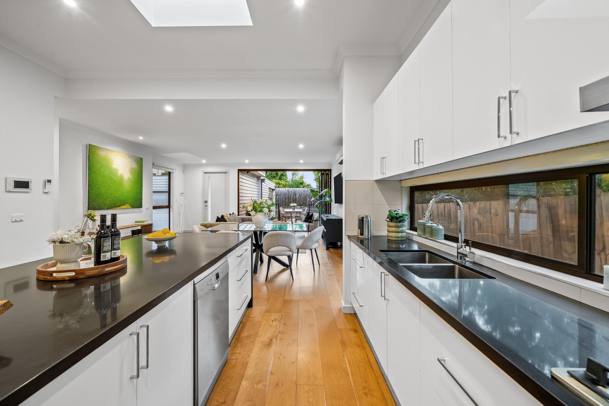 The kitchen showcases a sleek contemporary design with gloss white cabinetry, extensive storage and a large stone island bench with waterfall edge. Black stone benchtops, a Bosch stainless-steel oven, five-burner gas cooktop, integrated rangehood, full-height glass splashback and a double undermount sink complete the space.