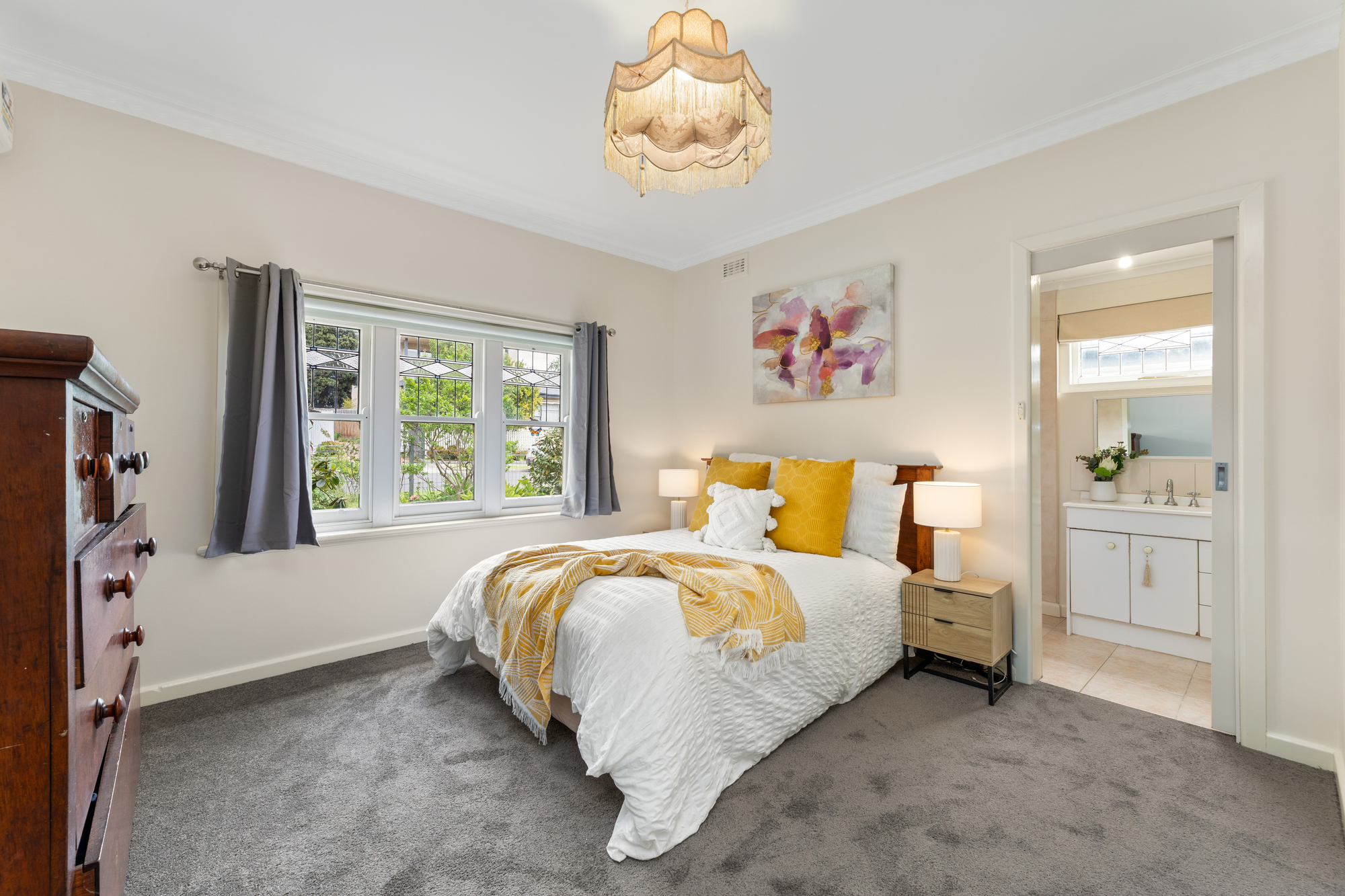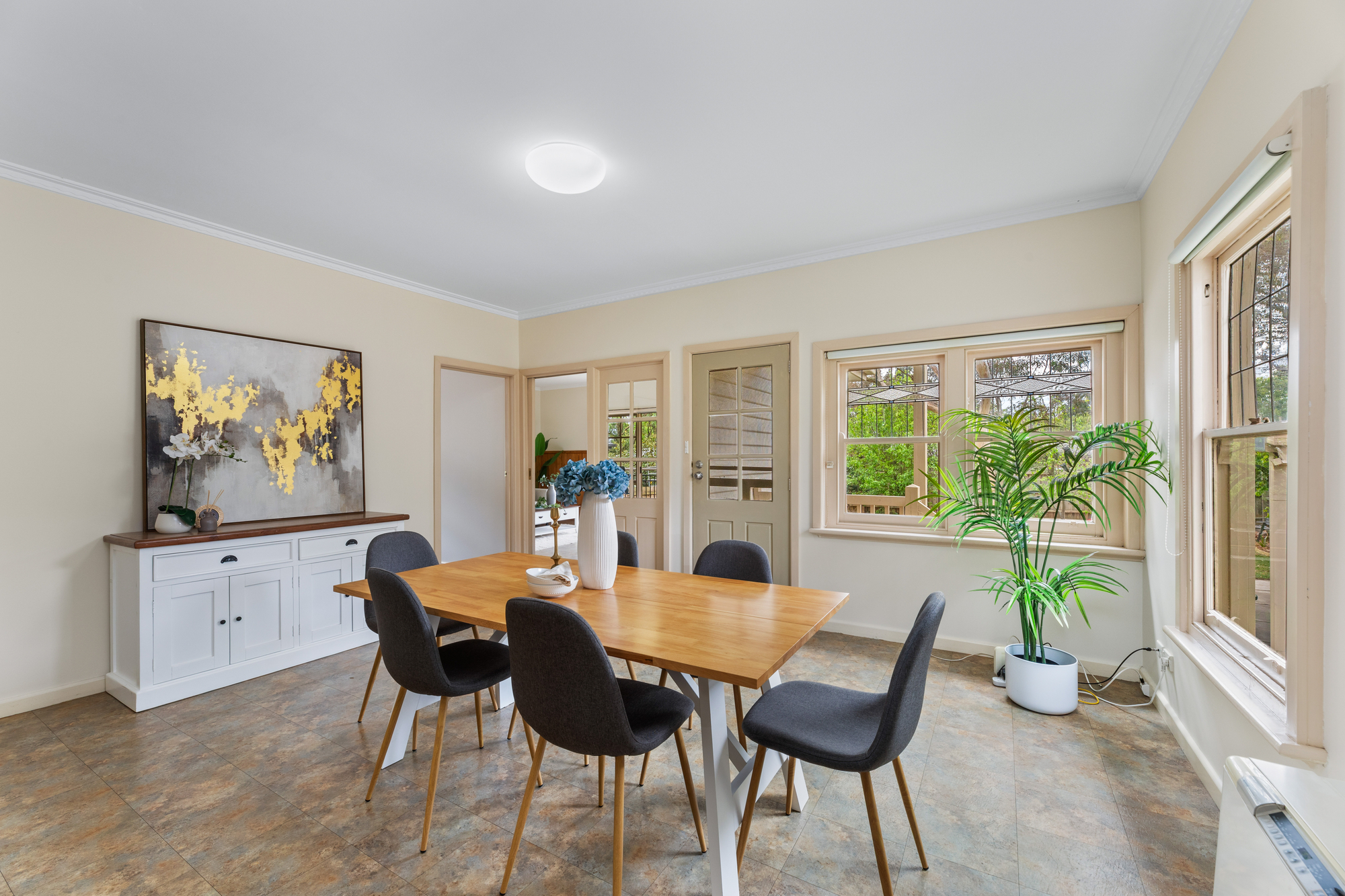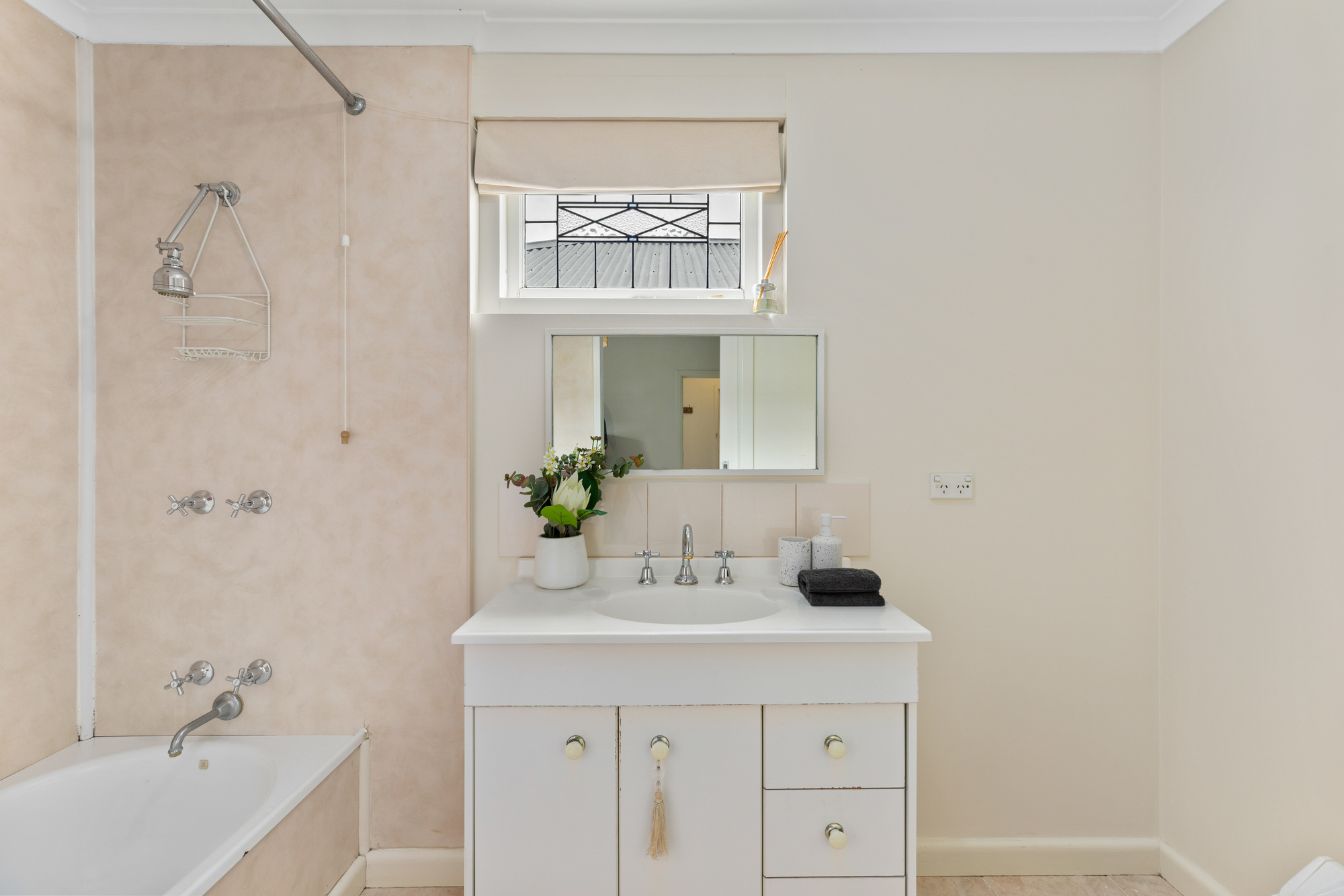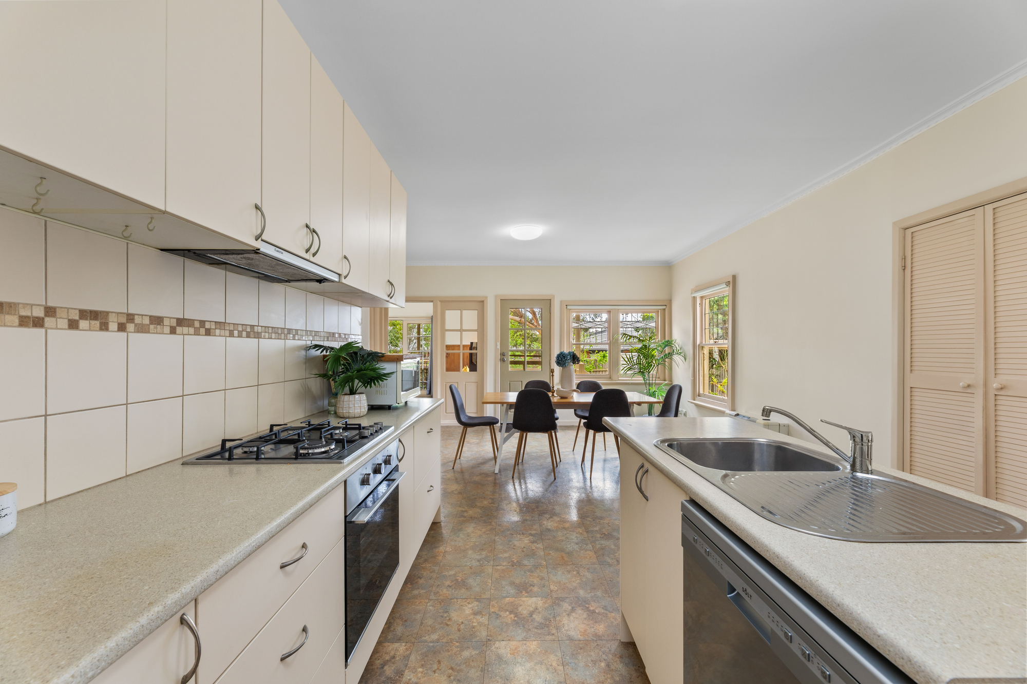 Accommodation includes four well-sized bedrooms, each with plush carpets and built-in robes, while the main bedroom features a private ensuite and a Toshiba air conditioner. The family bathroom is bathed in natural light and complements the home’s bright, airy ambiance. Additional features include feature windows and parking. Outdoors, a large, plant-filled backyard offers ample space for children to play or for gardening enthusiasts to enjoy, surrounded by mature greenery that enhances privacy and tranquility.
