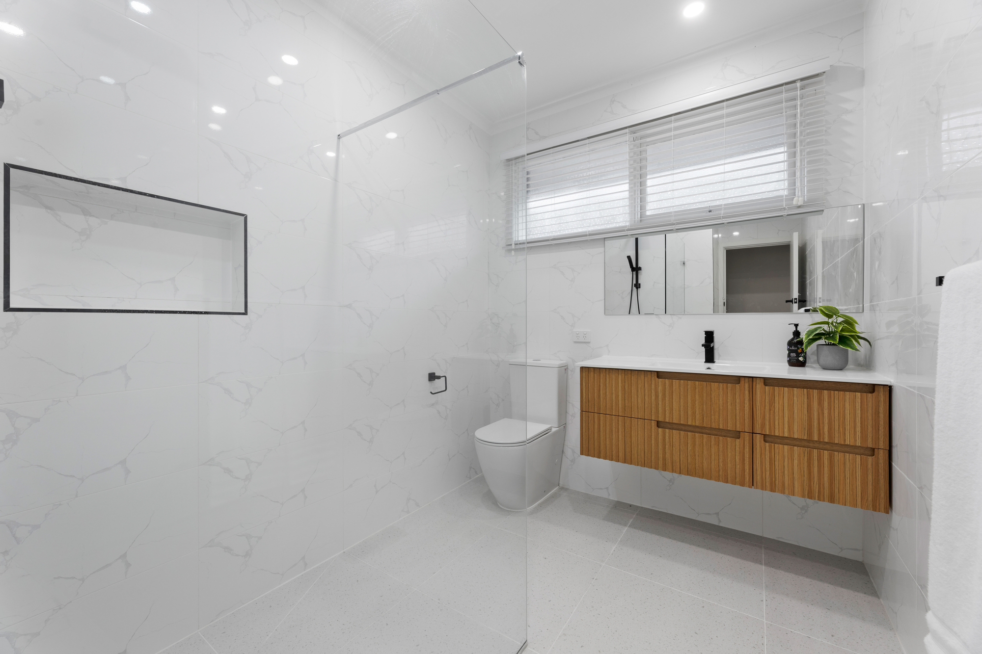 Accommodation comprises three generous bedrooms, each with built-in robes, serviced by a refreshed family bathroom, separate toilet, and a well-appointed laundry.
