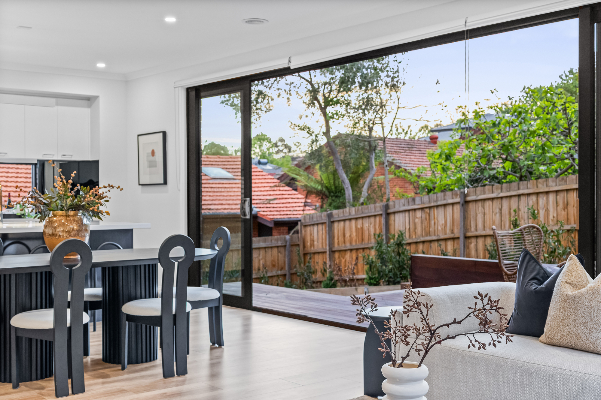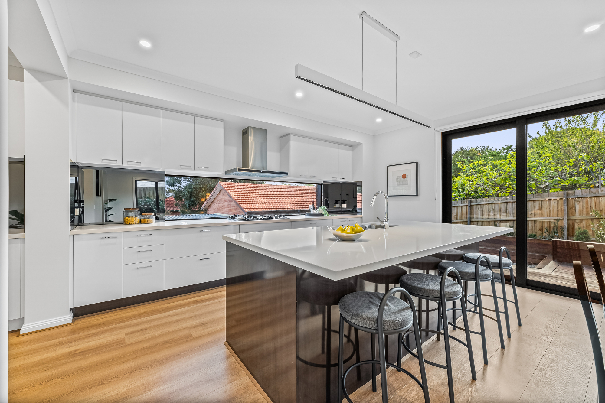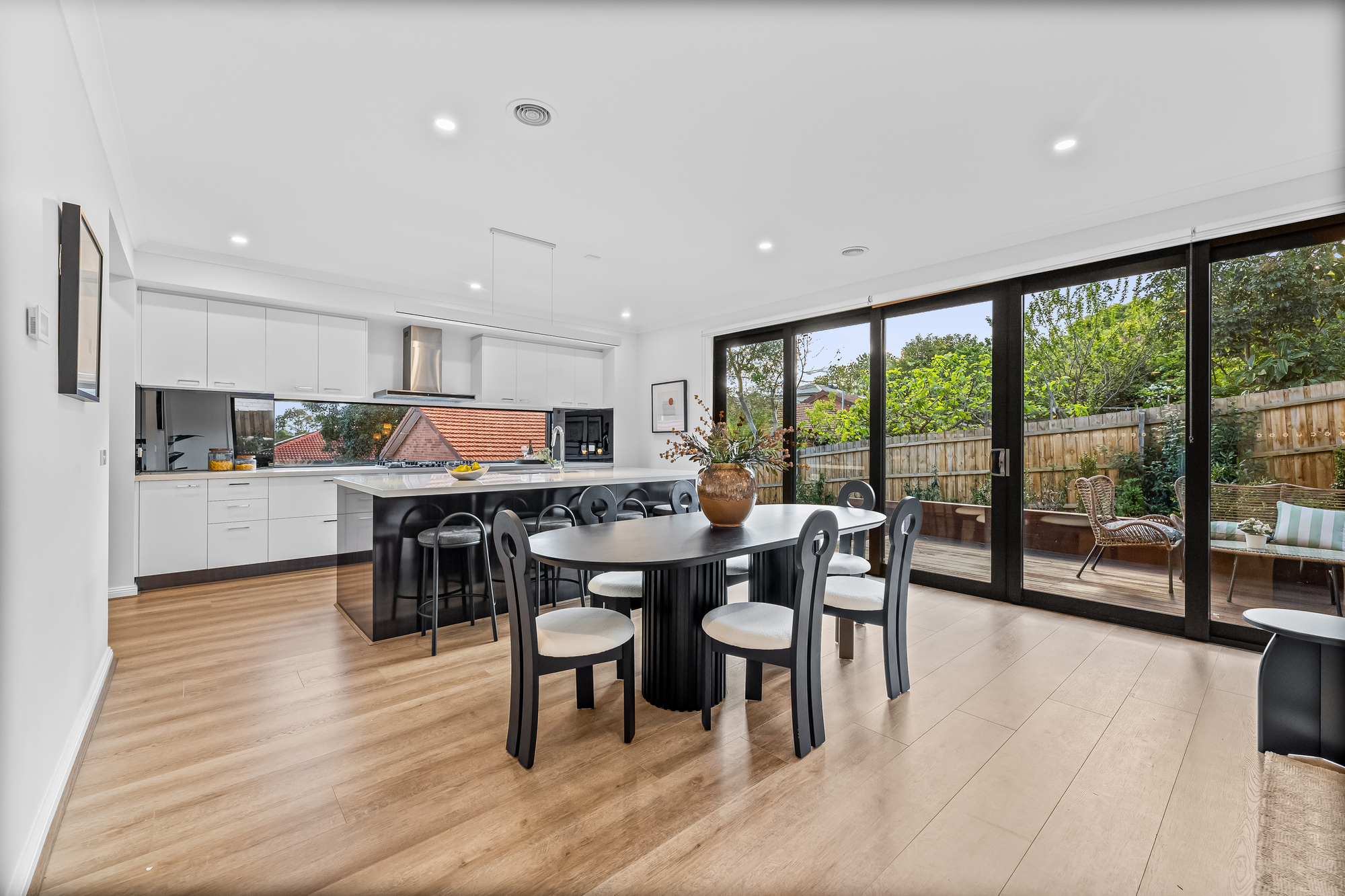 The open-plan living, dining, and kitchen area features timber floorboards and expansive floor-to-ceiling stacker windows that open fully to connect the indoors with the large outdoor deck, creating a seamless flow. The kitchen includes stone benchtops, a large island seating four, double undermount sink, Inalto appliances, and a butler’s pantry with additional sink and storage.