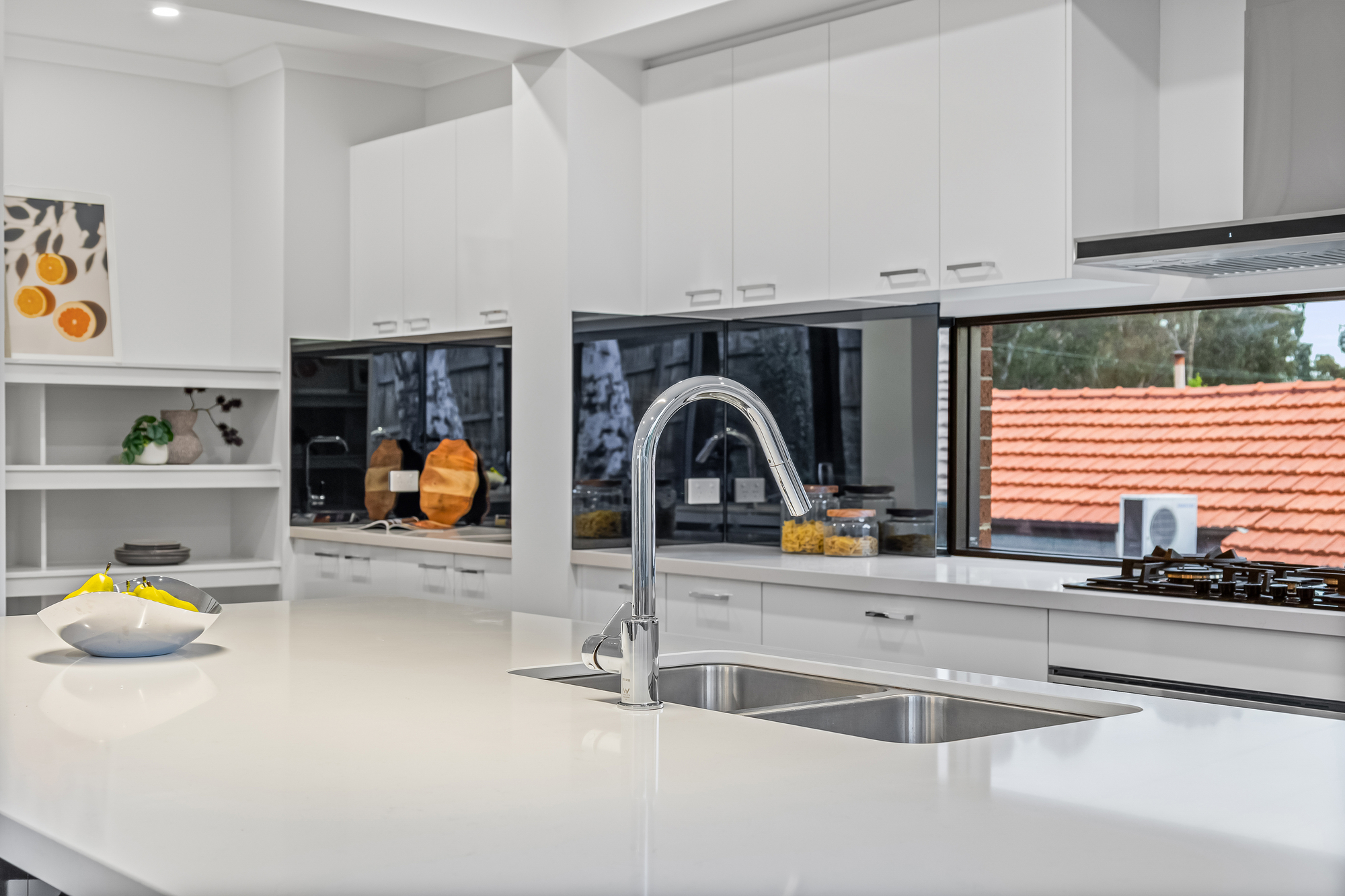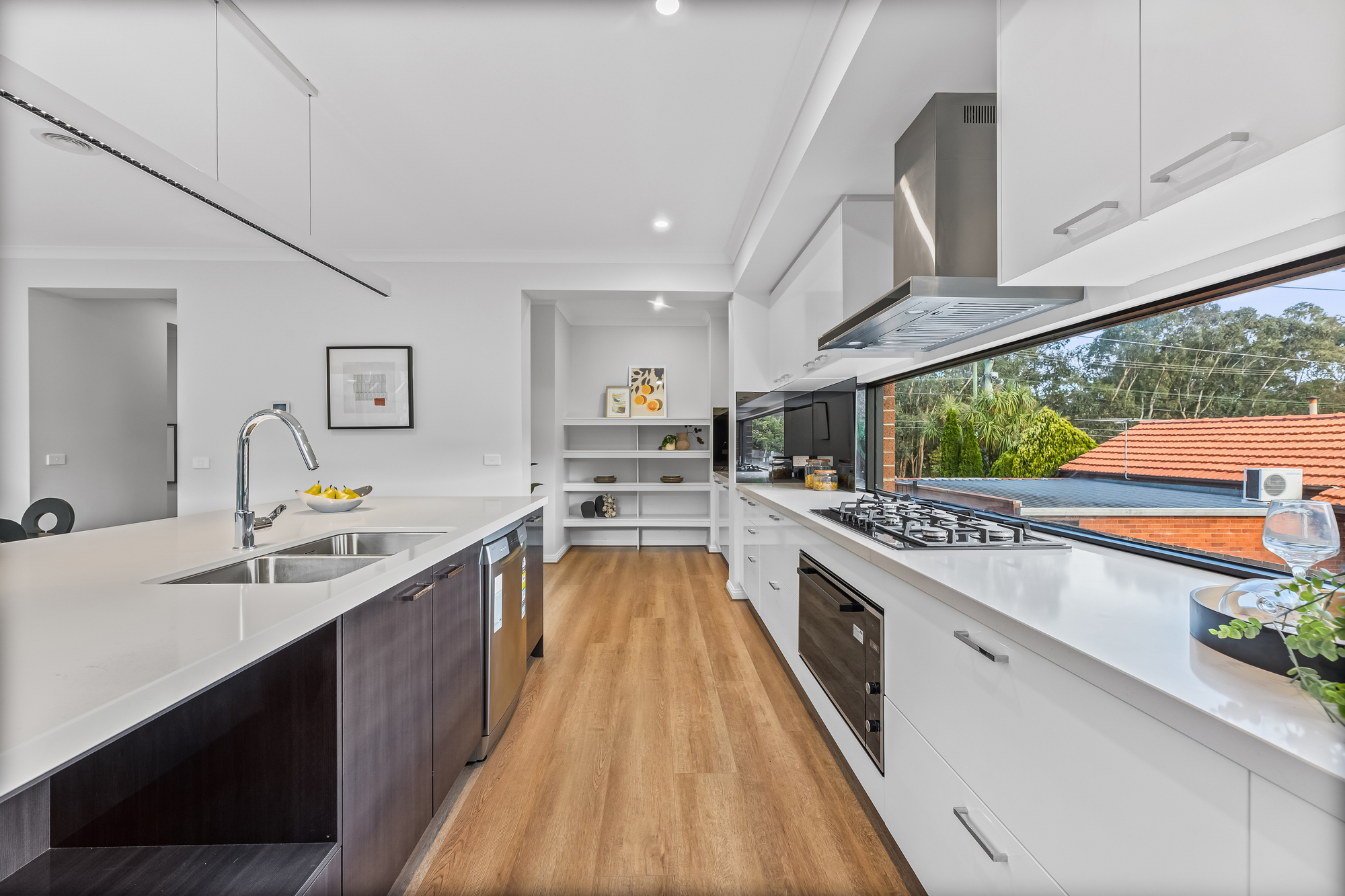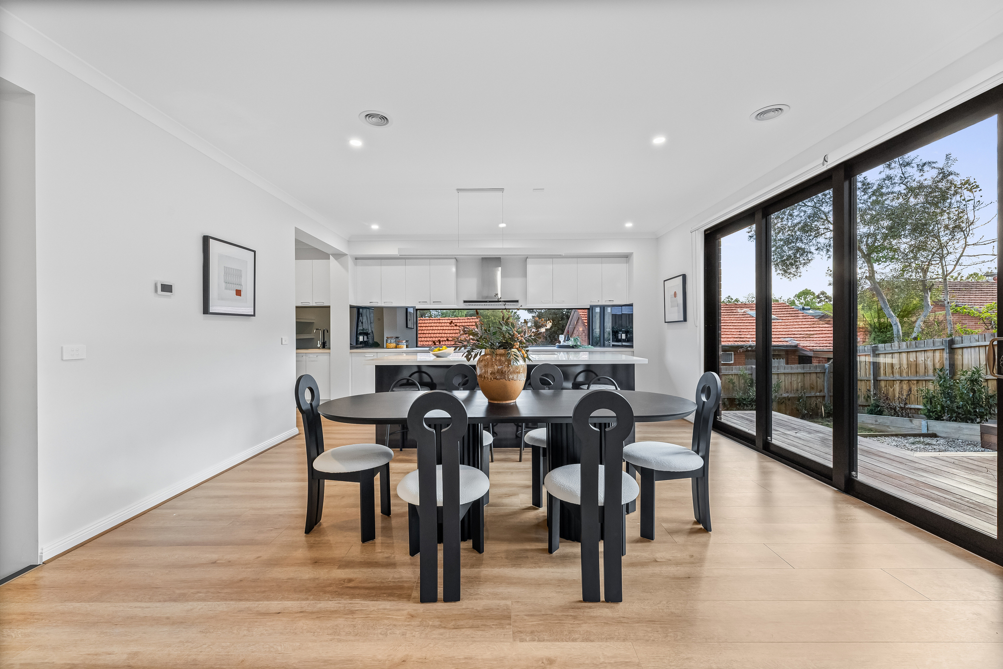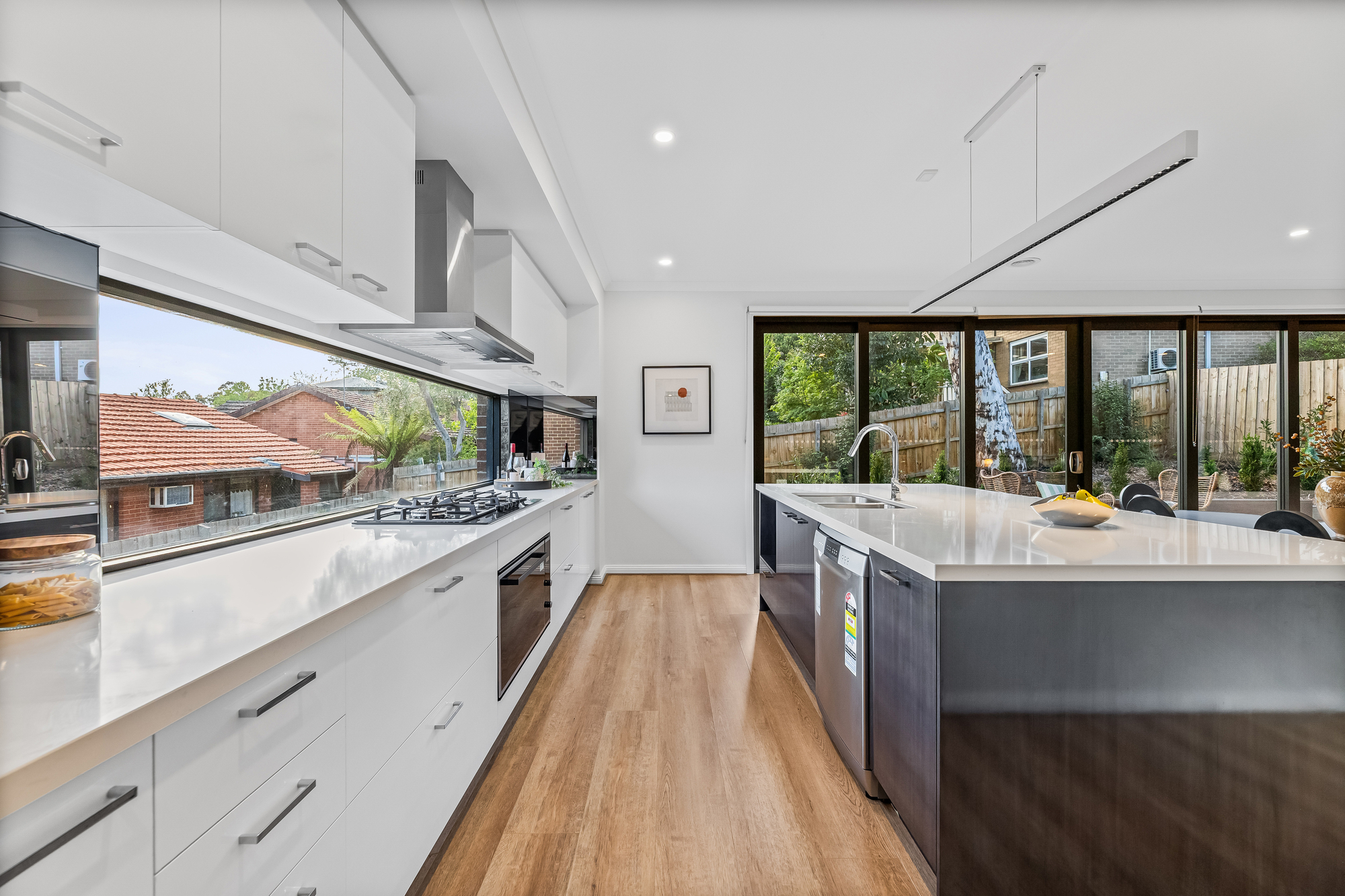 The open-plan living, dining, and kitchen area features timber floorboards and expansive floor-to-ceiling stacker windows that open fully to connect the indoors with the large outdoor deck, creating a seamless flow. The kitchen includes stone benchtops, a large island seating four, double undermount sink, Inalto appliances, and a butler’s pantry with additional sink and storage.