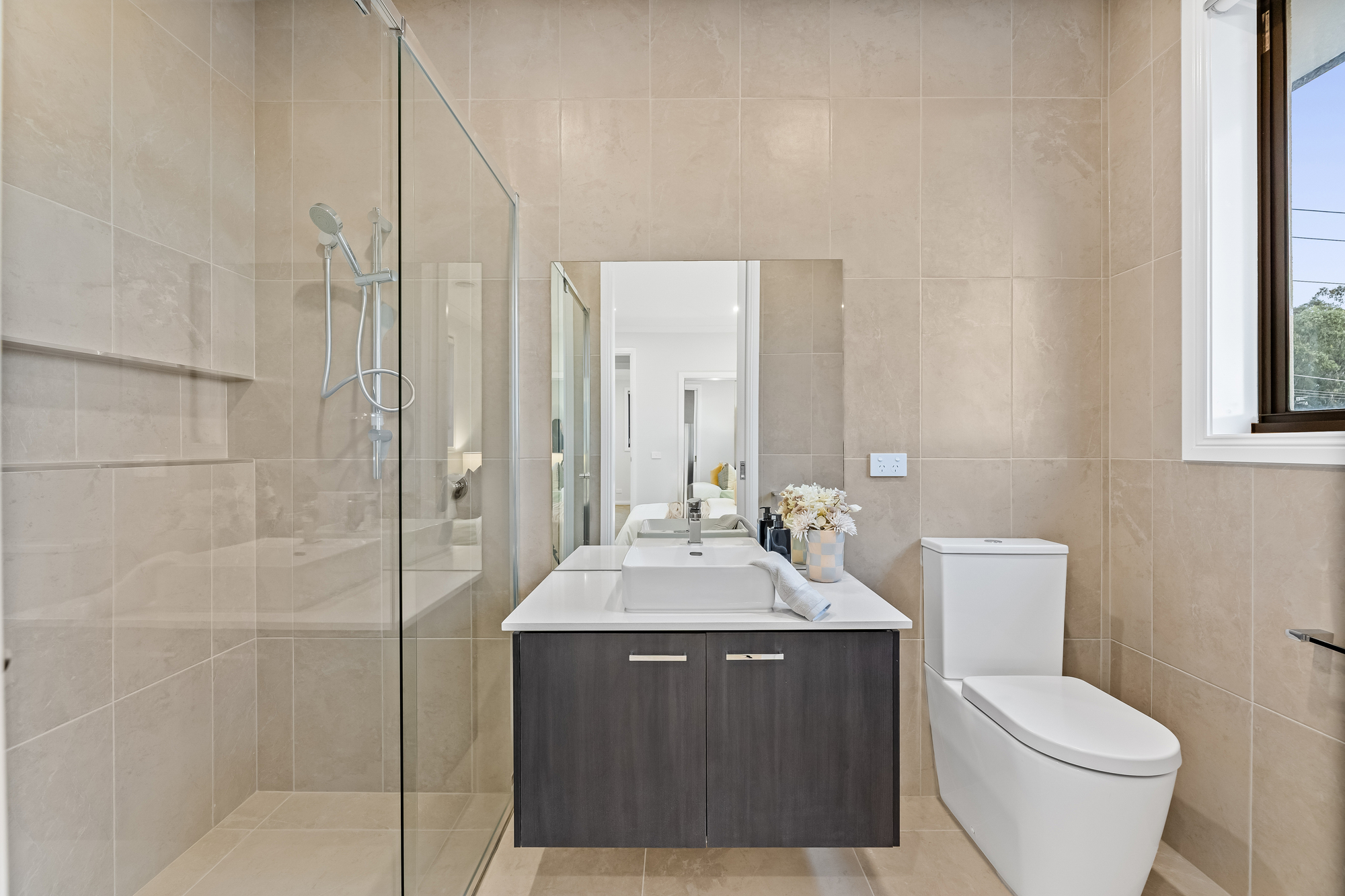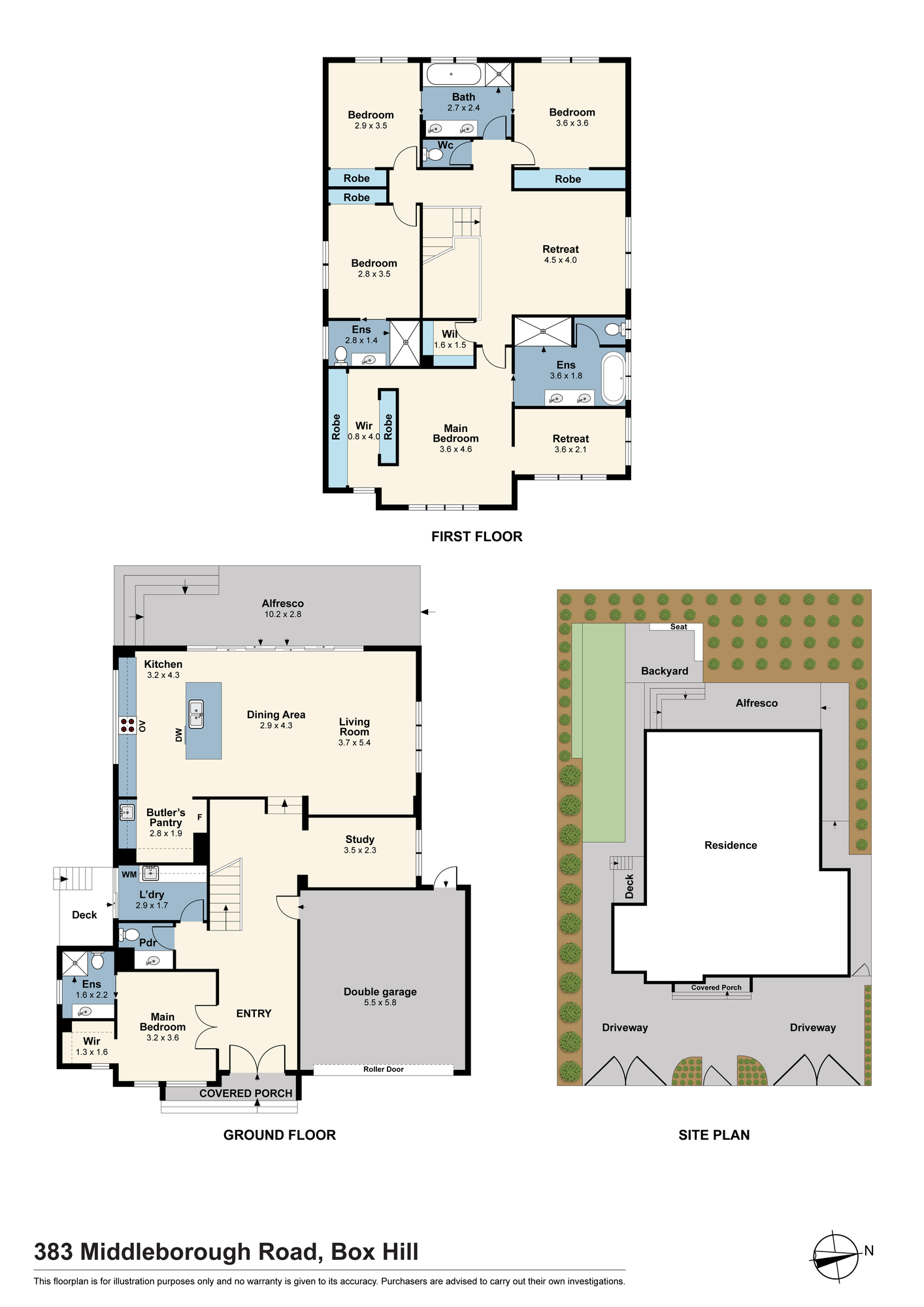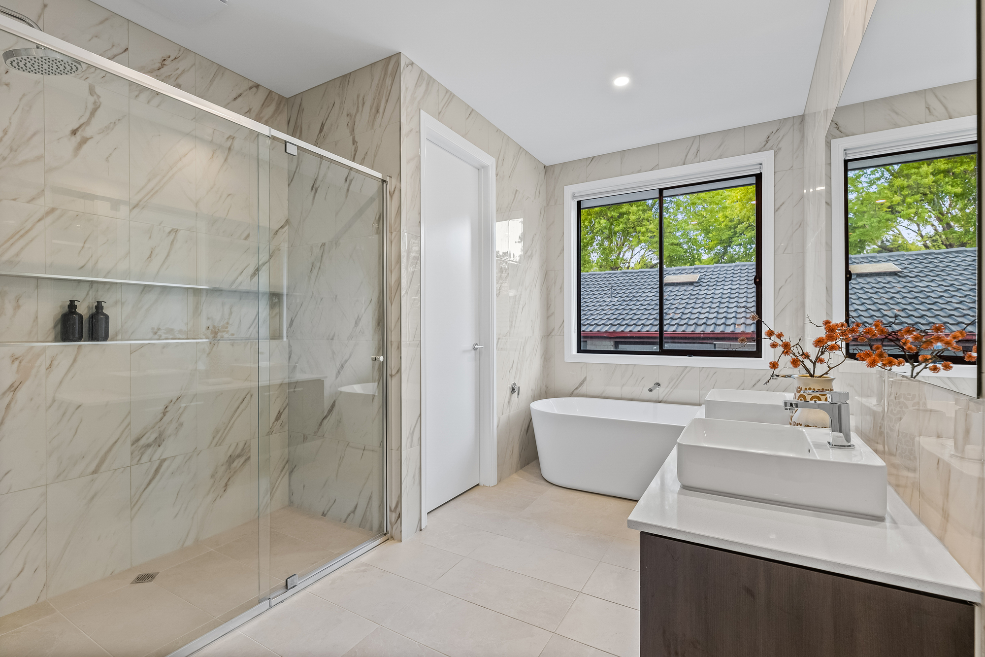 Accommodation is thoughtfully arranged, with a downstairs bedroom featuring a walk-in robe and ensuite, while the main bedroom upstairs includes a walk-in robe, ensuite, and study. All bedrooms have built-in wardrobes, with the third featuring an ensuite and the fourth and fifth sharing a Jack and Jill bathroom. Each bathroom showcases floor-to-ceiling tiles, double vanities, separate baths and showers, and there are powder rooms on both levels.