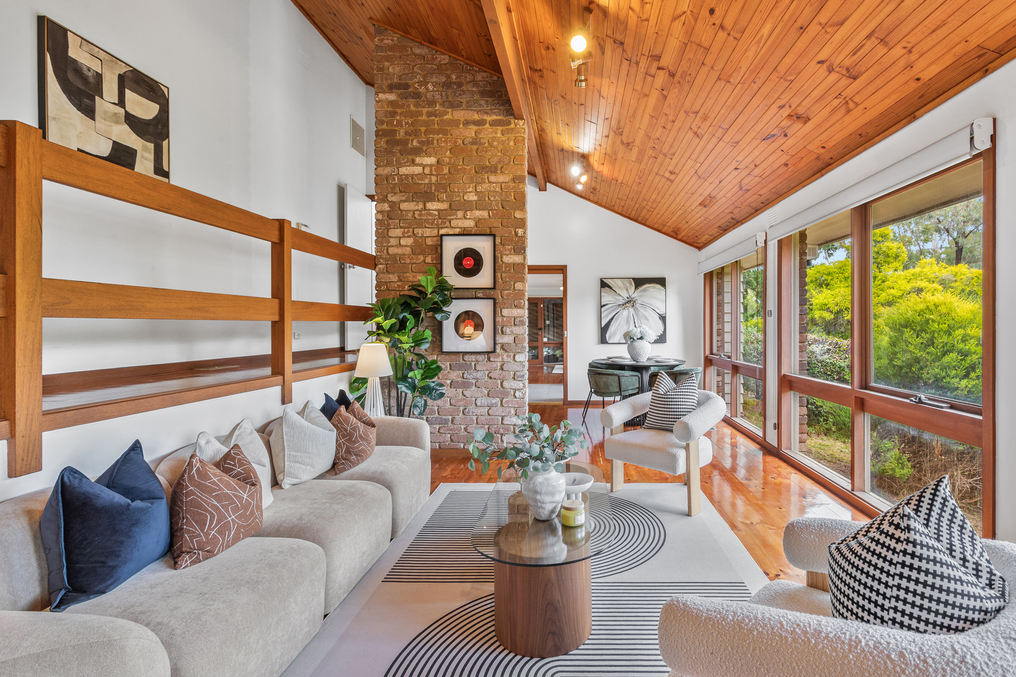 The adjoining dining and living zone is a true highlight, showcasing beautiful high timber ceilings and an exposed brick feature wall that adds warmth and architectural character. Large windows flood the space with natural light, enhancing the polished timber flooring that runs throughout the main living areas.