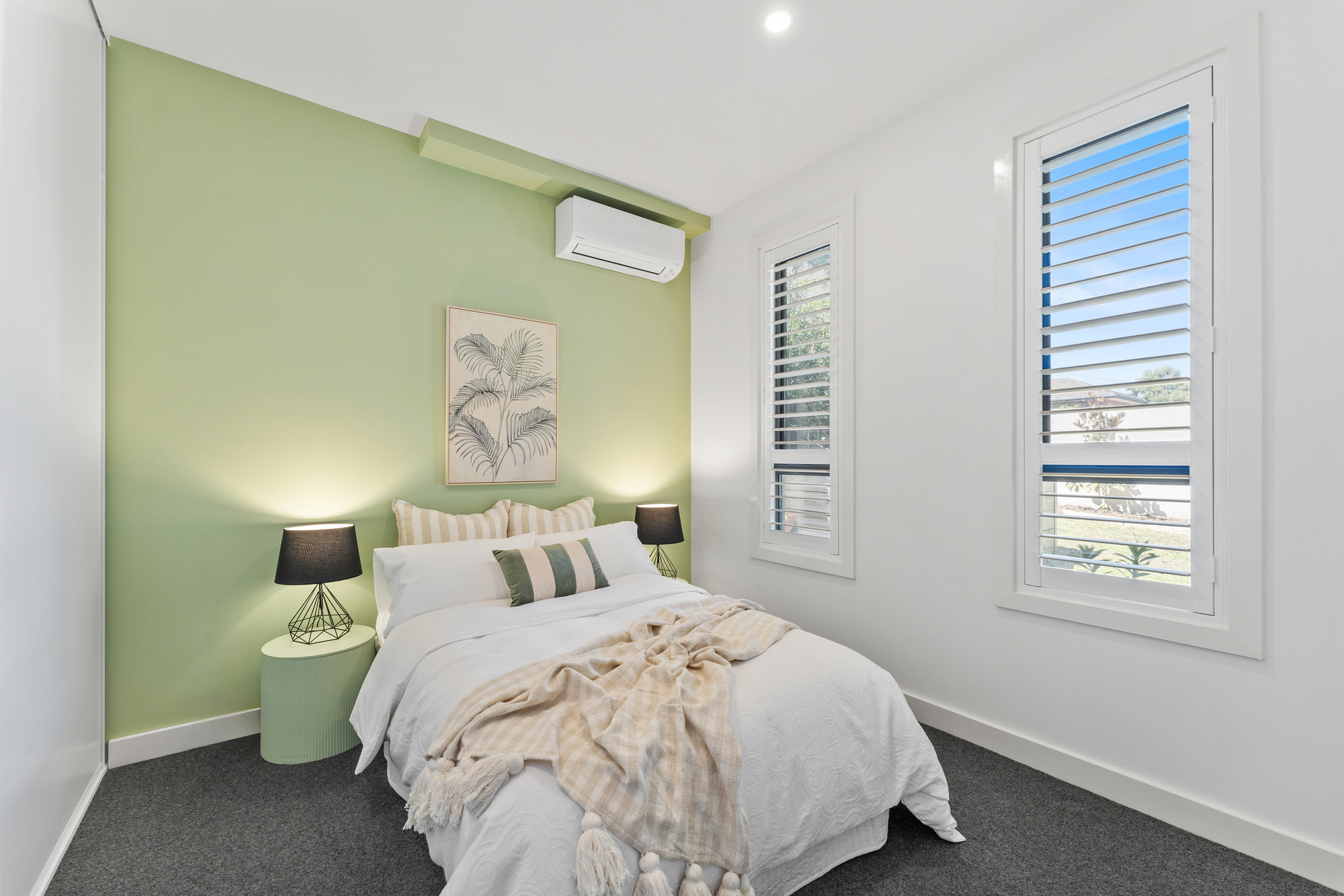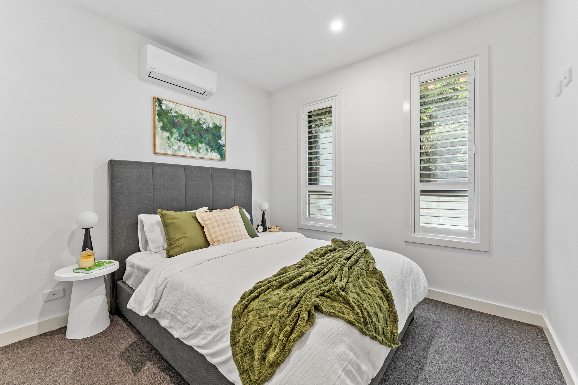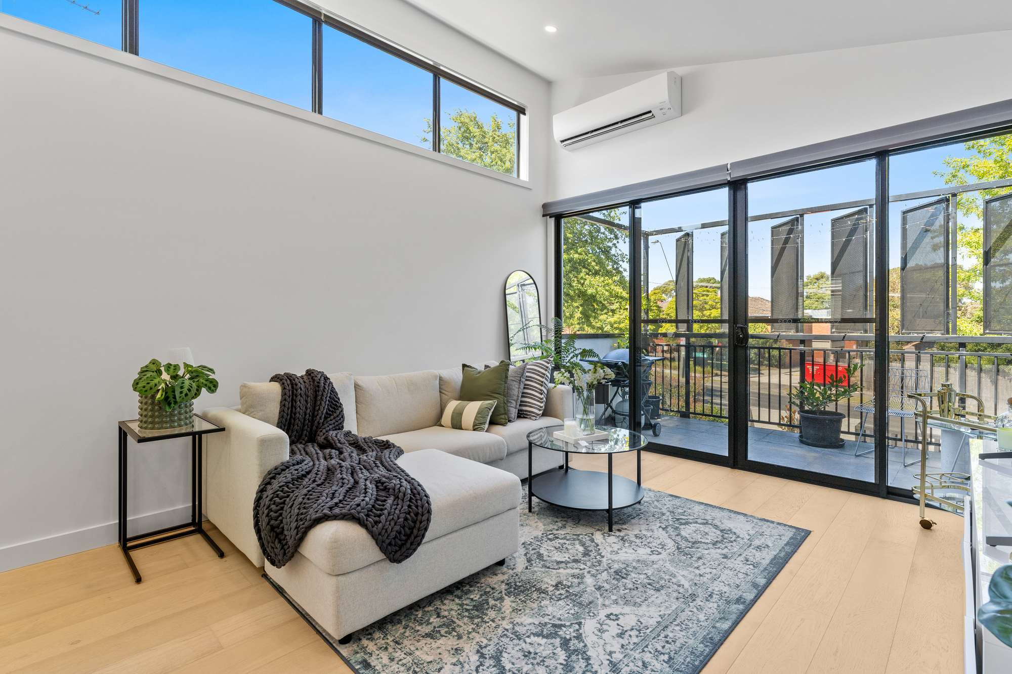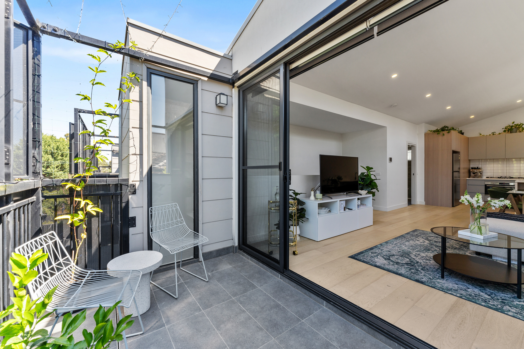 Sweeping sliding doors open to a zero-maintenance balcony where you can entertain effortlessly. Additional privacy is provided through stylish black louvres and electric-controlled roller blinds.