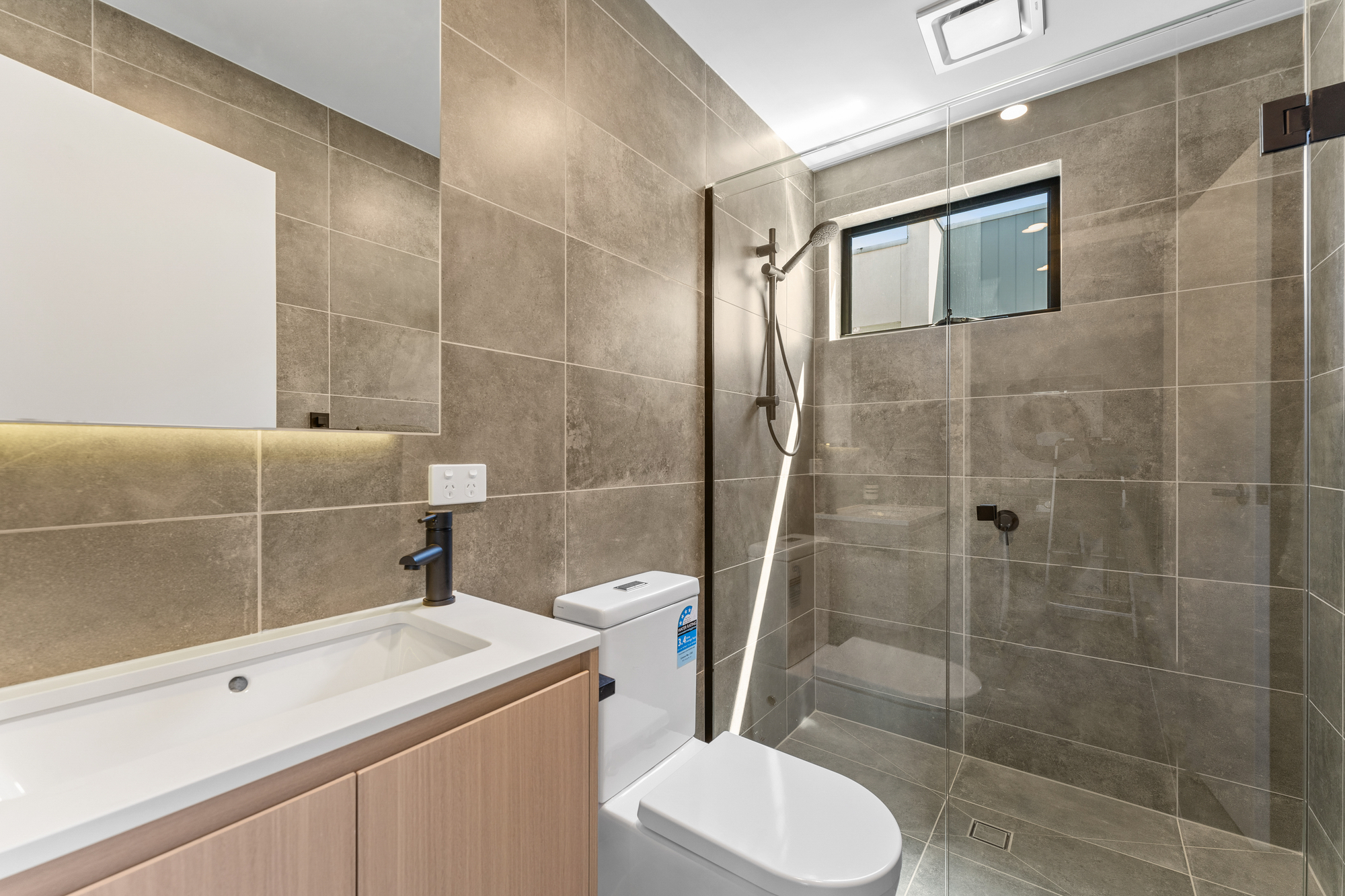 Three spacious double bedrooms including master with semi-ensuite offer plush carpets, full size built-in robes and plantation shutters. Two chic bathrooms each with a large walk-in shower, above-counter basin, shaving cabinet storage, floor to ceiling tiling, and stylish matte black tapware provide a contemporary haven to relax and unwind.