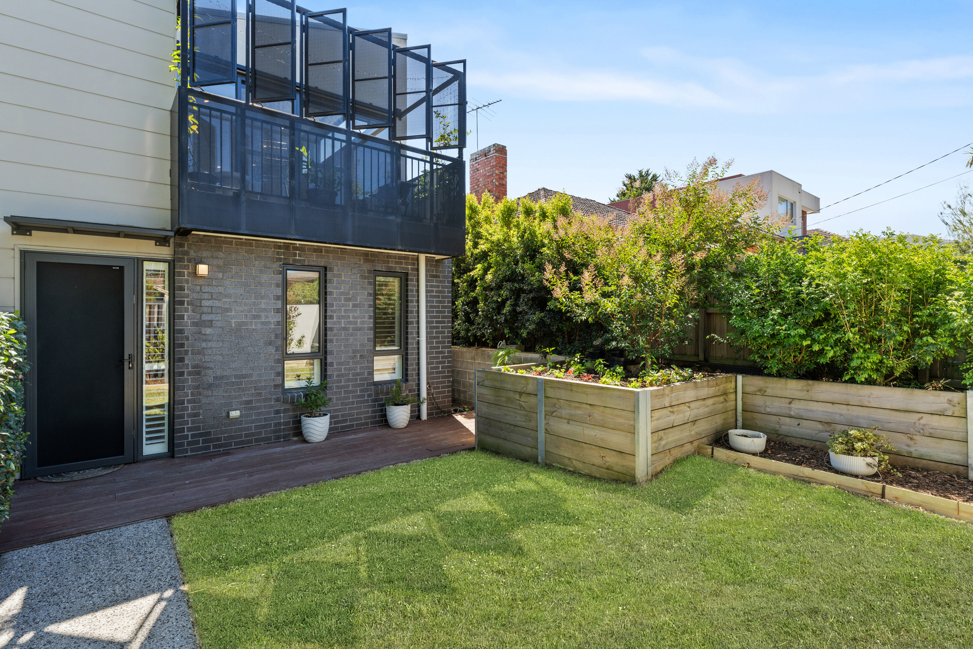 Outside, a low-maintenance front yard offers a verdant landscaped setting with raised garden beds, privately secluded and secured by a high front wall with remote locked gate and video intercom system.