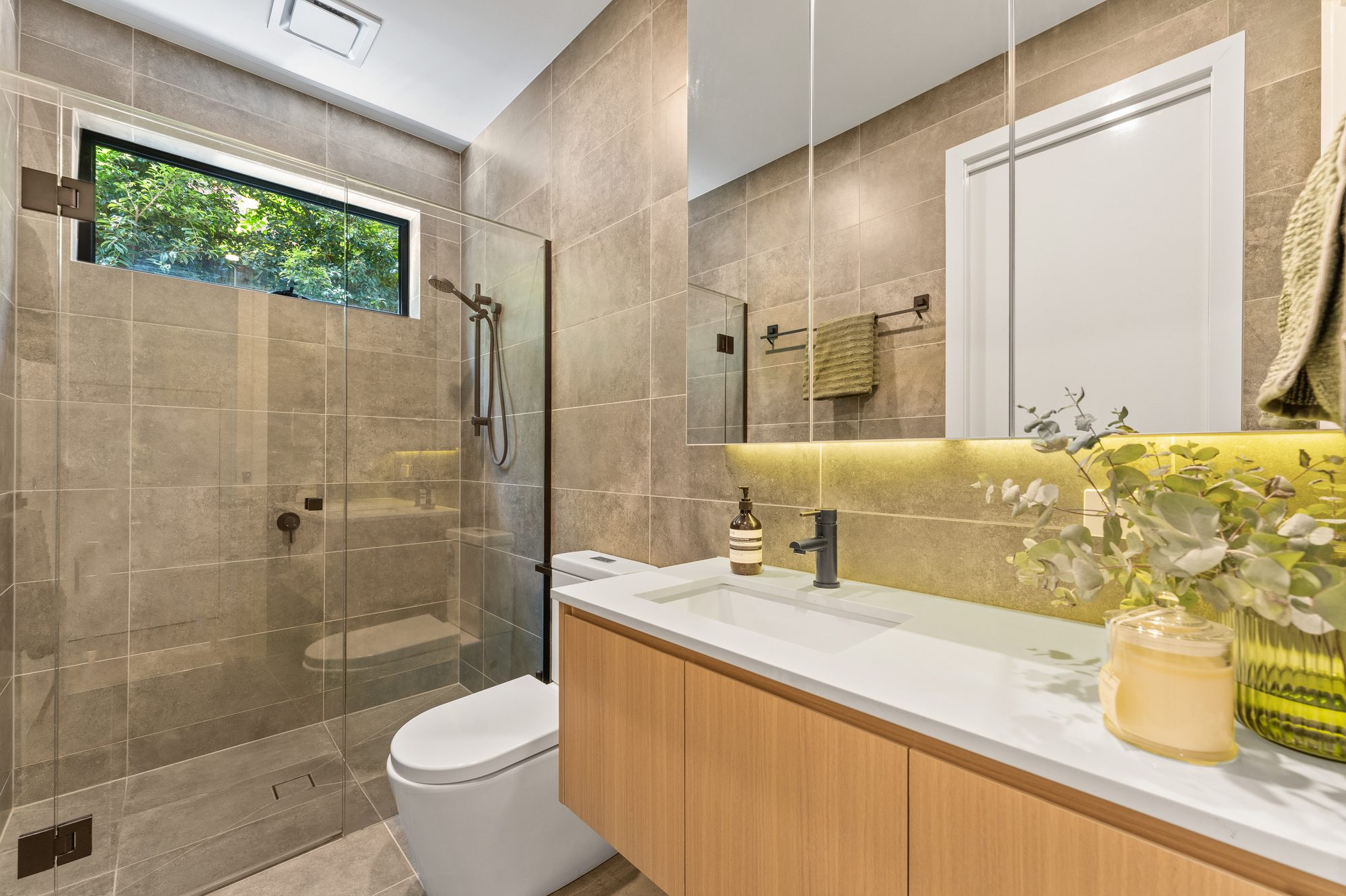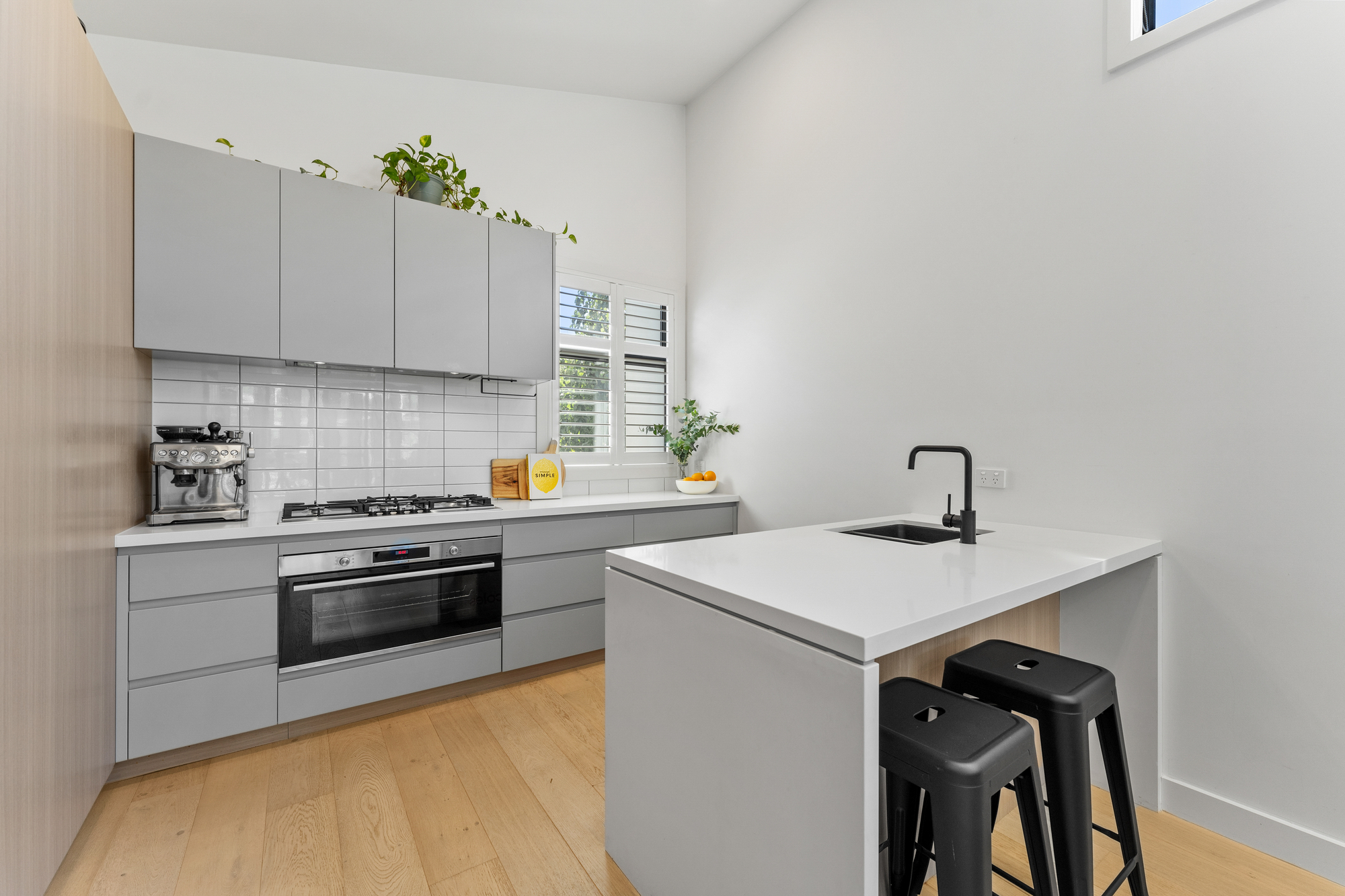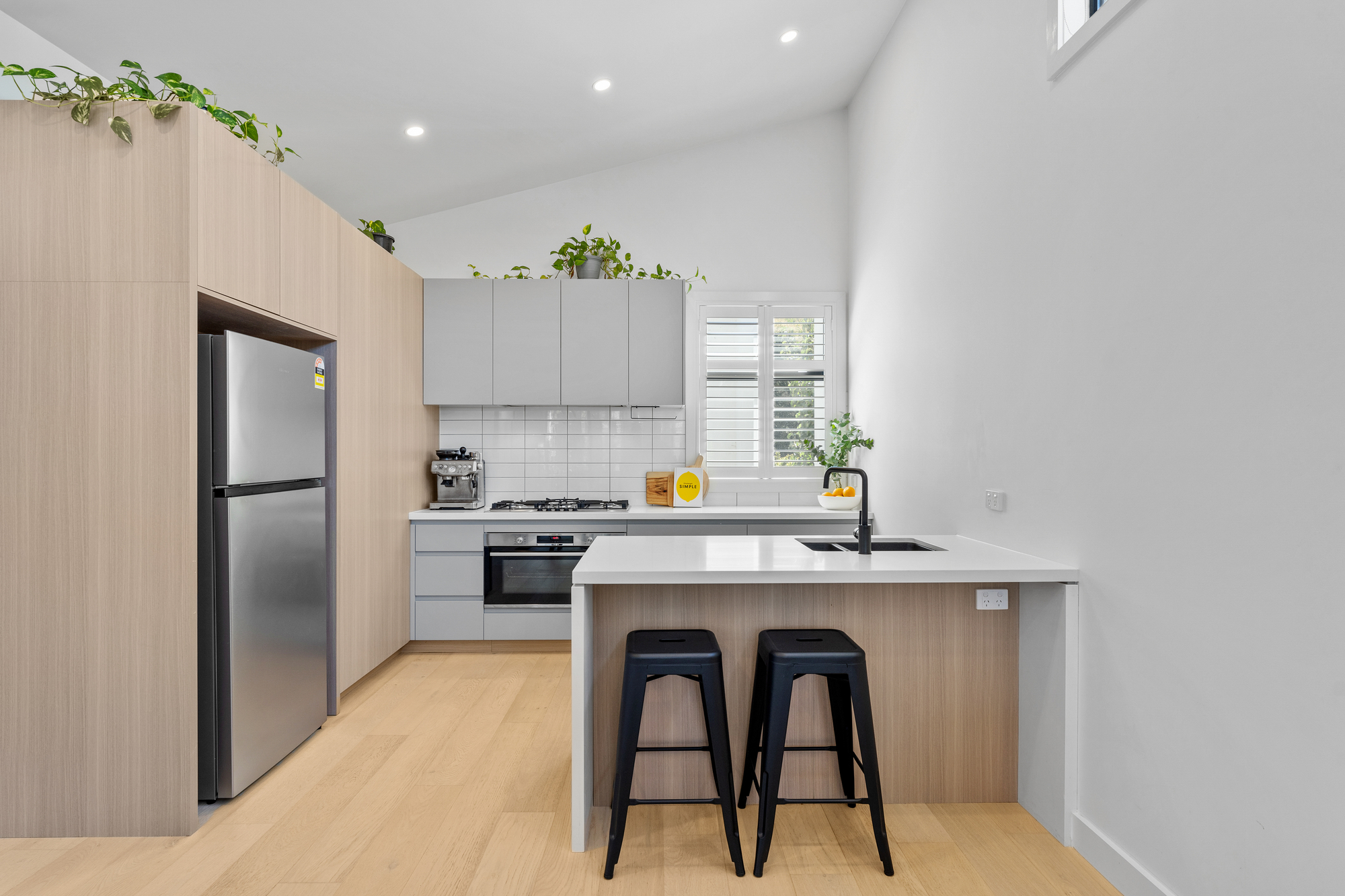 An architecturally raked ceiling with large highlight windows draws unobstructed northern light to the expansive open plan living and dining spaces that connect through to a stylish entertainer’s kitchen equipped with premium Bosch appliances including 900mm cooktop and oven, and semi-integrated dishwasher. Neutral wood tones and grey cabinetry provide a calming backdrop to the generous island with stunning waterfall stone benchtops, bench seating, and modern matt black fixtures.