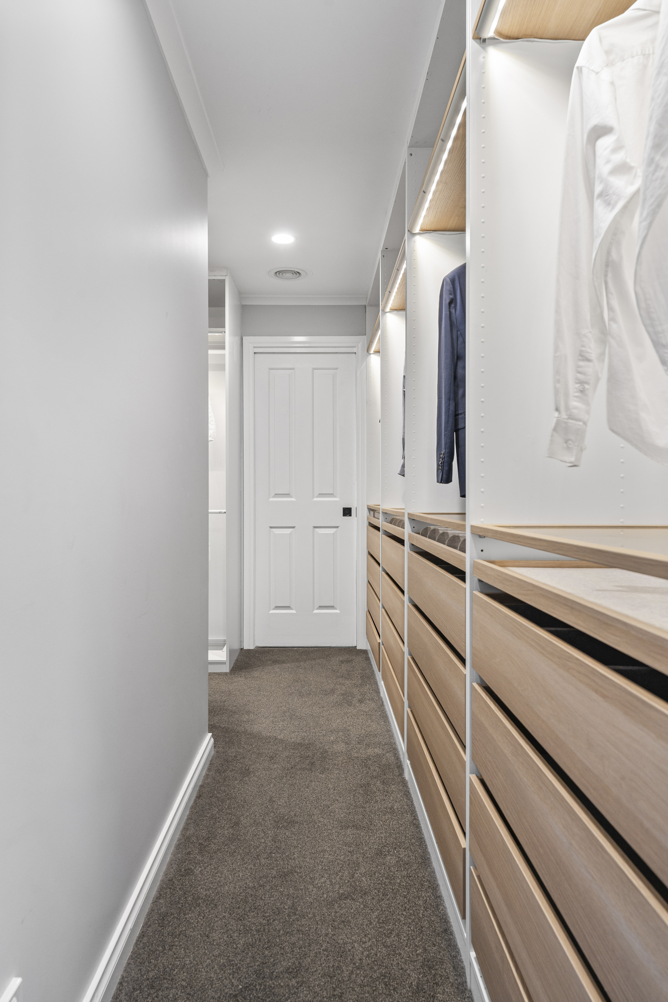 Upstairs, the master bedroom includes a spacious walk-in robe, ensuite with double marble vanity, dual-head rain shower, and a convenient laundry chute. Two additional carpeted bedrooms with built-ins share a family bathroom complete with bathtub, marble-top vanity, and illuminated mirror. A downstairs study or fourth bedroom opens to the backyard and all rooms provides direct high-speed wired internet connection.