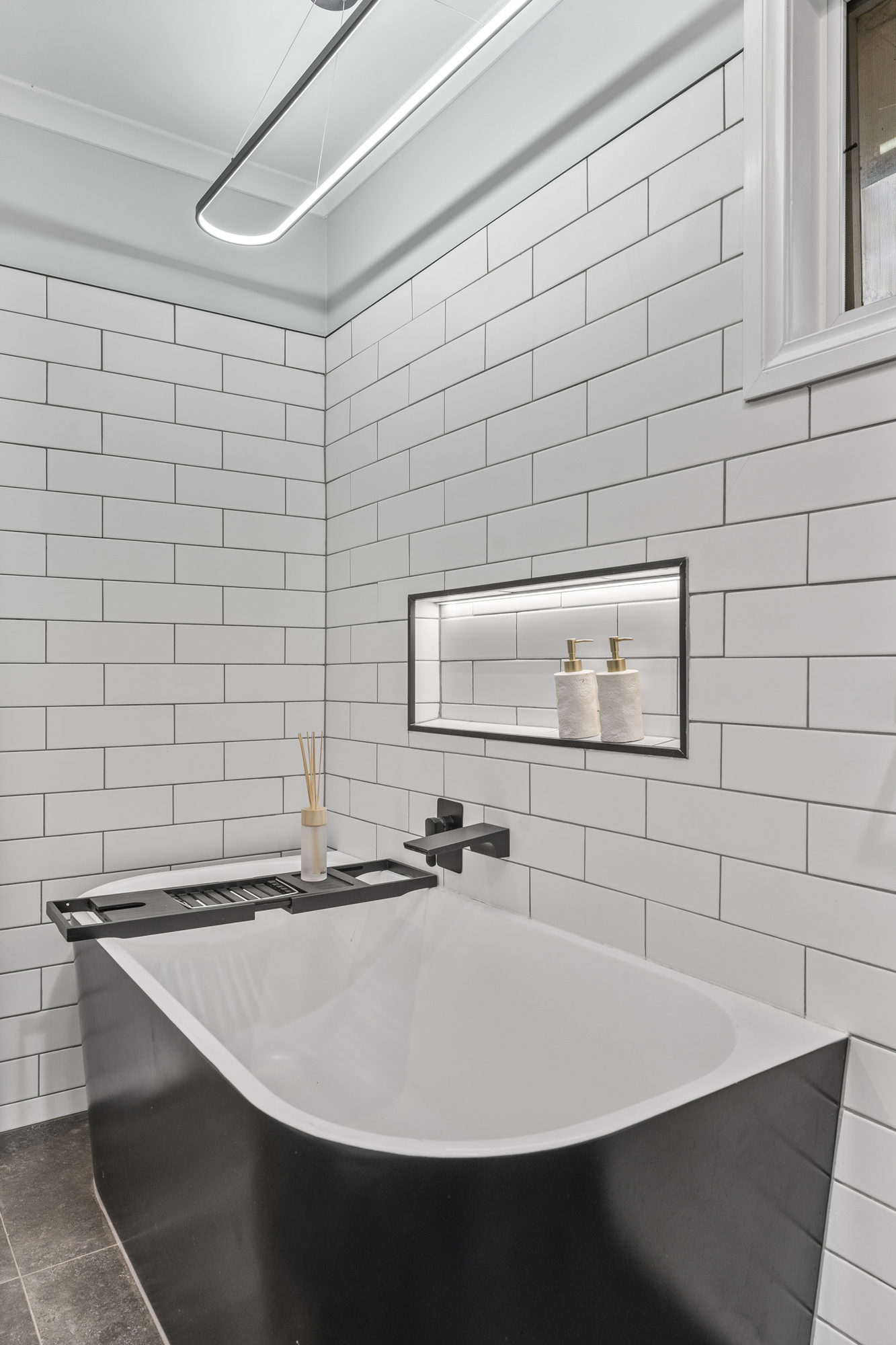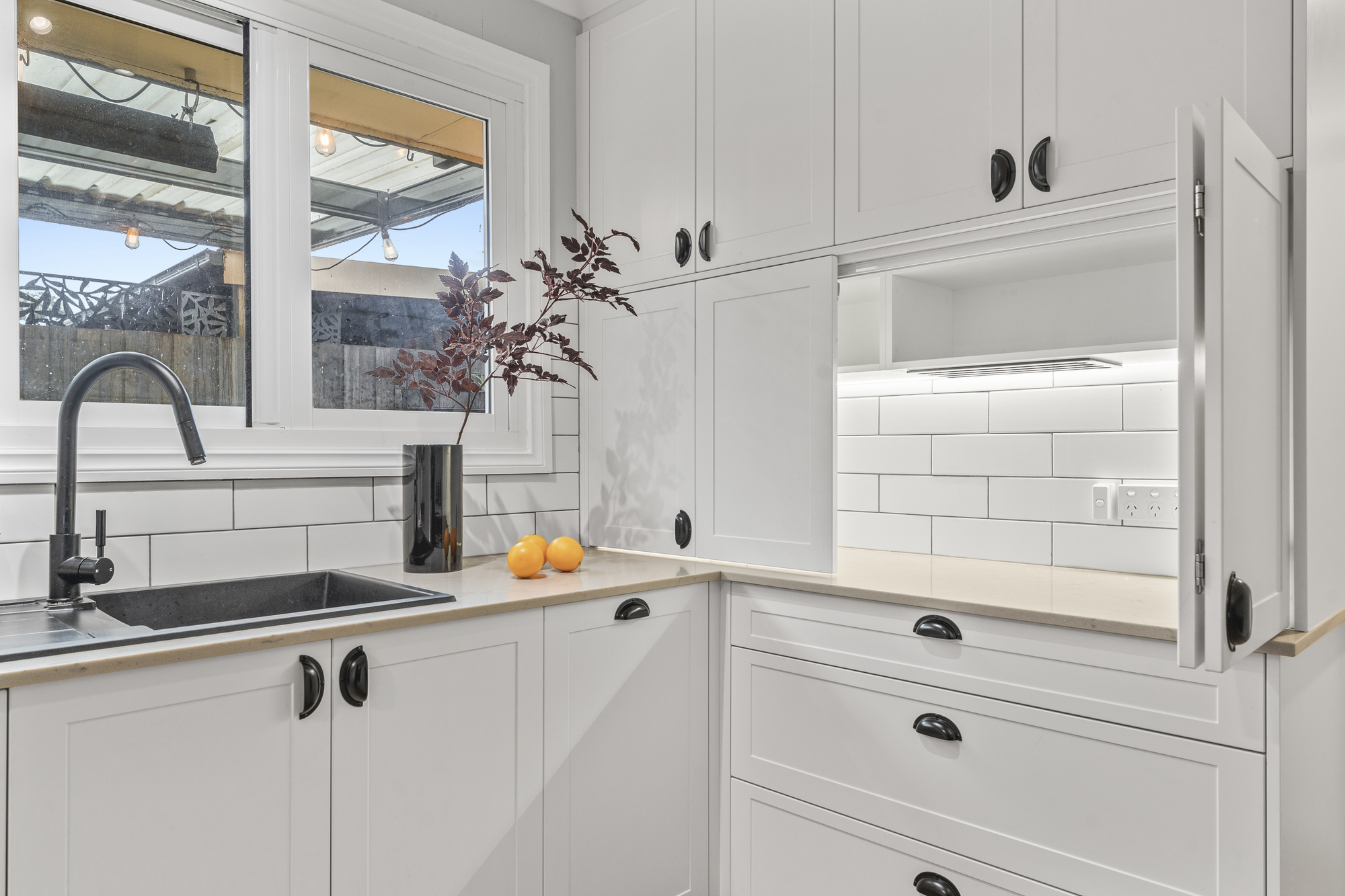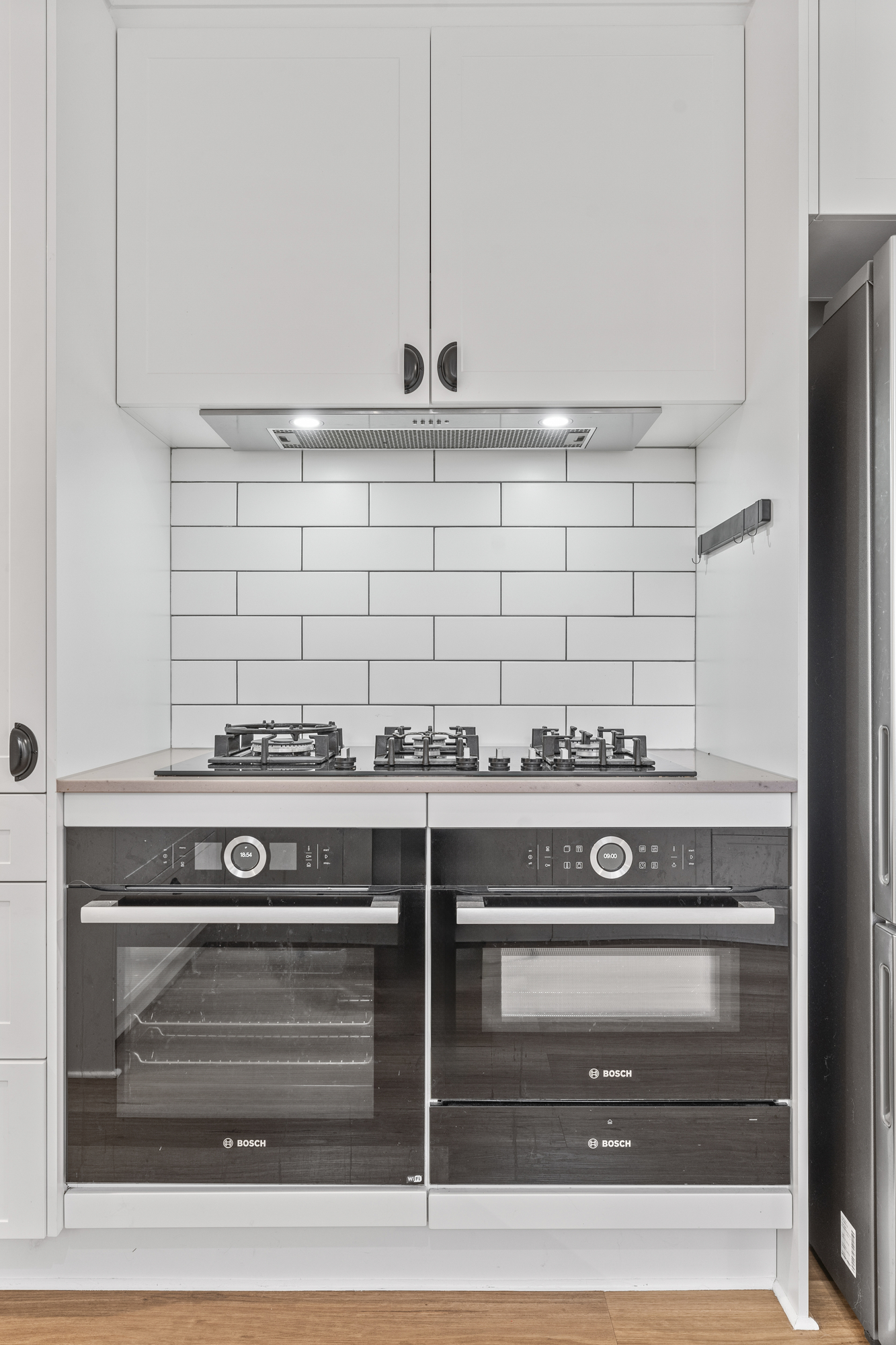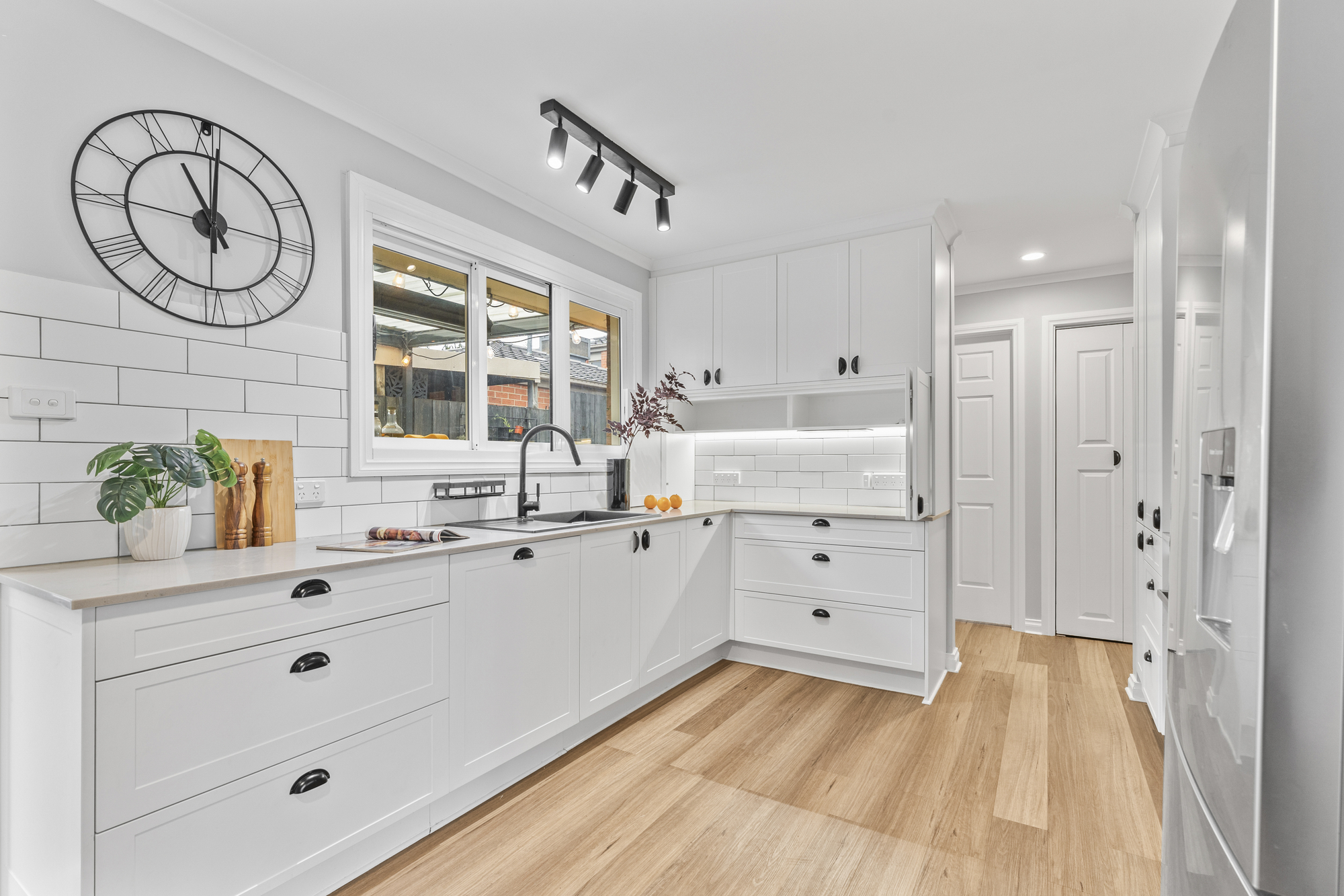 The ground level features large separate living and dining zones filled with natural light, enhanced by timber flooring, ducted heating, and evaporative cooling. The kitchen impresses with a marble stone countertop, Bosch appliances including a 5-burner gas stove, oven steamer and grill, concealed dishwasher, and a bifold door that hides the workspace when not in use. Feature lighting adds warmth and sophistication, while a bench extends outdoors to a new raised timber deck with a heater – perfect for entertaining.