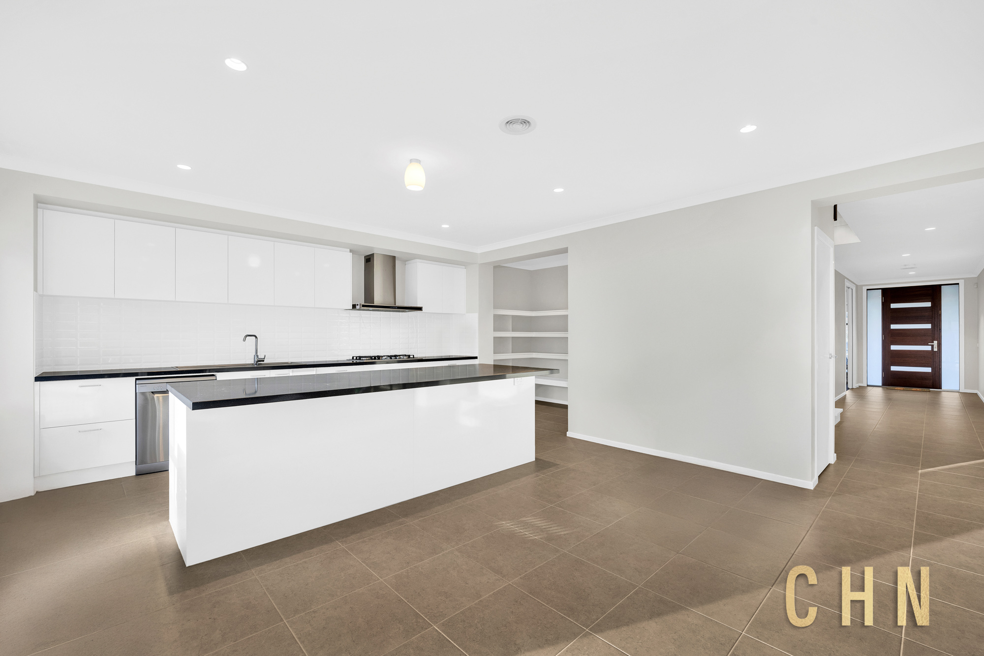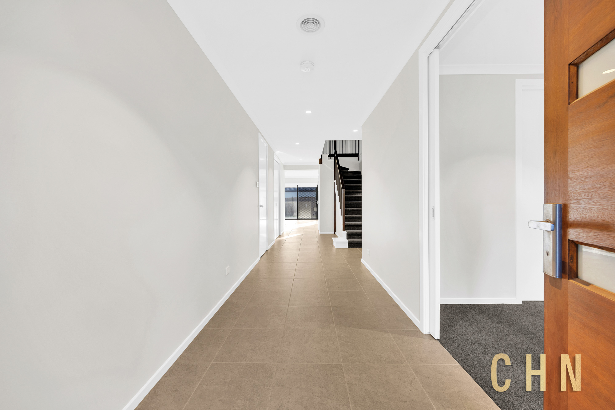 The home’s exterior boasts a low-maintenance landscaped front garden, exposed aggregate concrete driveway, and a roofed tiled porch that welcomes you inside through upgraded extra-tall doors. Step into the grand entrance, where LED downlights and the impressive high ceilings set the tone for the elegance within.