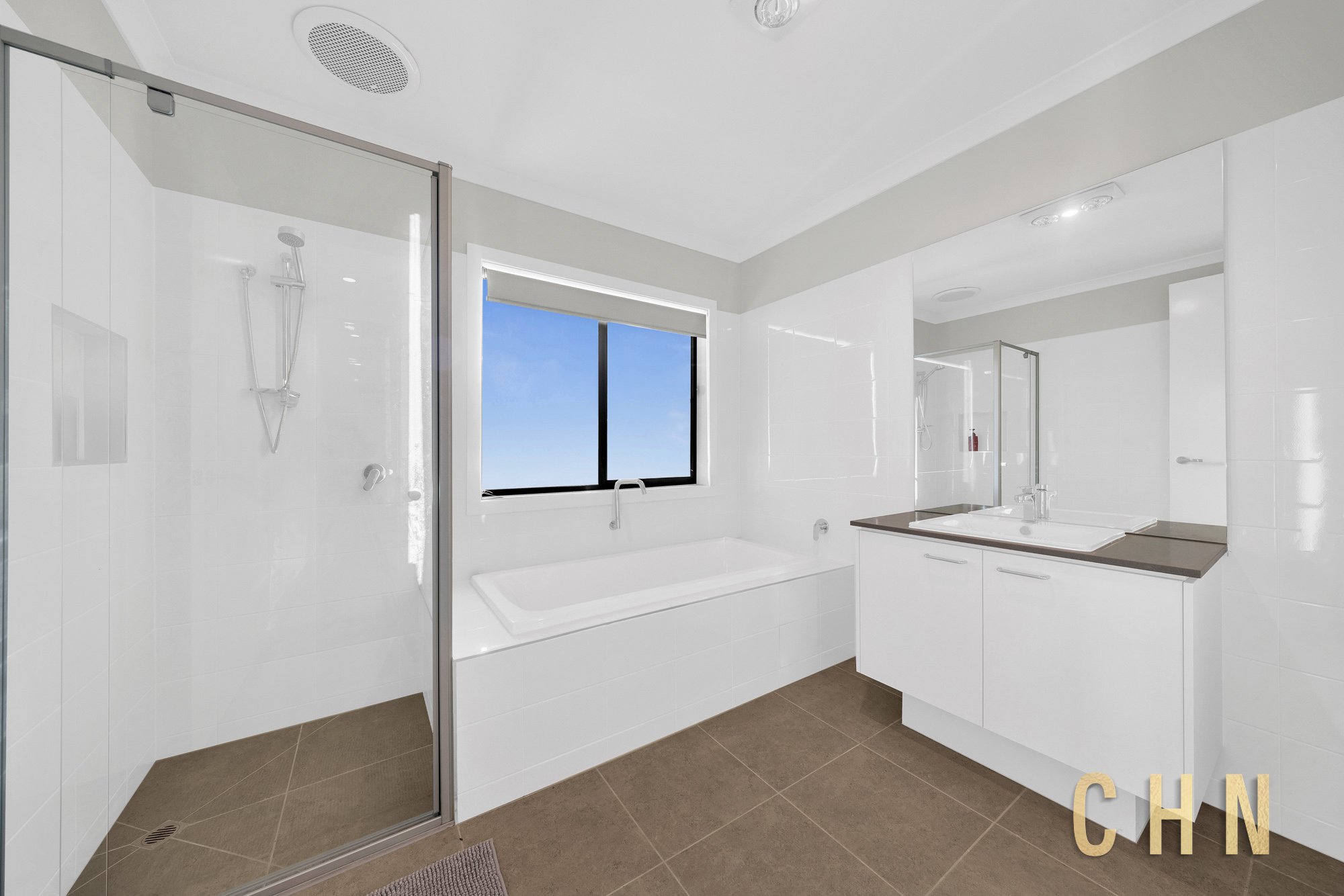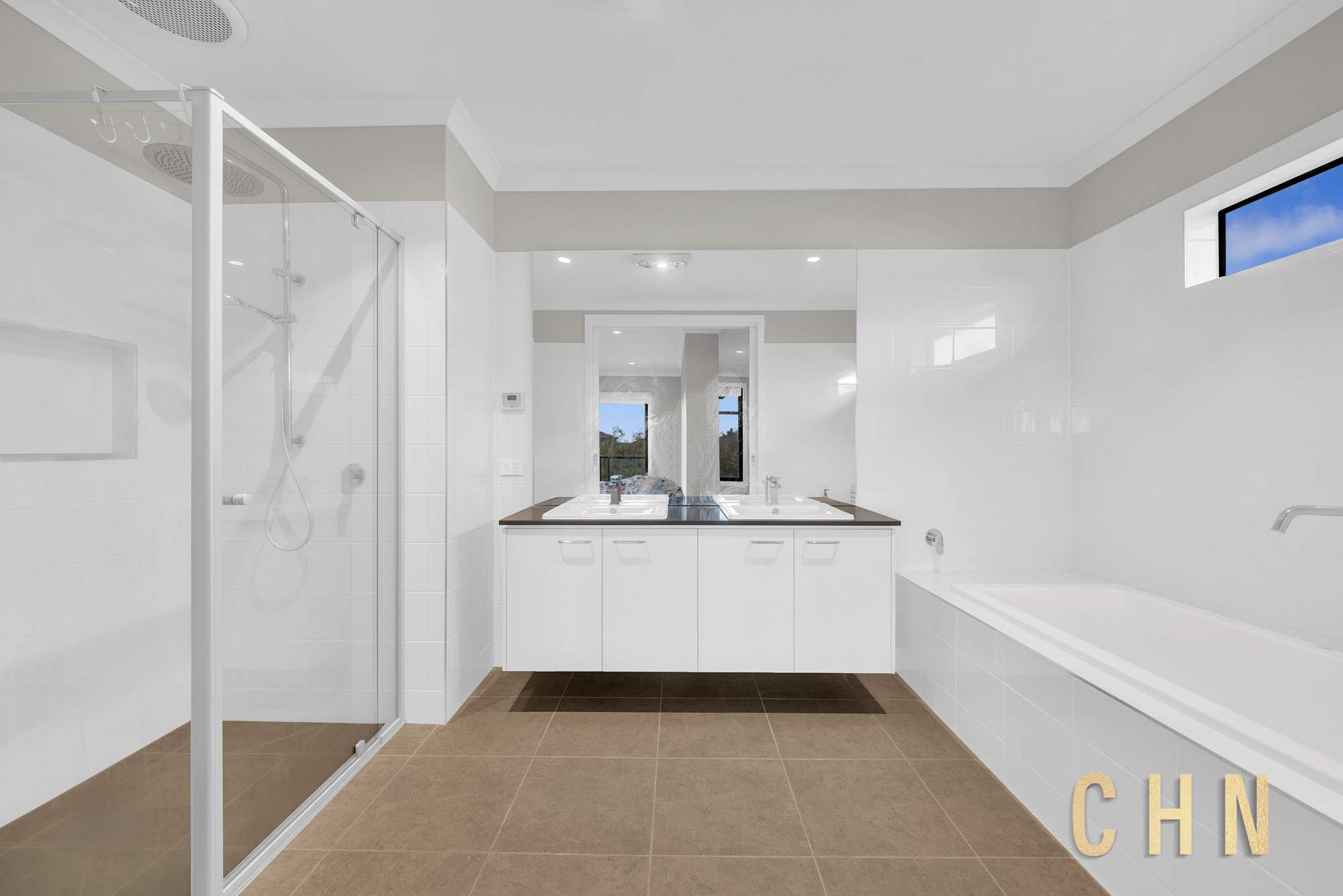 Upstairs, luxurious upgraded carpet complements the tall doors and continued high ceilings. A bright family retreat connects to three generous bedrooms, each with built-in robes and great views. The luxurious master suite is a private haven with a spacious roofed balcony, dimmable LED lighting, his-and-hers robes with mirrored doors, and a lavish ensuite boasting a dual vanity, sparkling bathtub, walk-in shower, and full-height tiling.