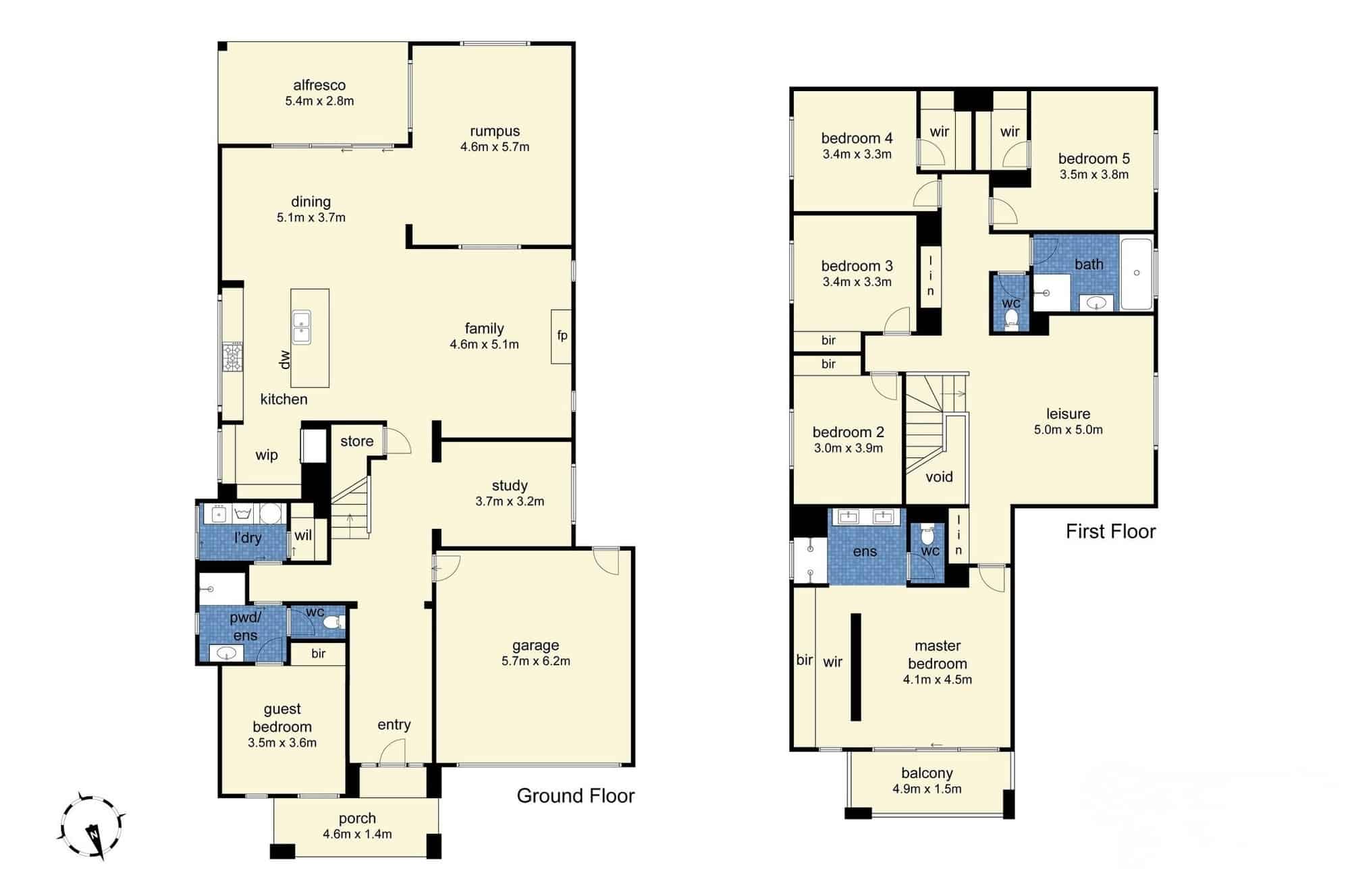 Six oversized bedrooms, plus a dedicated study, are complemented by three luxe bathrooms, including a ground-floor guest suite with ensuite and walk-in robe, and an opulent upstairs master retreat with private balcony, walk-in robe, and dual-vanity ensuite, offering exceptional flexibility for large or extended families.