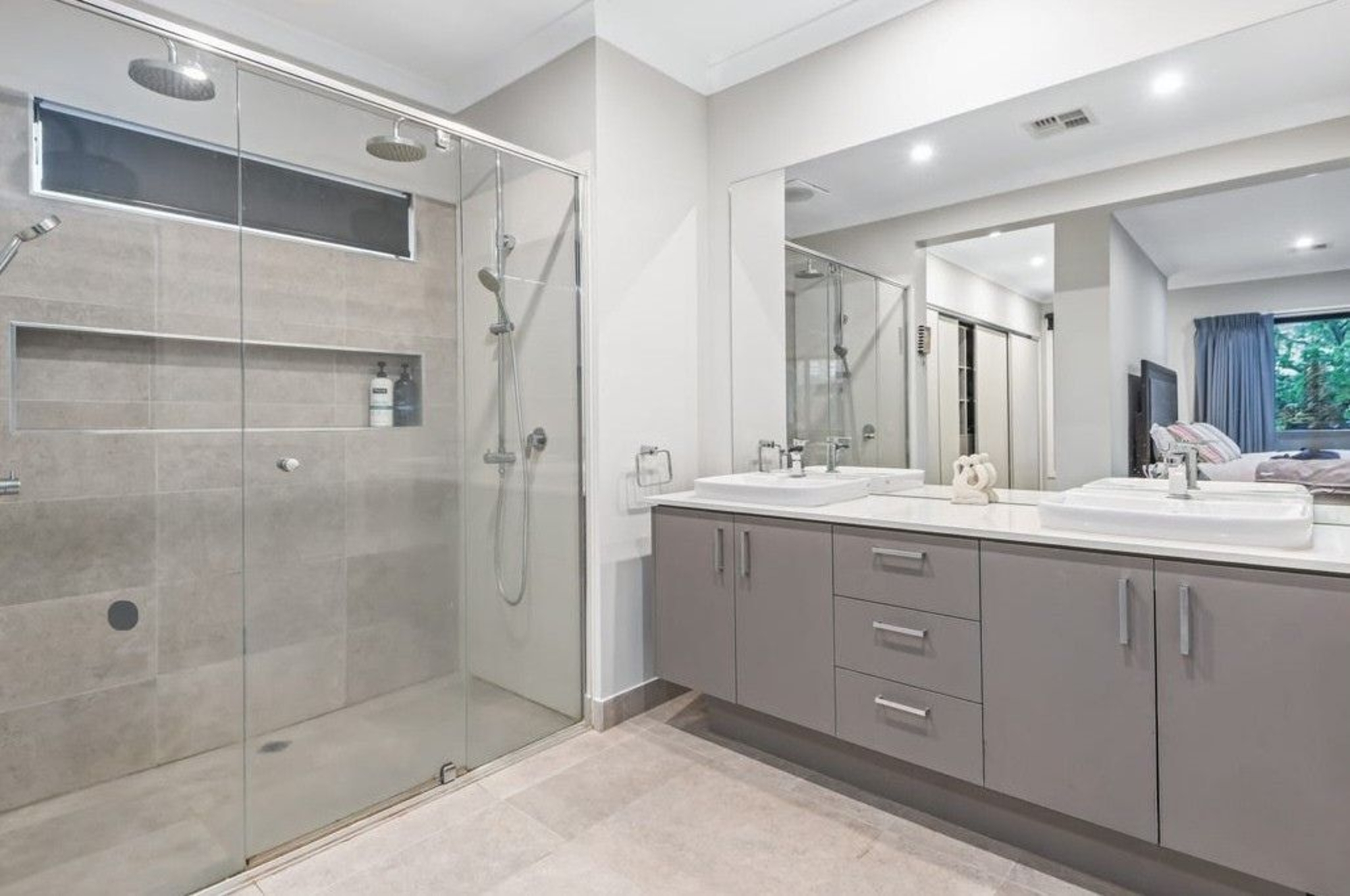 Three modern, fully tiled bathrooms feature sleek fixtures, stone vanities, frameless showers, and stylish finishes throughout, delivering a contemporary, high-end feel.