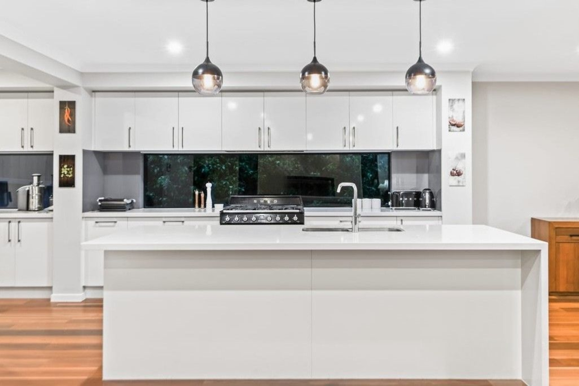 A separate full-sized laundry with excellent storage and outdoor access offers practical family living. The designer kitchen boasts sleek stone benchtops, premium stainless steel appliances, ample cabinetry, and a generous island bench, perfect for entertaining or family meals