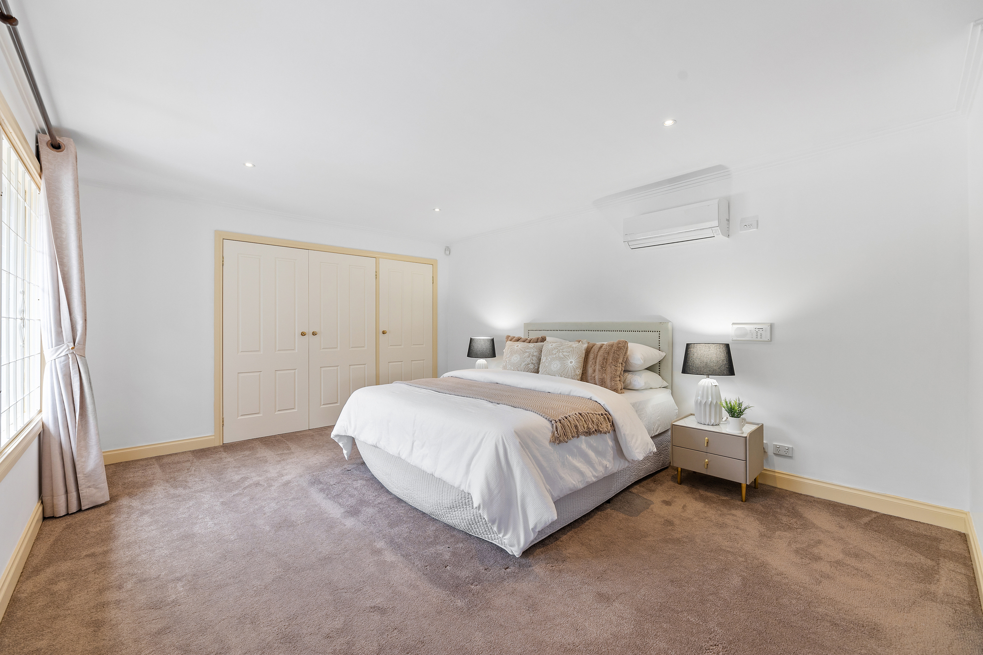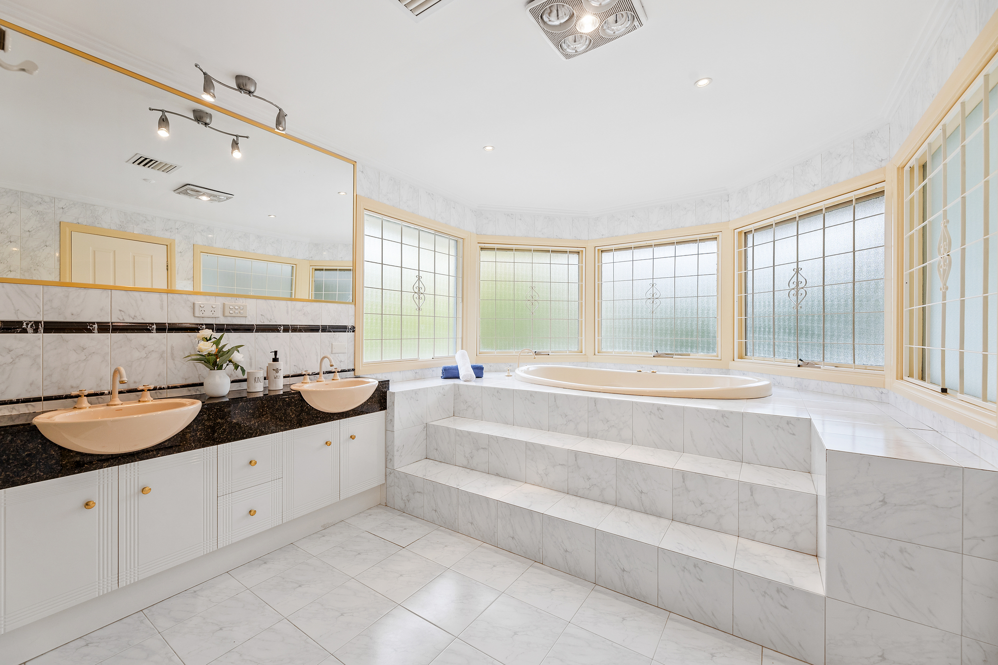 Five generously sized bedrooms all come with built-in wardrobes and their own split system heating and cooling. The master suite is a true retreat – expansive in size with a luxurious ensuite featuring a separate bath, shower, double vanity, and hot tub. A tiled laundry room with external access, three bathrooms (two with full baths), a powder room, and under-stair storage ensure everyday convenience.