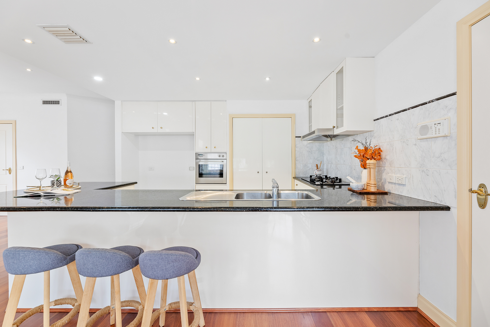 Beyond the high brick fence and secure electric gate lies a beautifully presented home, ideal for growing families or multi-generational living. Inside, you’re greeted by warm timber floorboards throughout the ground level and an abundance of natural light streaming through large windows. Multiple living and dining zones cater to formal entertaining and casual family moments, while the heart of the home – a large, tiled kitchen – is a cook’s dream. Enjoy premium finishes including stone benchtops, a double overmount sink, Blanco oven, Fotile gas stove, Dishlex dishwasher, and a breakfast bar that seats four comfortably. The charming bay window in the breakfast area invites morning sunshine and garden views.