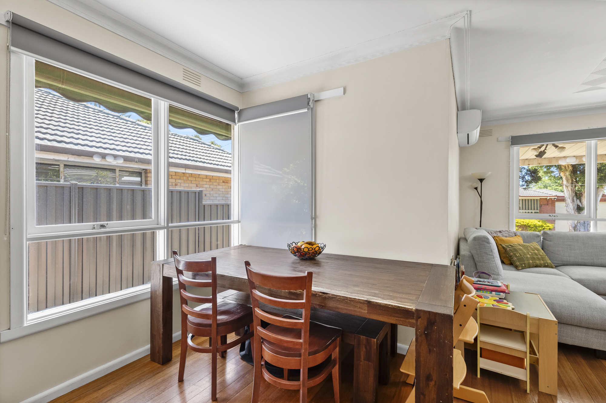 The home features a welcoming front porch and a practical single-level layout with a combination of timber and tiled flooring throughout. Split-system heating and cooling provide year-round comfort, while blinds throughout offer privacy and light control.