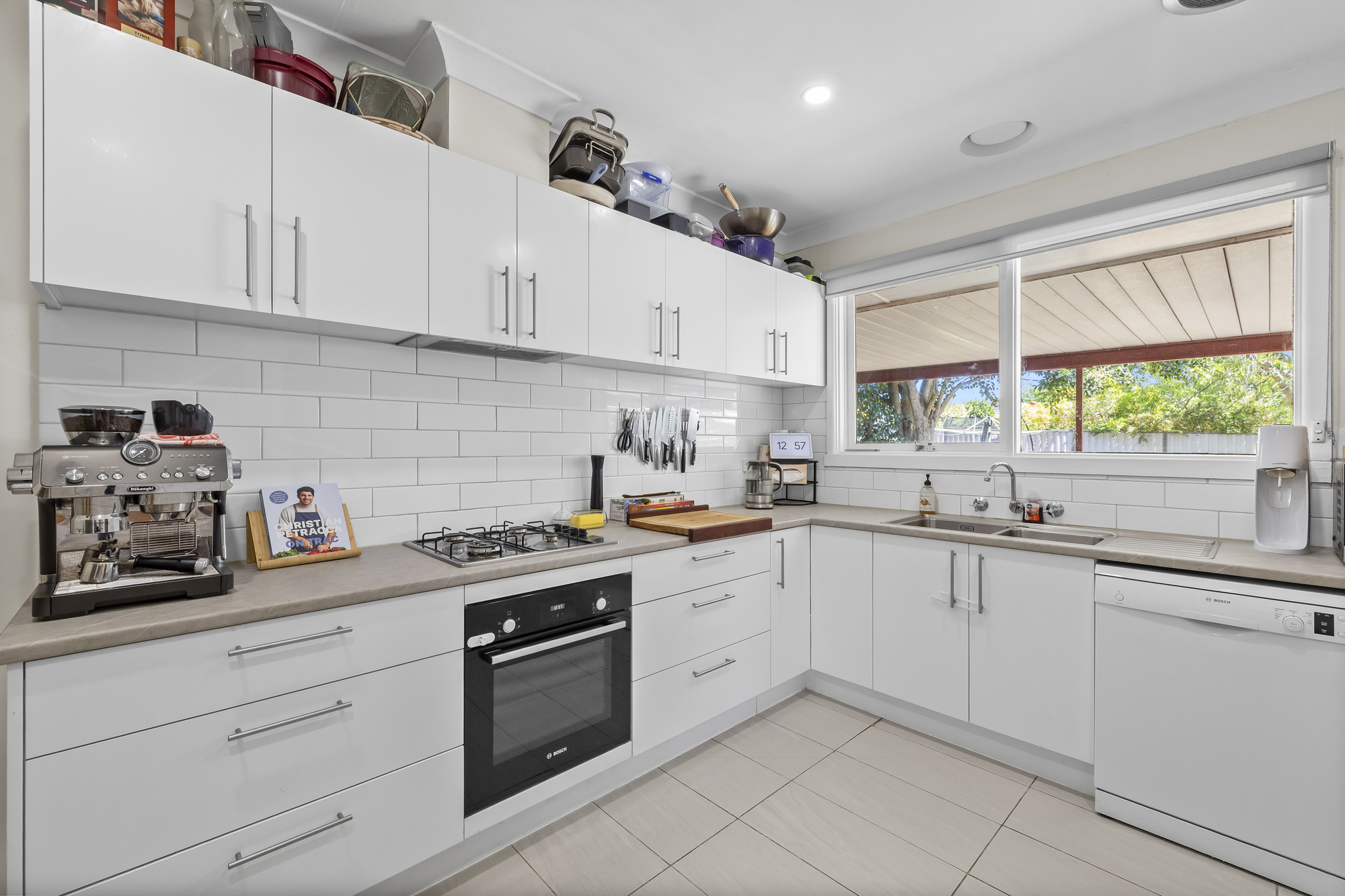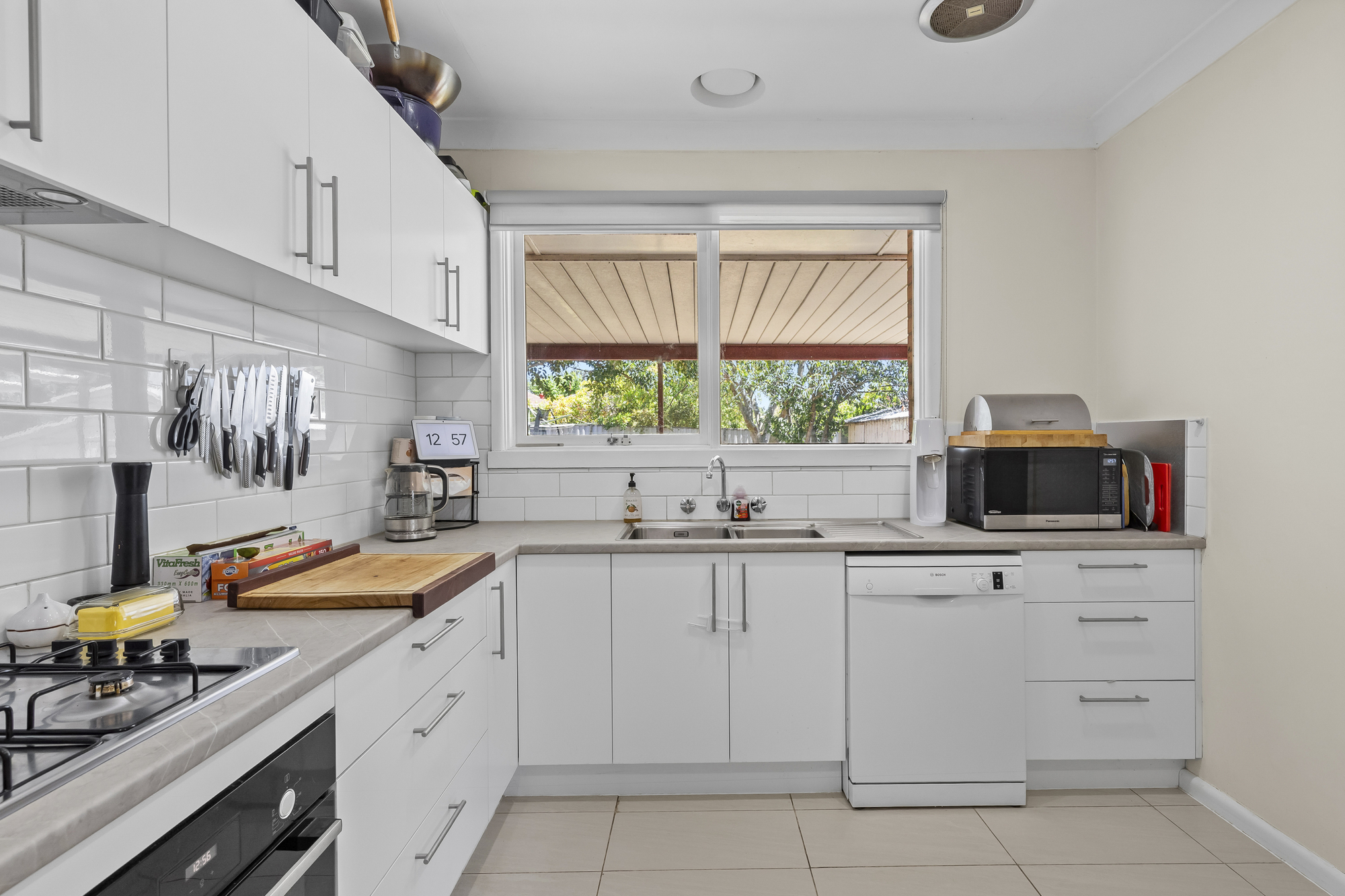 The kitchen is functional and well positioned, finished with white cabinetry and tiled splashback, and equipped with Bosch appliances including a four-burner gas cooktop, electric oven, and dishwasher. The L-shaped layout offers efficient bench space and connects easily with the main living areas.