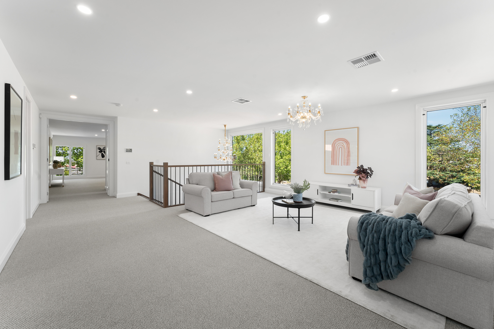 Additional highlights include a living / private home theatre, executive study, zoned heating and cooling, mudroom, dedicated meeting space, internal-access double garage, and charming Juliet balconies that add architectural character.