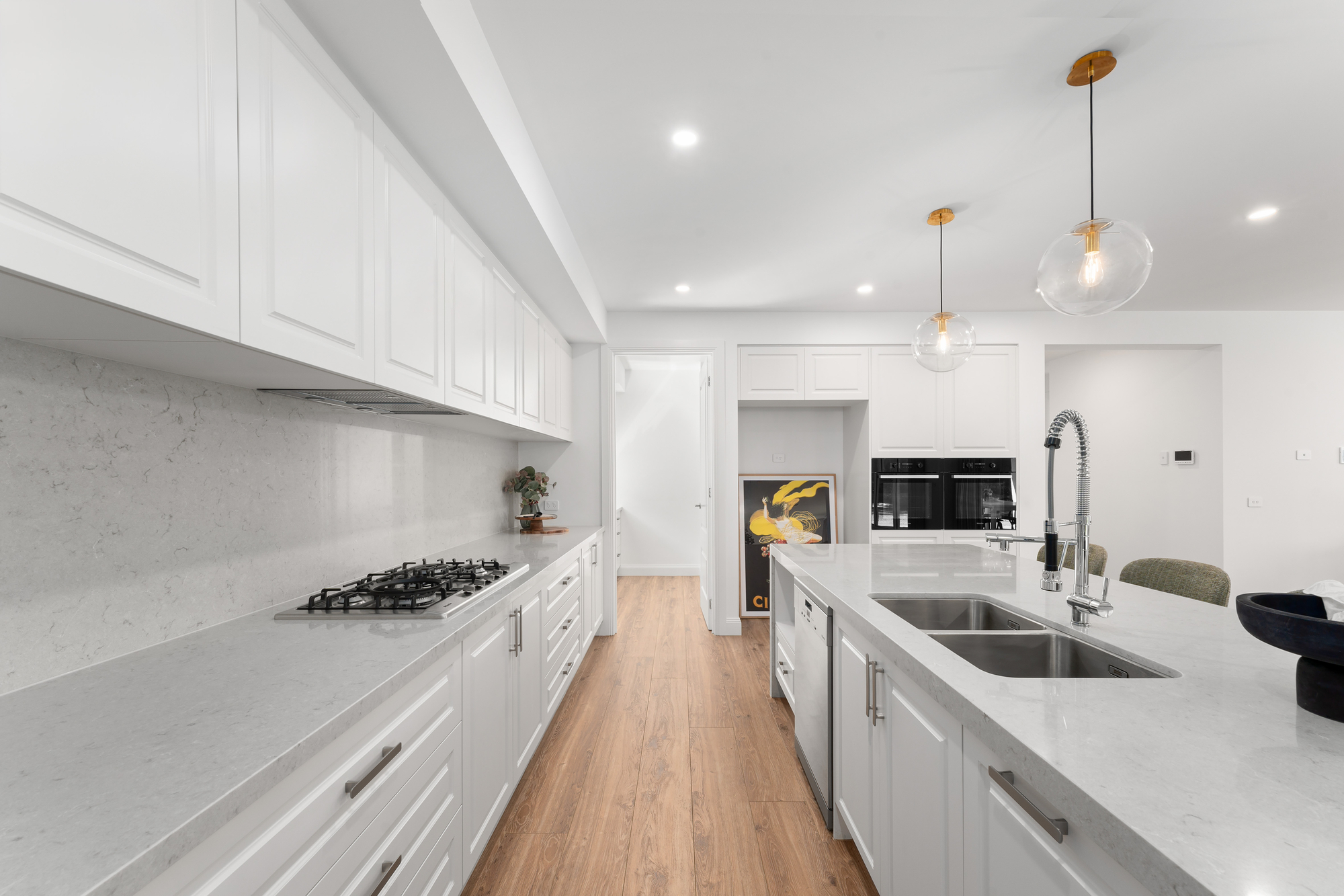 Introduced by an elegant French Provincial façade framed by landscaped gardens, the home opens to expansive, light-filled interiors where timeless design meets modern comfort. A formal lounge and dining area create an immediate sense of sophistication, while the stunning kitchen — appointed with premium stone finishes, integrated Miele appliances, and extensive custom cabinetry — forms the heart of the home. A concealed butler’s pantry enhances functionality, ideal for effortless entertaining.