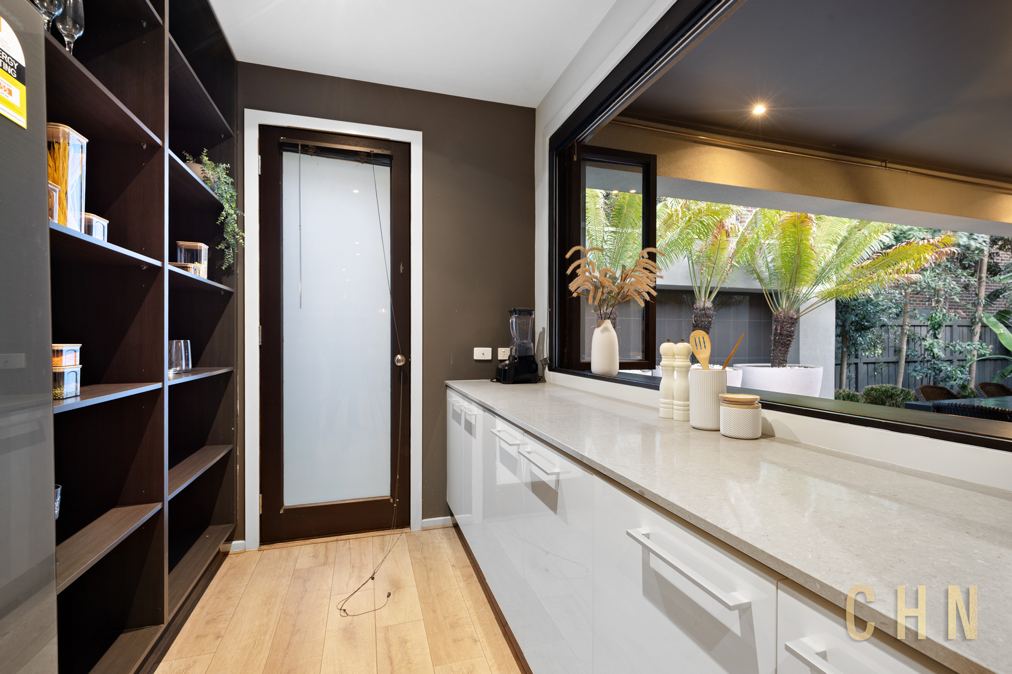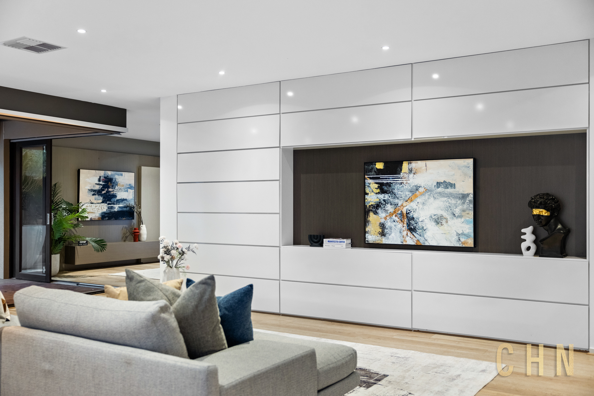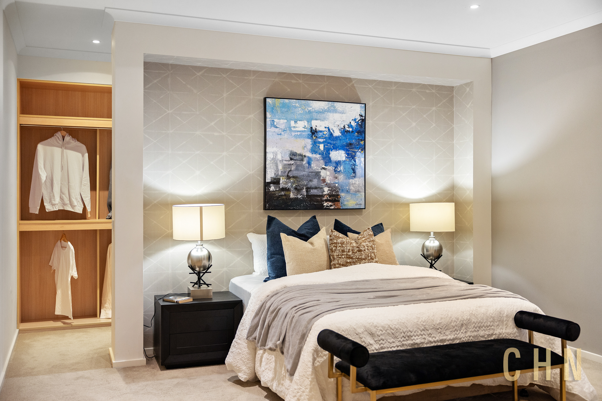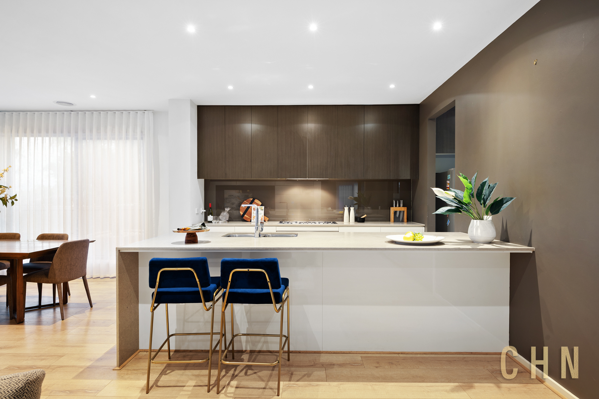 From the moment you enter, the quality is evident. High ceilings and LED downlights illuminate the inviting floorboard-led living areas. The heart of the home is a chef’s dream kitchen, featuring a stunning waterfall stone benchtop, a full suite of 900mm SMEG appliances, and a butler’s pantry with its own secondary stone island. The ingenious folding glass windows open completely to the elevated alfresco deck, perfect for indoor-outdoor entertaining.