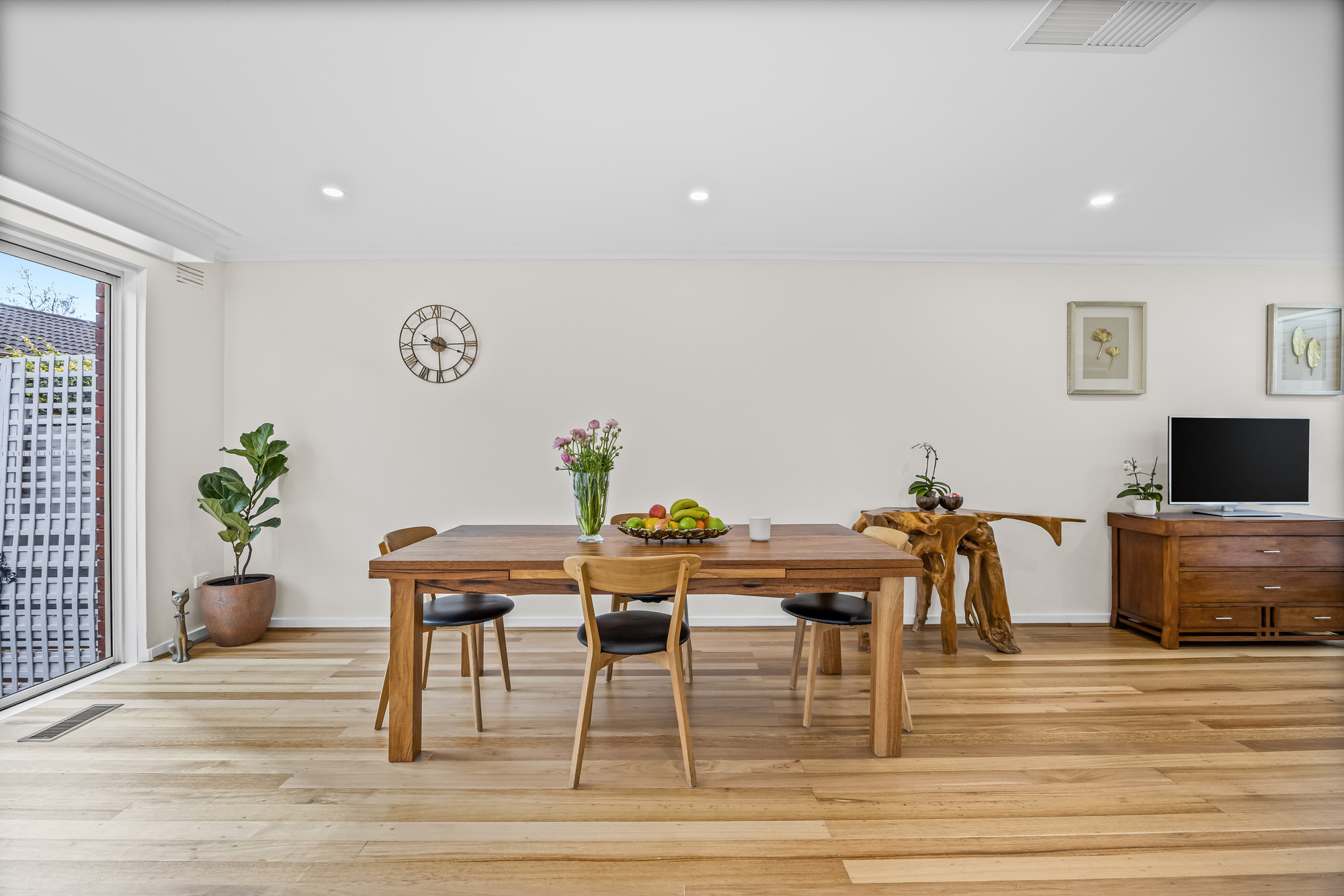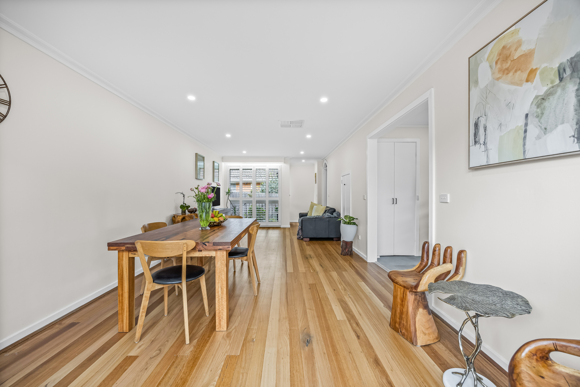 Step inside to discover open-plan living and dining with hardwood floors, abundant natural light, and a north-facing orientation. Plantation shutters frame the windows, while sliding doors open to a decked entertaining area and two private low-maintenance courtyards. A brand-new kitchen, less than one year old, is fitted with Bosch appliances, an induction cooktop, electric oven, stone benchtops, and sleek black finishes, with direct access from the garage.