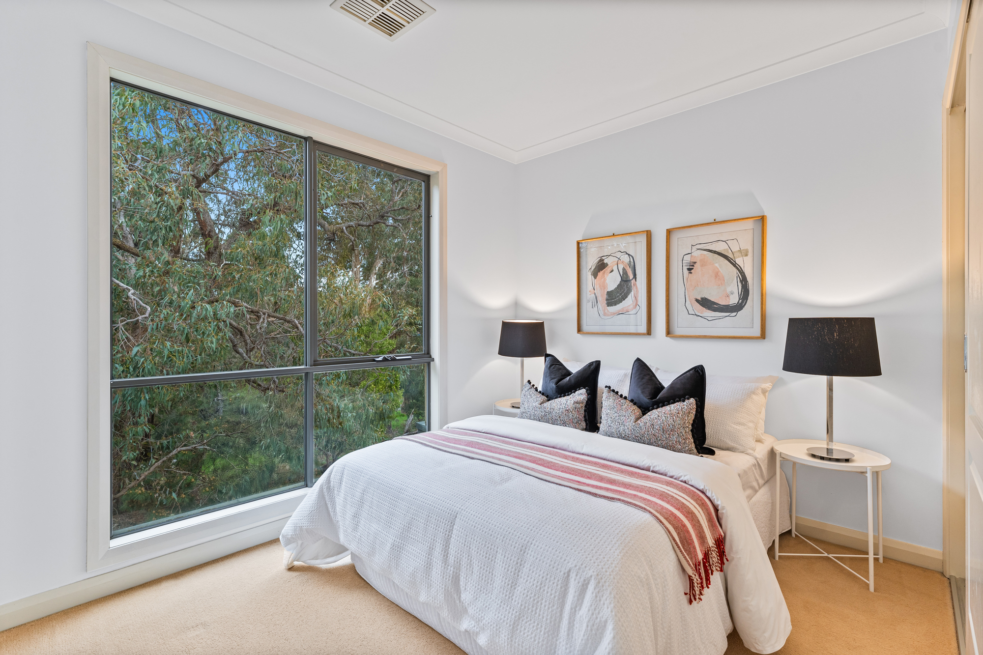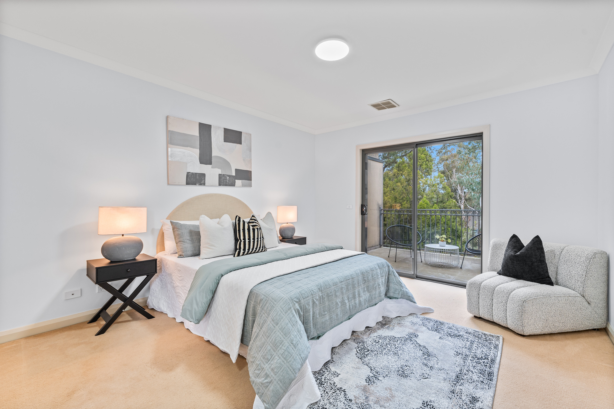 Accommodation is generous, with a master bedroom complete with walk-in robe, large ensuite, and a private balcony overlooking the backyard and leafy greenery. Additional bedrooms are well-serviced by a central bathroom, while a full laundry adds to the home’s practicality. Centralised heating and cooling ensure comfort throughout the seasons.