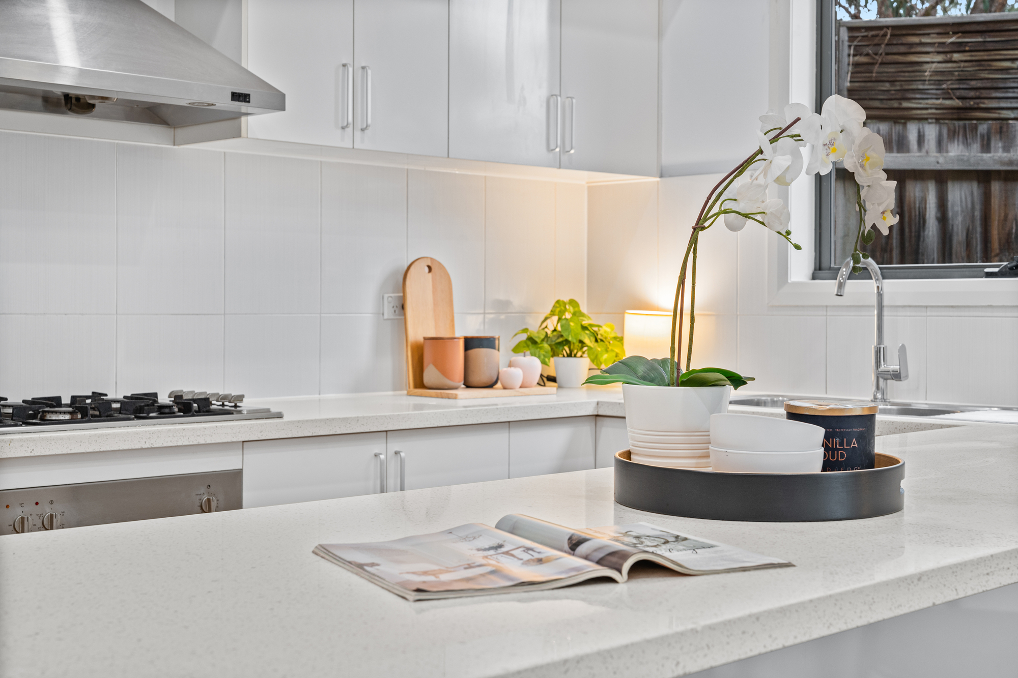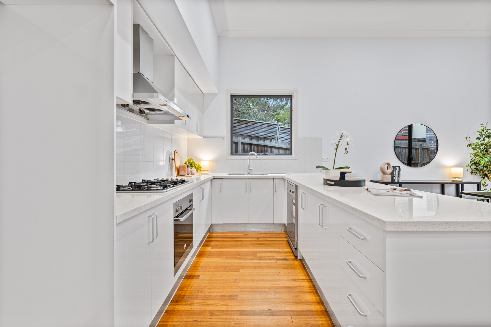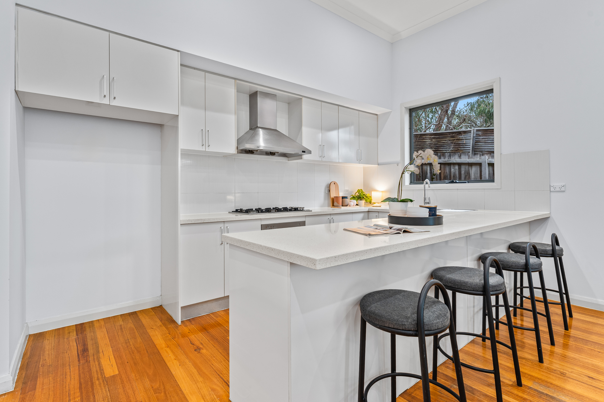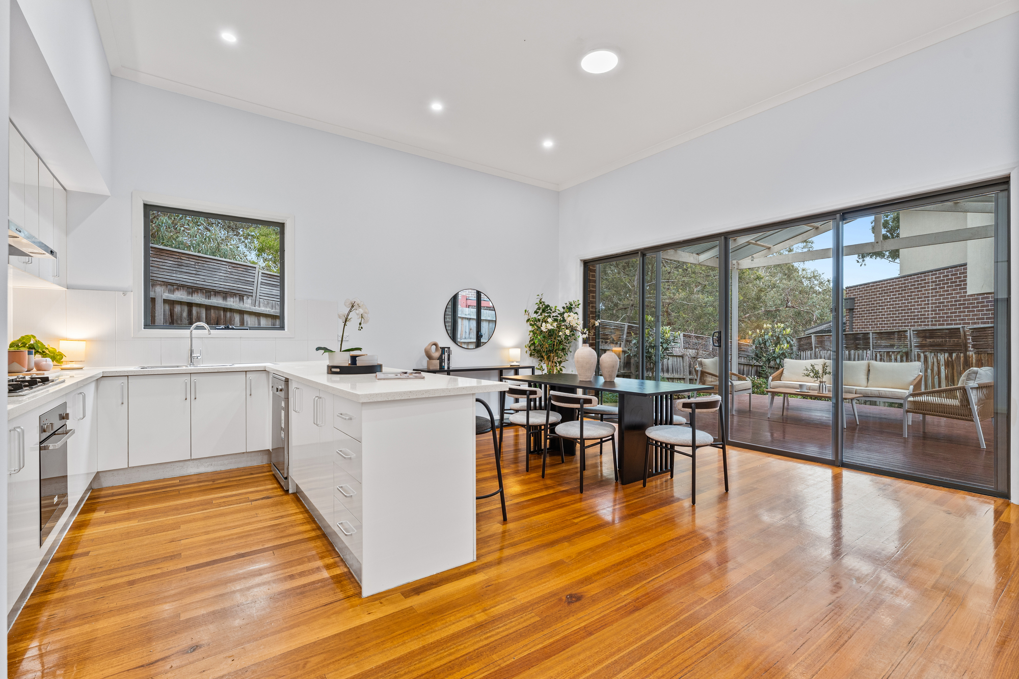 Spread across two well-planned levels, the home features timber flooring throughout the ground floor and plush carpet in the upstairs bedrooms, creating a warm and welcoming feel. The open-plan living and dining area flows seamlessly to a large undercover timber deck patio – perfect for year-round entertaining. A breakfast bar enhances the stylish kitchen, which is appointed with a six-burner gas stove and excellent storage, including under-stair options.