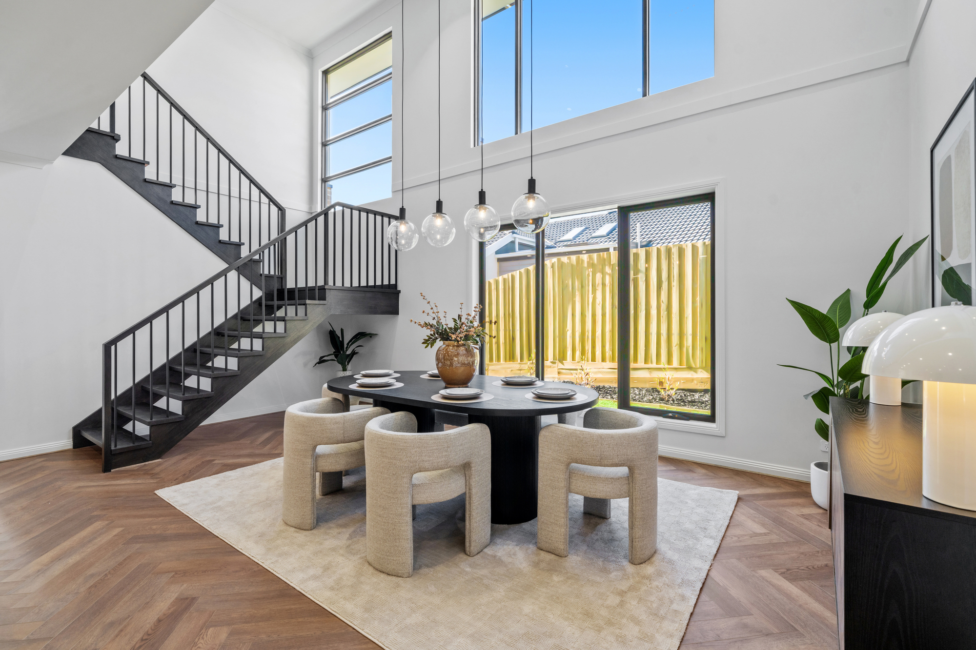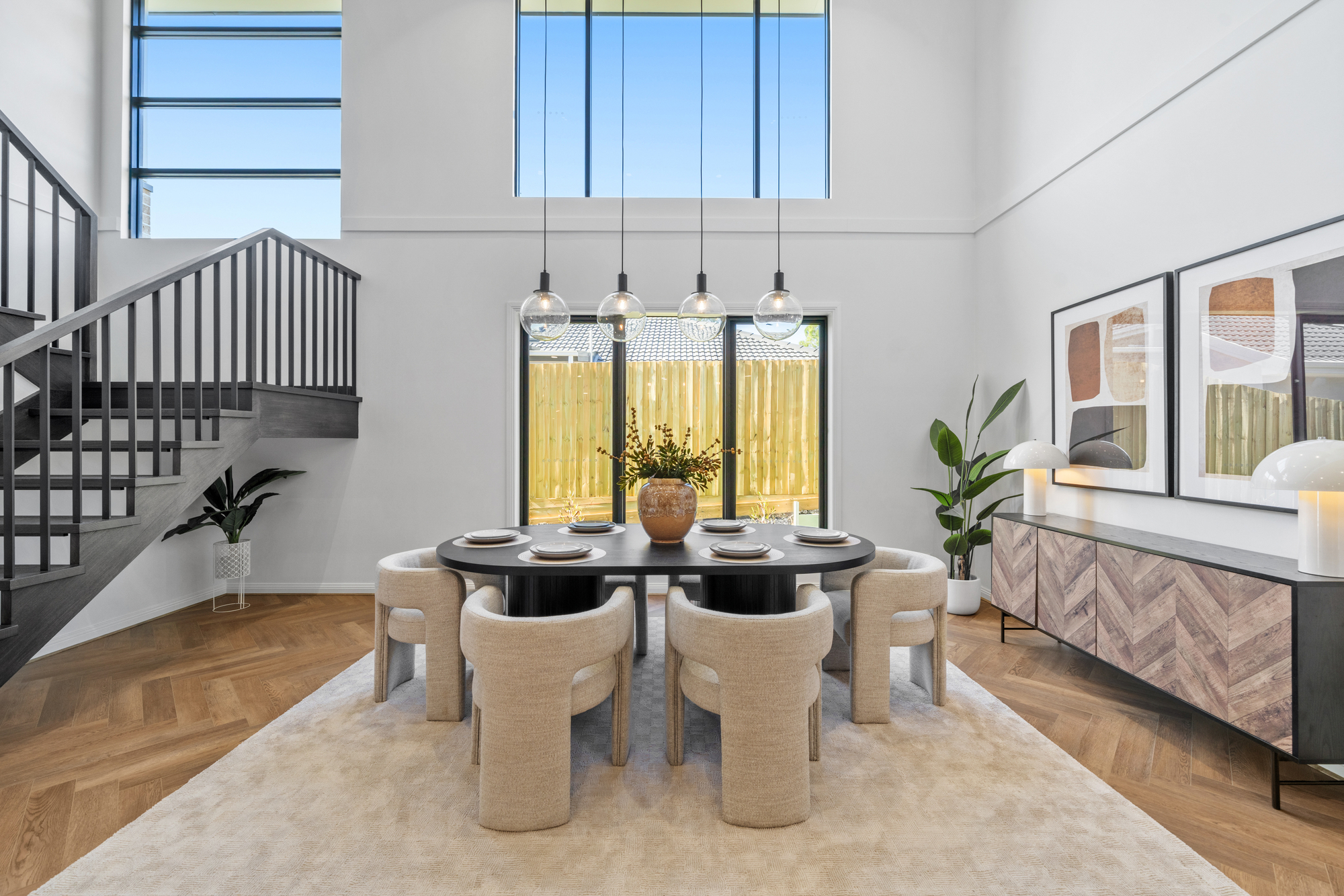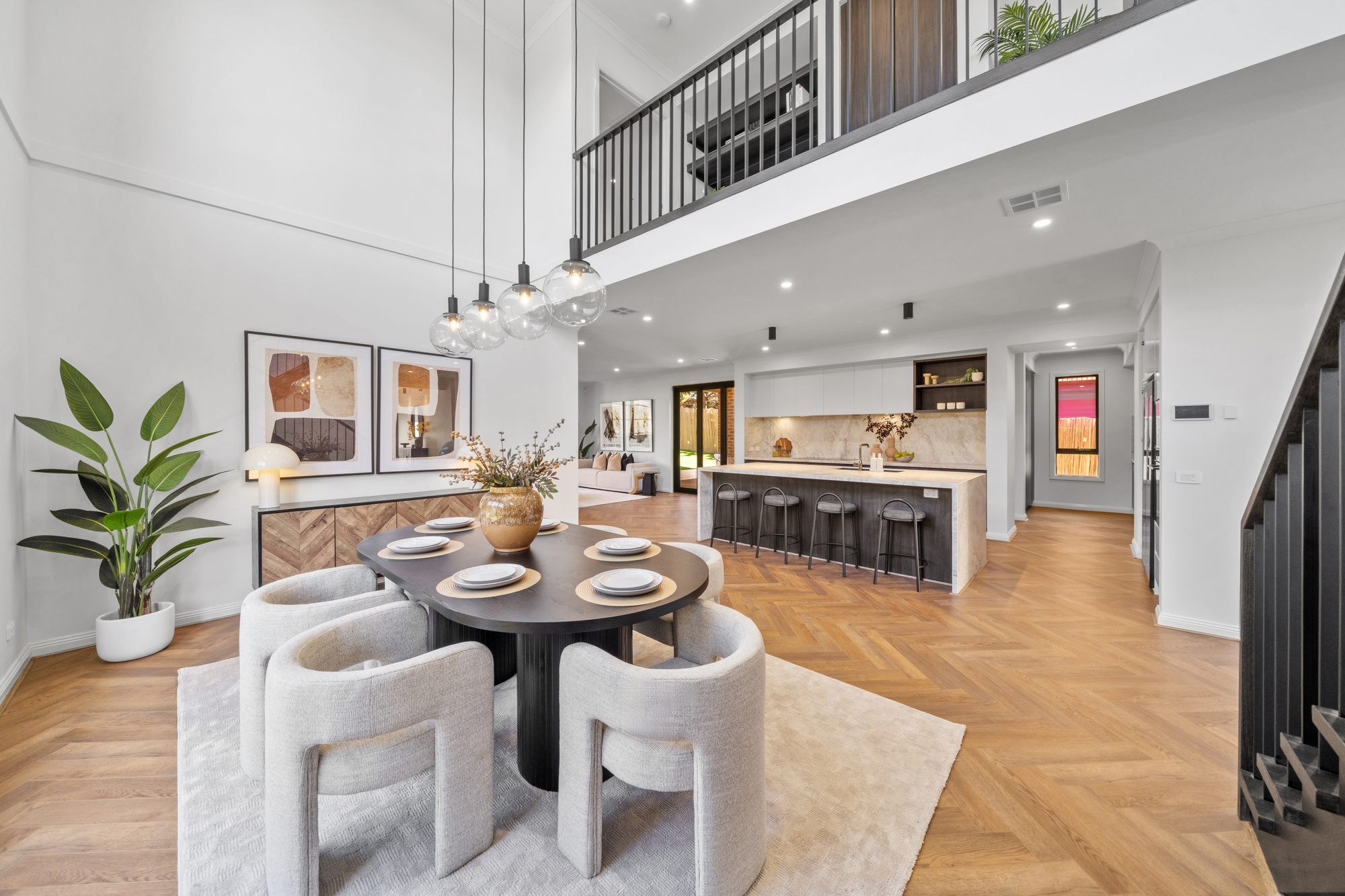 The main living and dining zone is expansive and light-filled, highlighted by statement herringbone timber flooring and large picture windows framing landscaped garden outlooks. A feature wall with custom joinery anchors the lounge space, while wide sliding glass doors create seamless indoor–outdoor flow. The impressive double-height dining area adds architectural scale, enhanced by designer pendant lighting that establishes a striking focal point for luxurious everyday living and entertaining.
