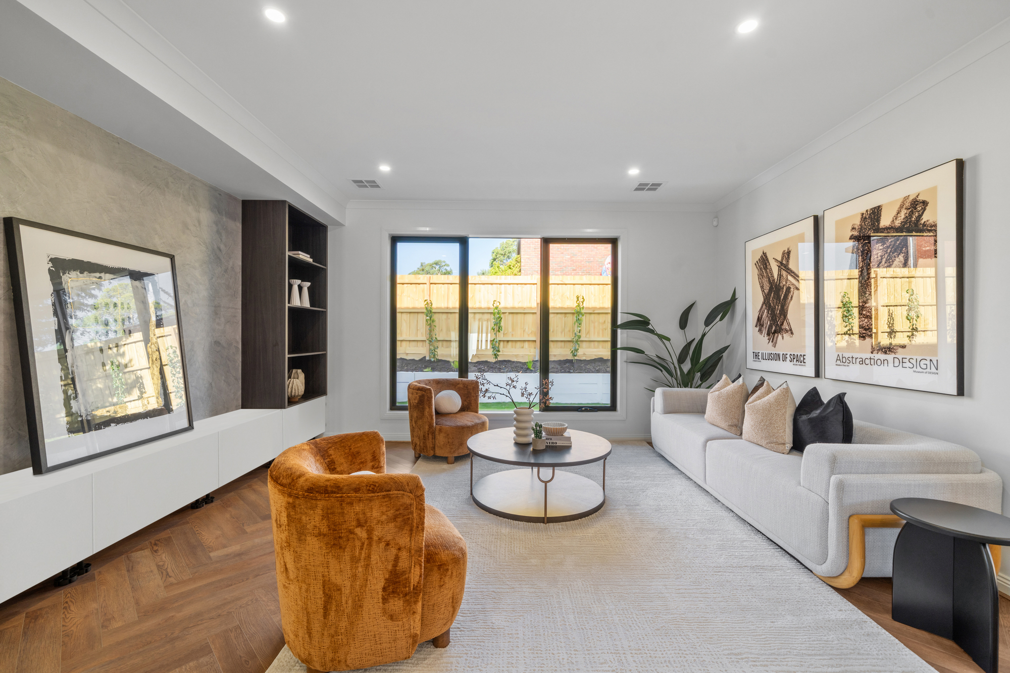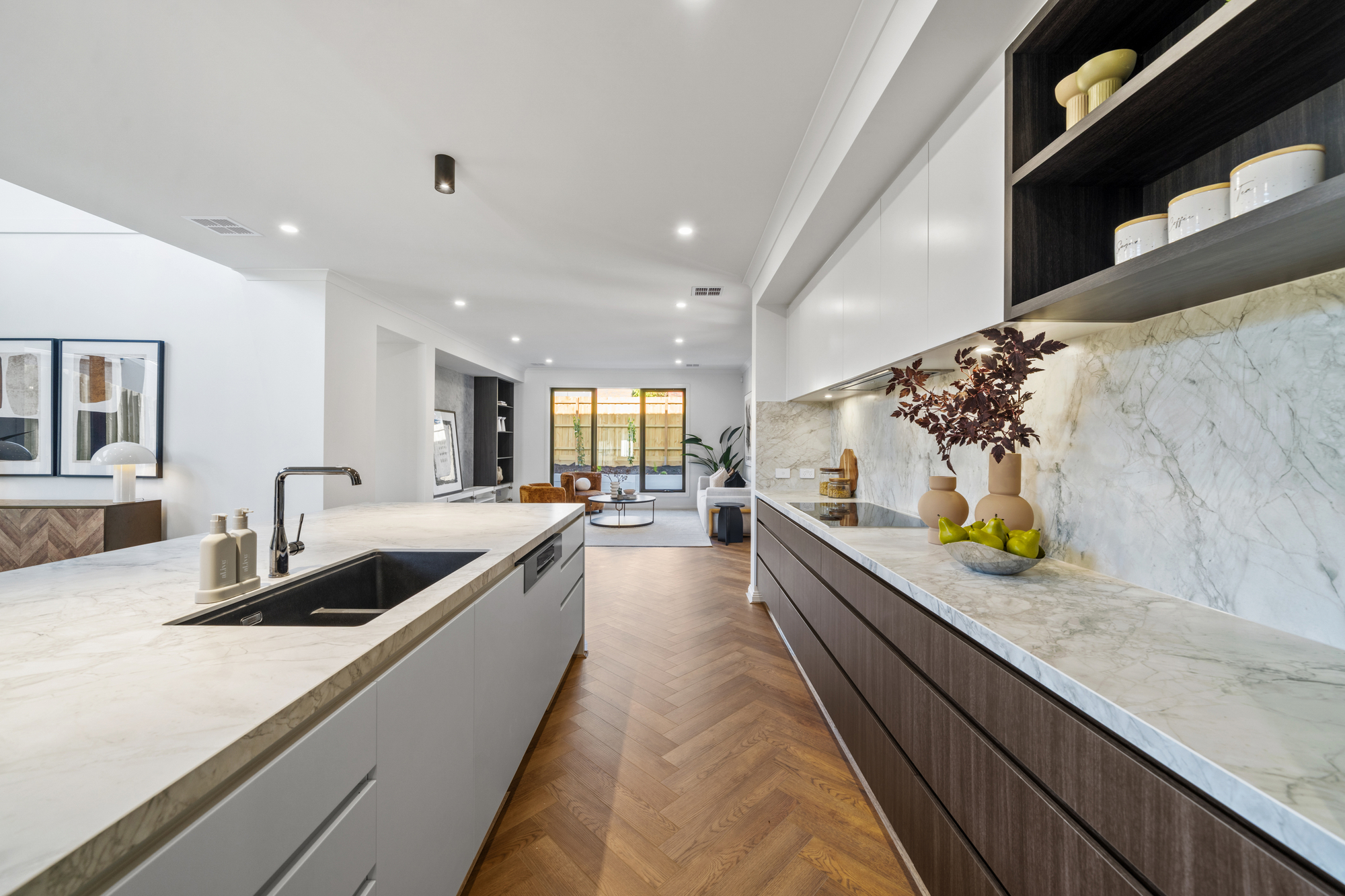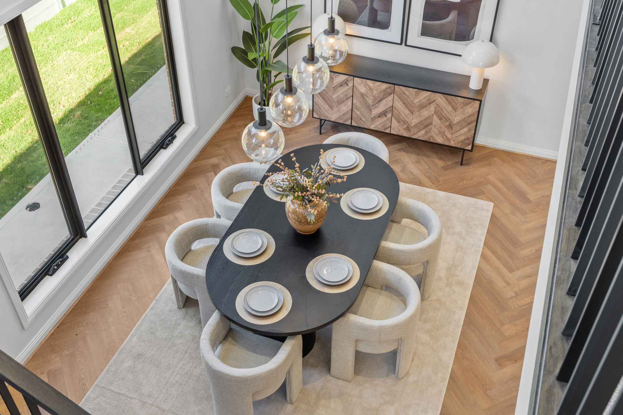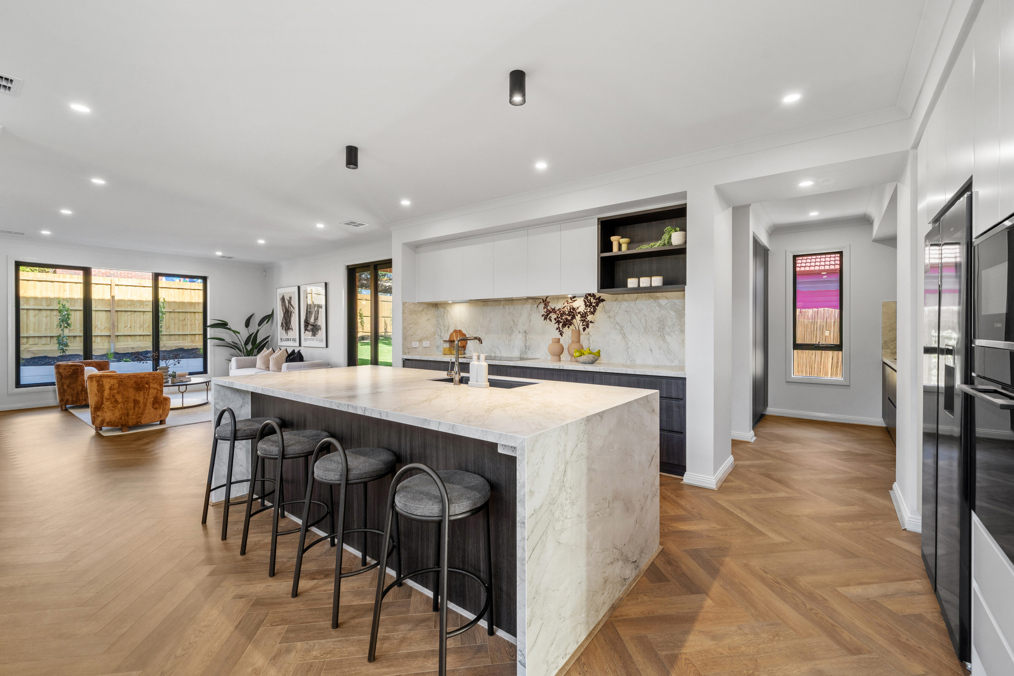The main living and dining zone is expansive and light-filled, highlighted by statement herringbone timber flooring and large picture windows framing landscaped garden outlooks. A feature wall with custom joinery anchors the lounge space, while wide sliding glass doors create seamless indoor–outdoor flow. The impressive double-height dining area adds architectural scale, enhanced by designer pendant lighting that establishes a striking focal point for luxurious everyday living and entertaining.