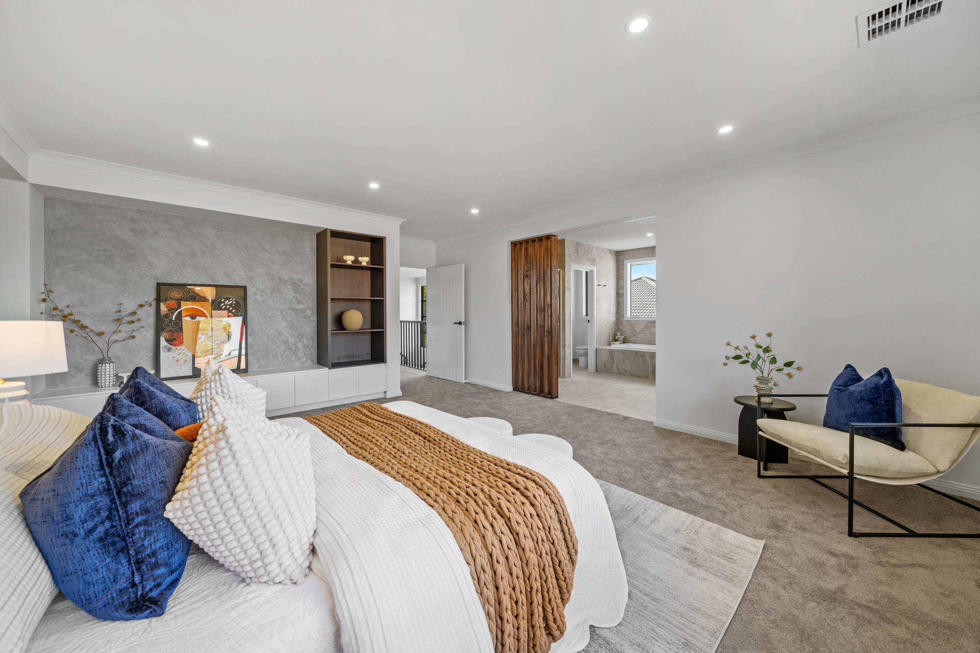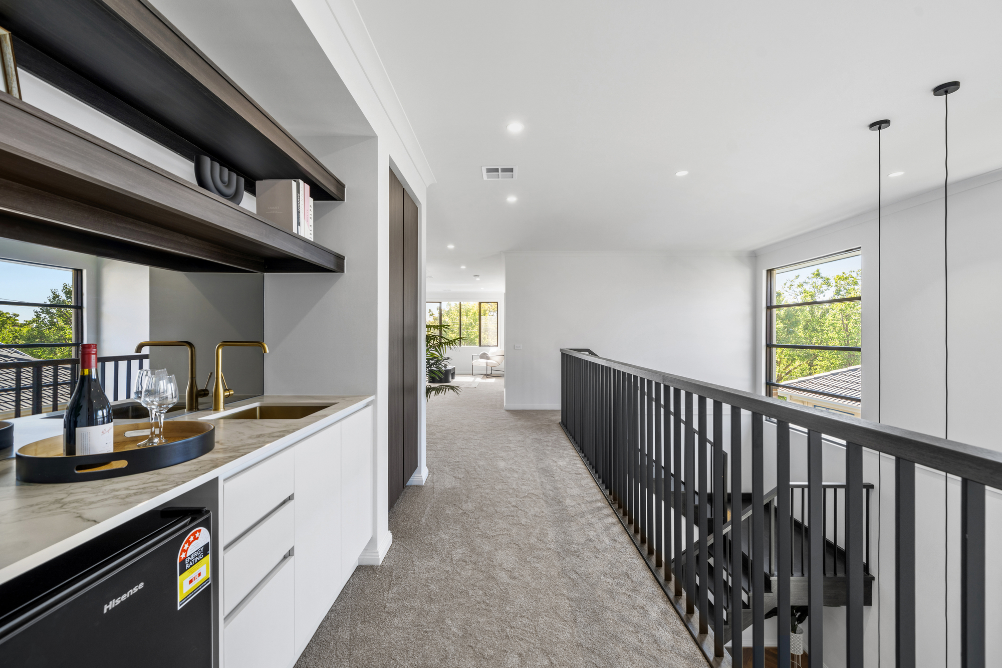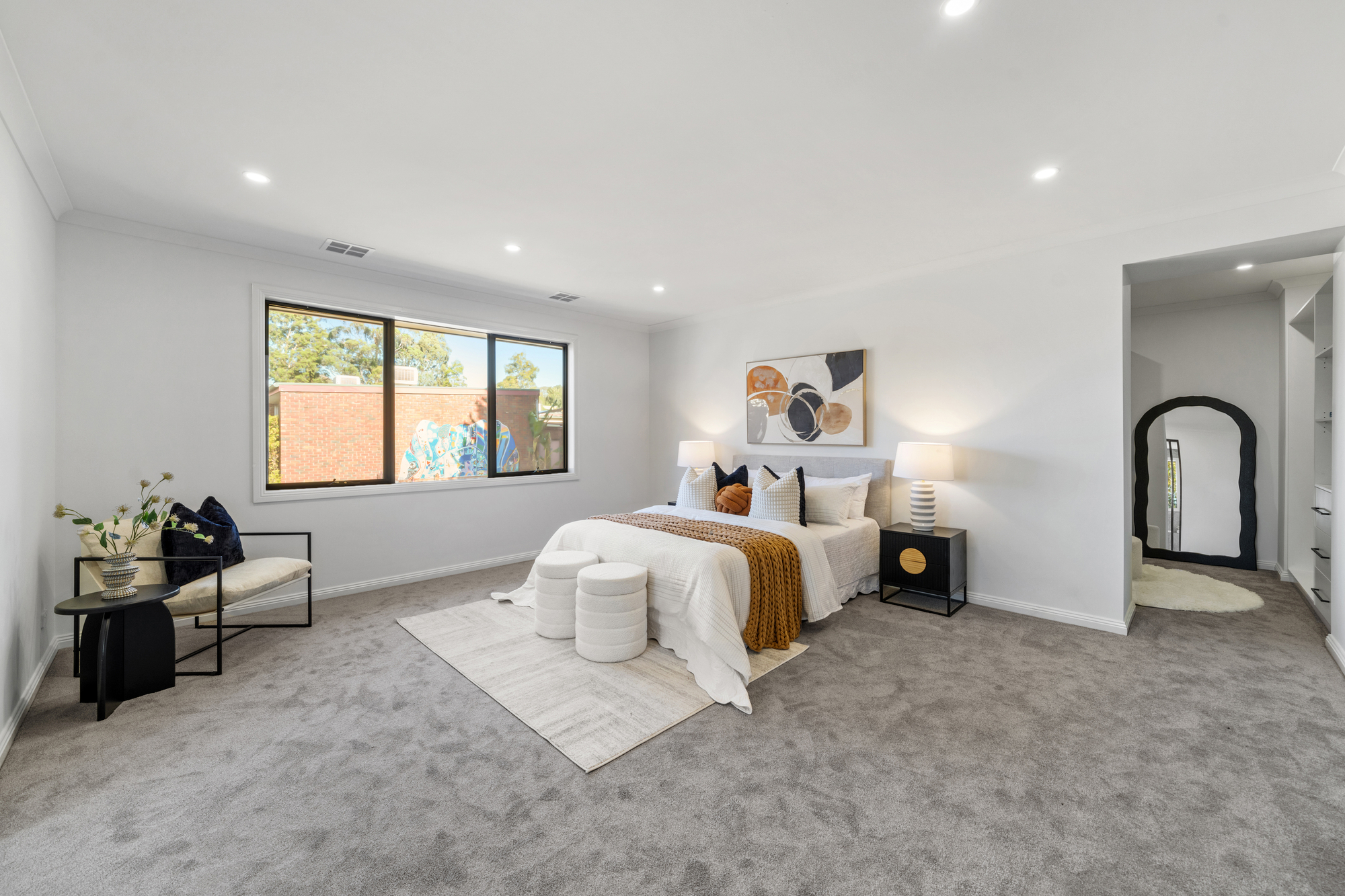 Accommodation is well considered across both levels, with five generously sized bedrooms all featuring walk-in robes. A guest bedroom on the ground floor includes a private ensuite, ideal for visitors or multigenerational living. The master suite is positioned as a luxurious retreat with its own ensuite, while an additional upstairs bedroom also enjoys ensuite access. Soft carpeting throughout the upper level enhances comfort, privacy, and a sense of understated luxury.