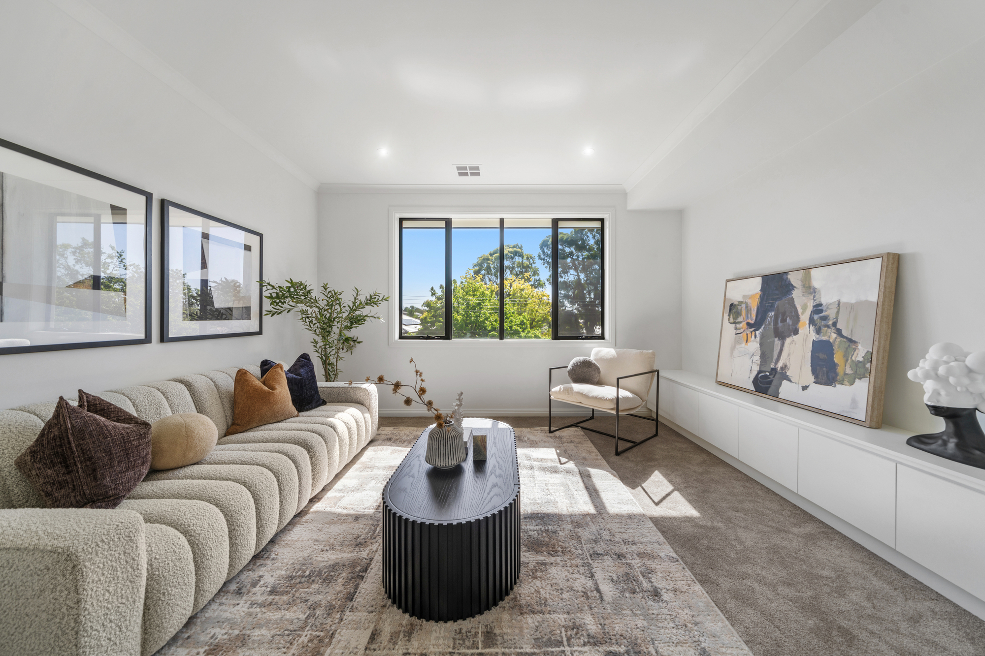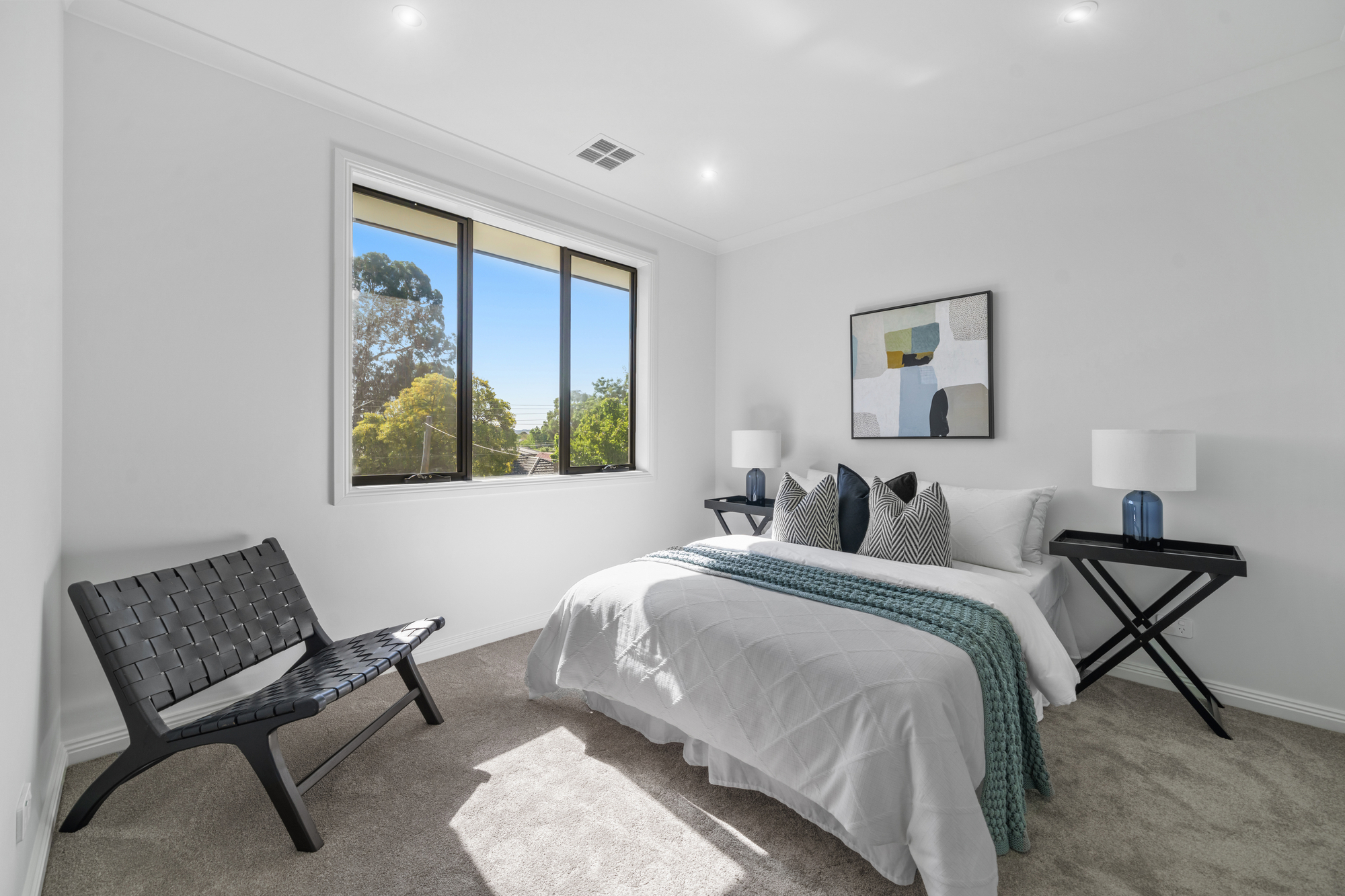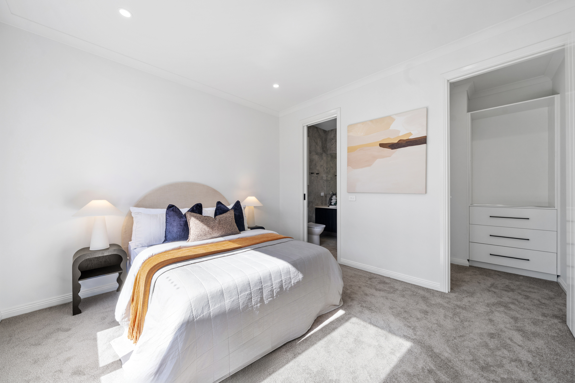 Accommodation is well considered across both levels, with five generously sized bedrooms all featuring walk-in robes. A guest bedroom on the ground floor includes a private ensuite, ideal for visitors or multigenerational living. The master suite is positioned as a luxurious retreat with its own ensuite, while an additional upstairs bedroom also enjoys ensuite access. Soft carpeting throughout the upper level enhances comfort, privacy, and a sense of understated luxury.