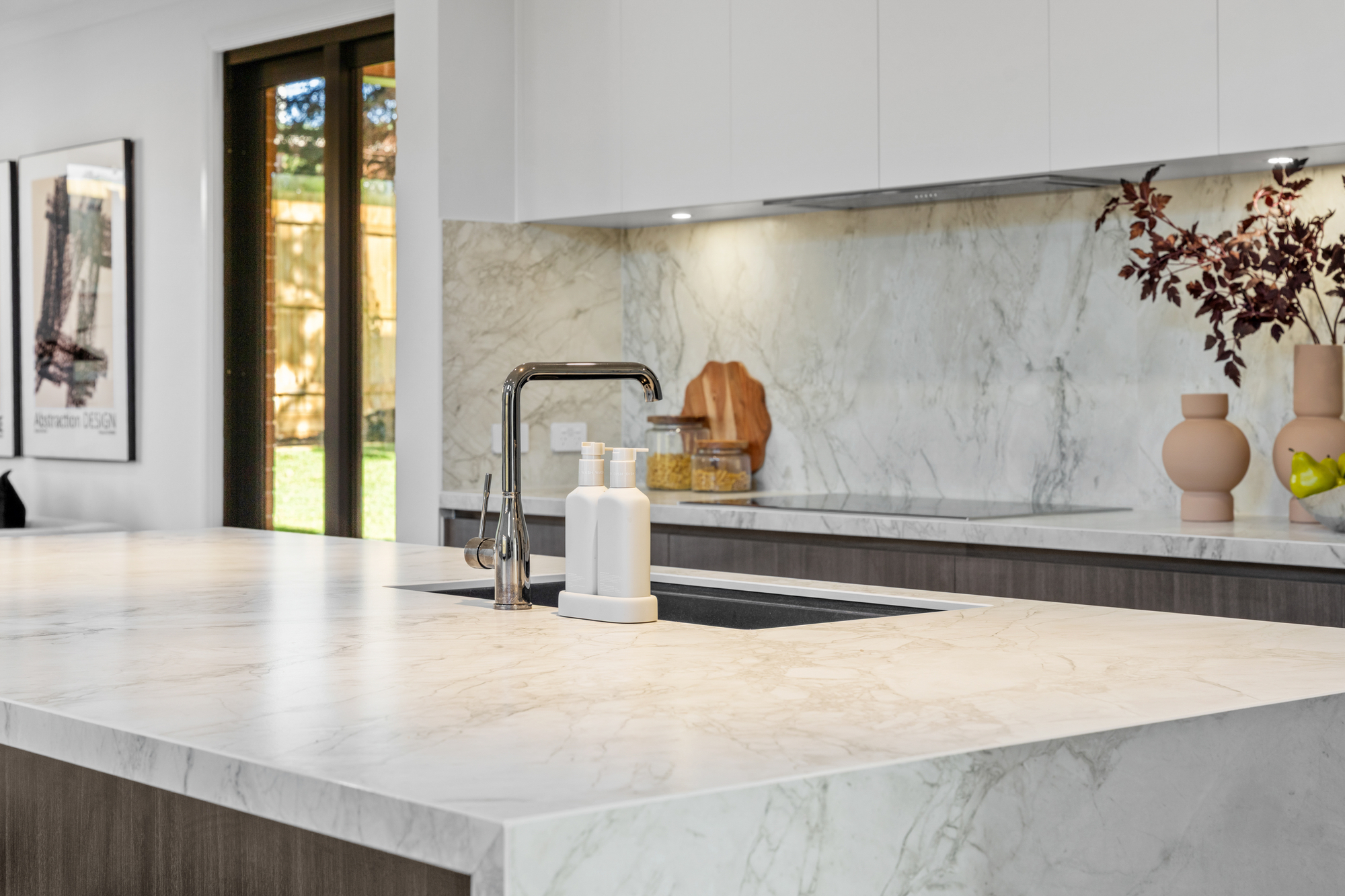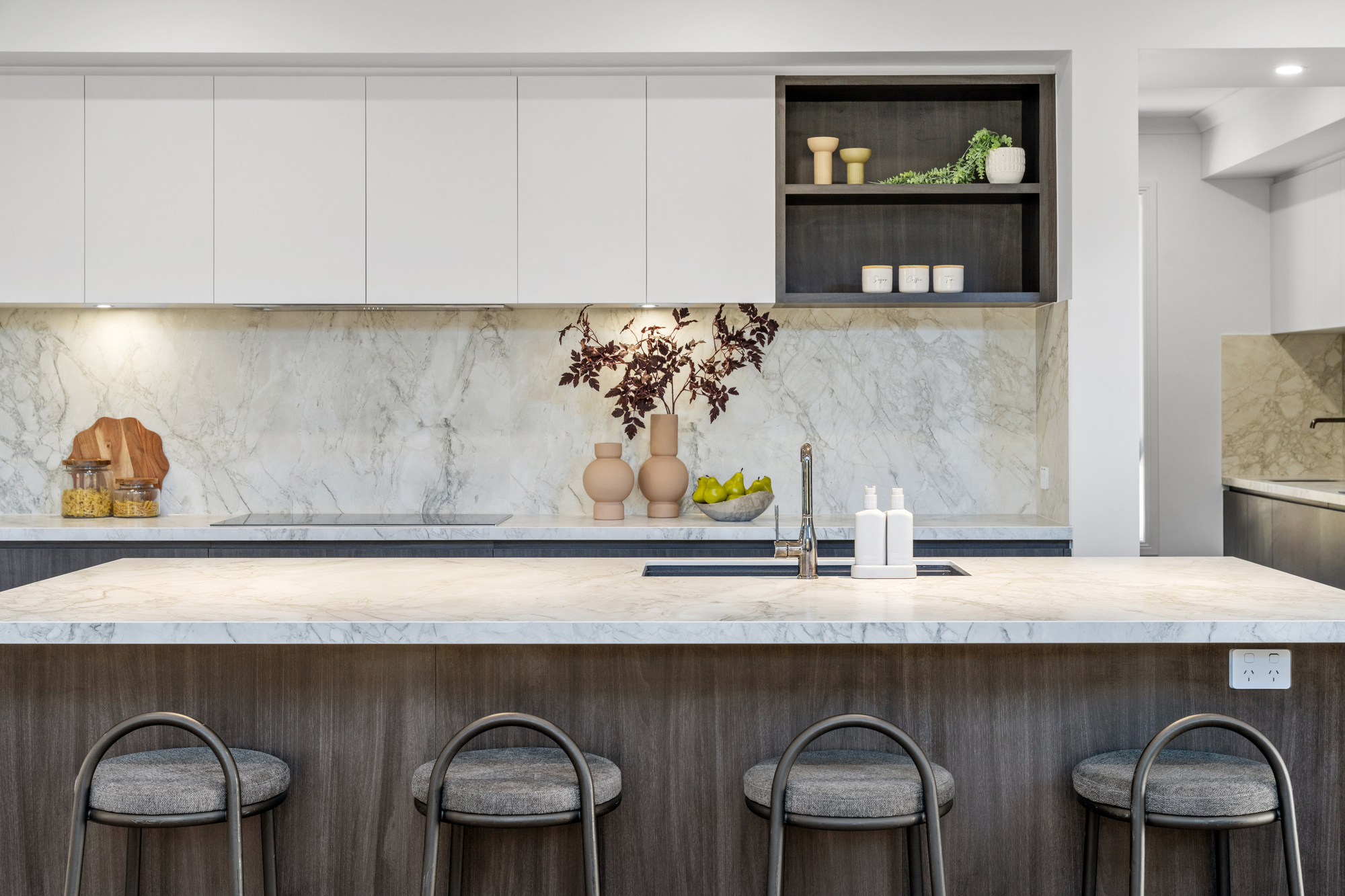 The kitchen is a standout luxury centrepiece, finished with marble benchtops and a full marble splashback, centred around an oversized waterfall island with breakfast seating. Sleek dark cabinetry is balanced by softer upper cabinetry, while premium Bosch appliances and dual electric cooktops cater effortlessly to larger households. A fully equipped butler’s kitchen with additional stove and sink provides exceptional preparation space and keeps the main kitchen pristine.