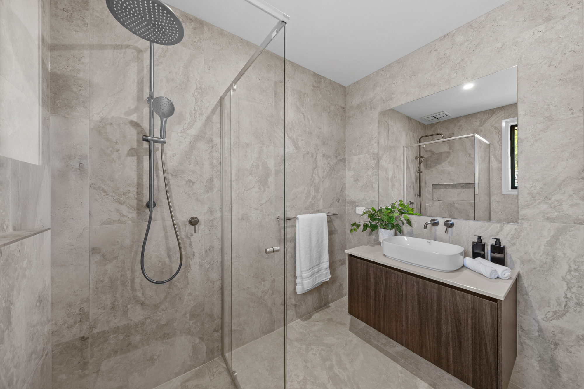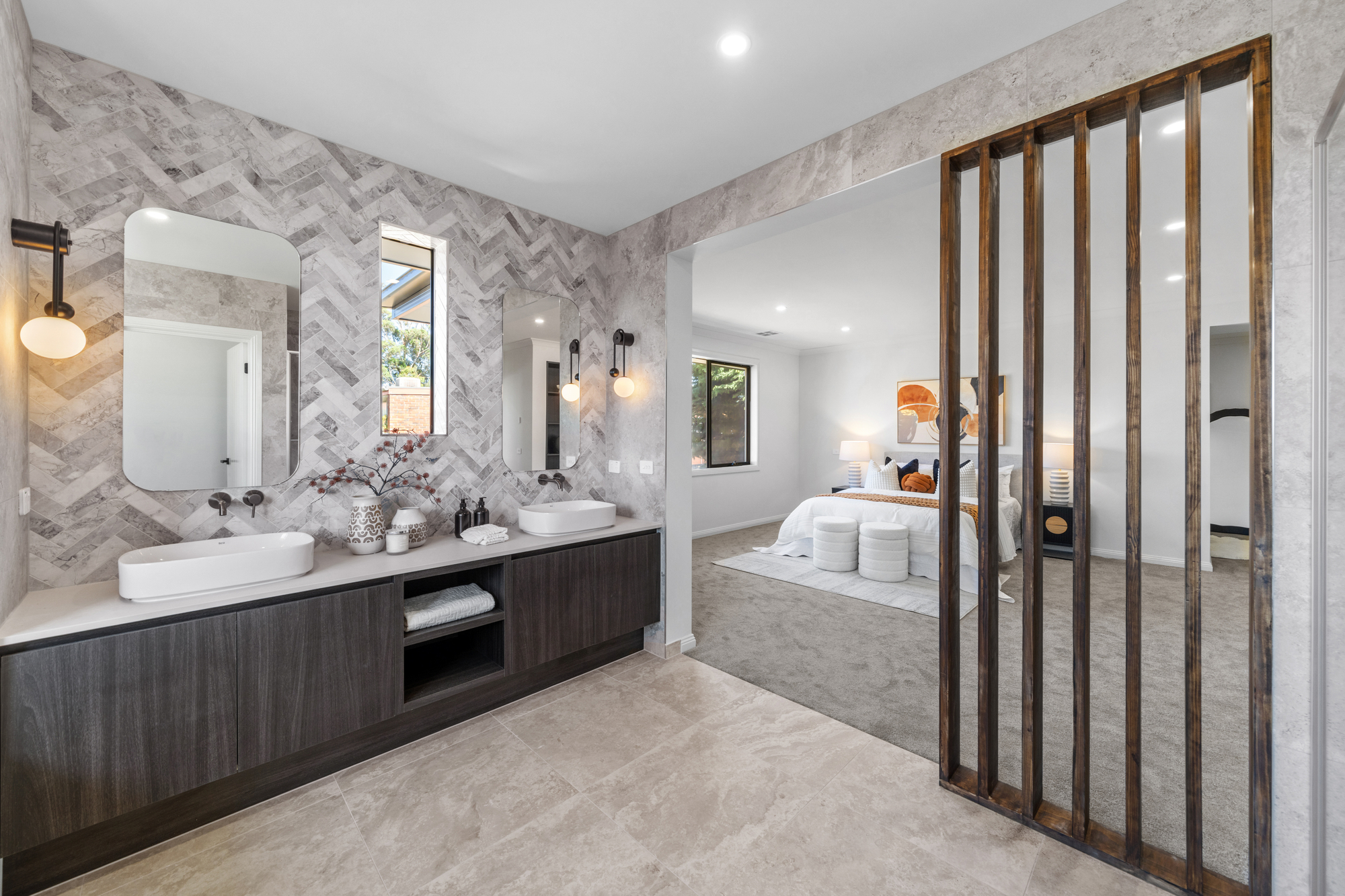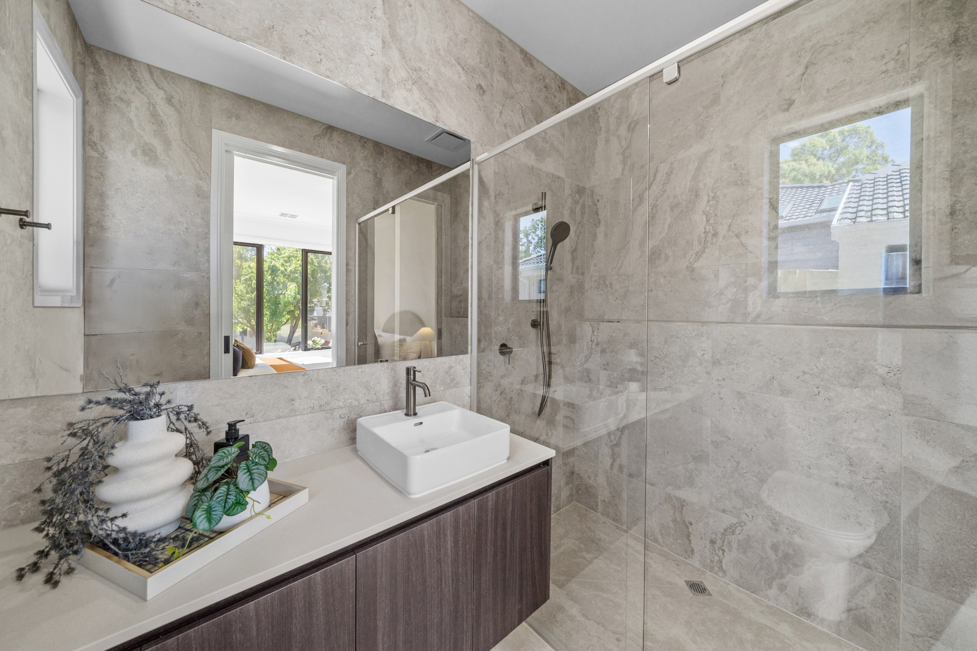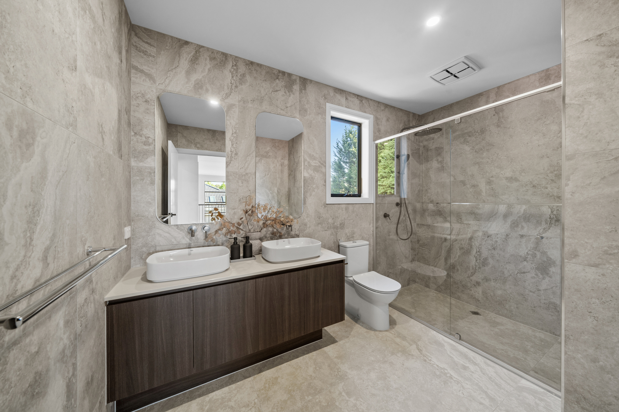 Bathrooms are finished to an exceptional standard, with full-height luxury stone-look tiling, premium tiles and designer tapware, frameless glass showers with black fixtures, statement vanities with vessel basins, and modern lighting. The main bathroom includes a built-in bathtub beneath a wide window, while the primary ensuite features a double vanity ideal for busy family life.