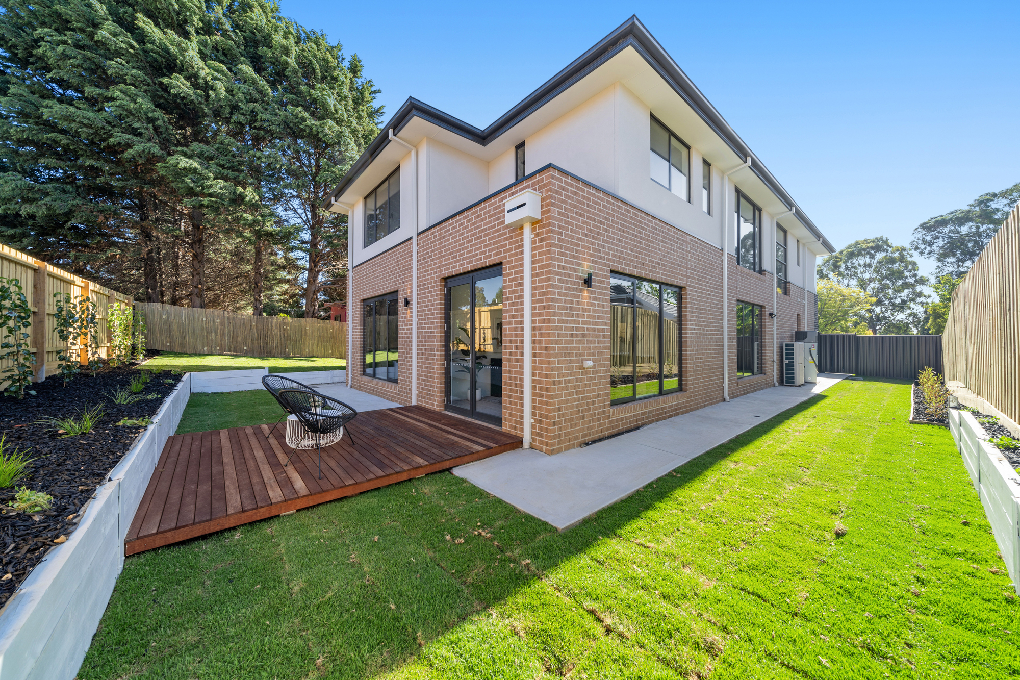 Outdoor entertaining is equally impressive, featuring a covered timber deck designed for year-round use with direct connection from the main living area. Multiple outdoor zones include open decking, sheltered alfresco dining, and lawn areas, all framed by landscaped gardens, tiered beds, and fresh fencing for privacy. The low-maintenance design is ideal for family gatherings, BBQs, and relaxed outdoor living. Additional features include a security alarm system, a Fujitsu high static central reverse-cycle heating and cooling system, and the inclusion of refrigerators, a dryer, and a 9kg washing machine.